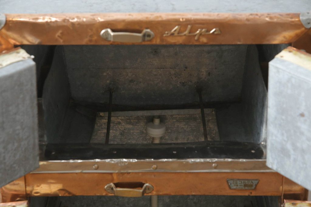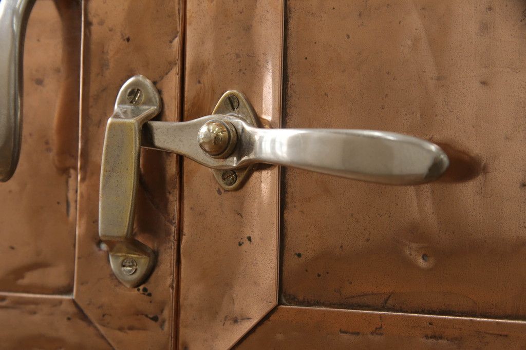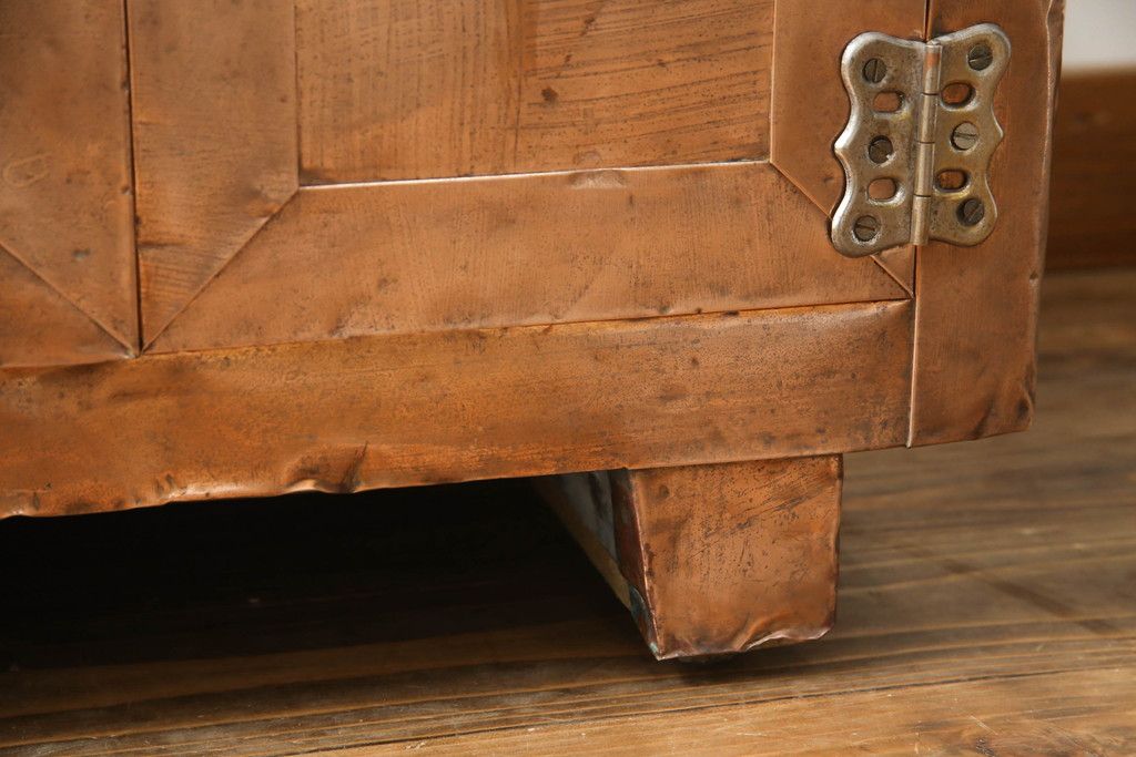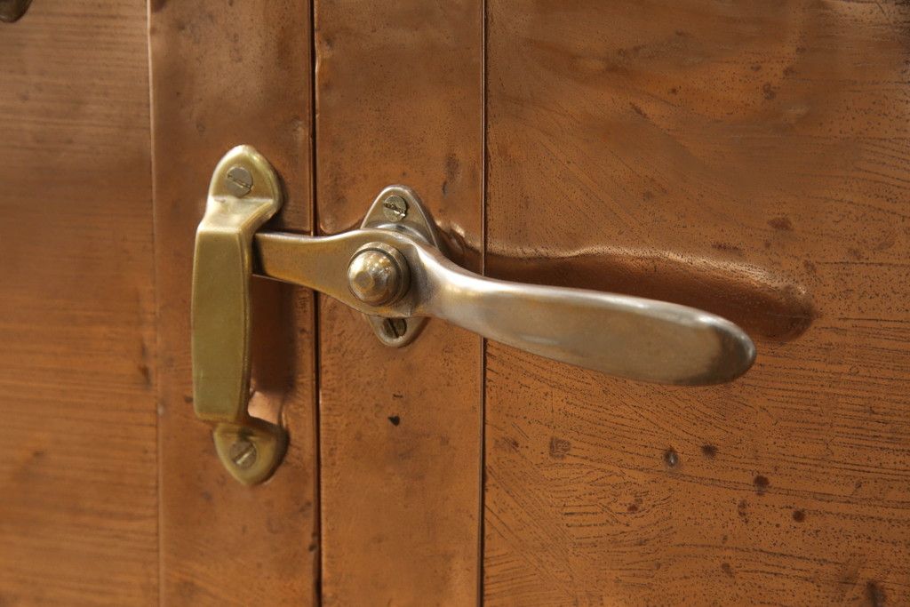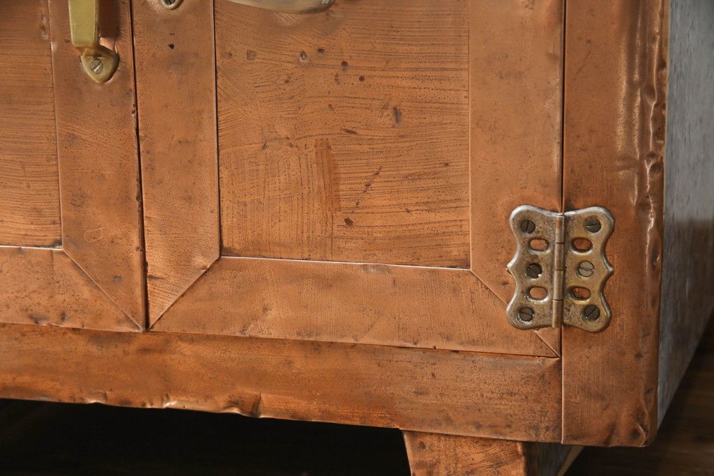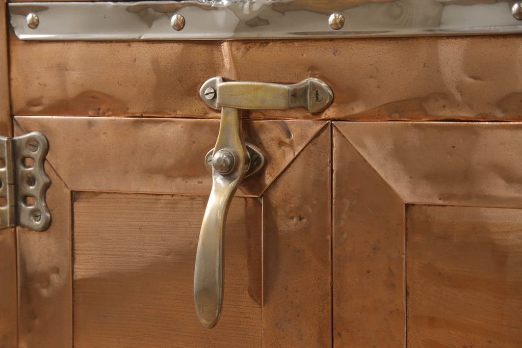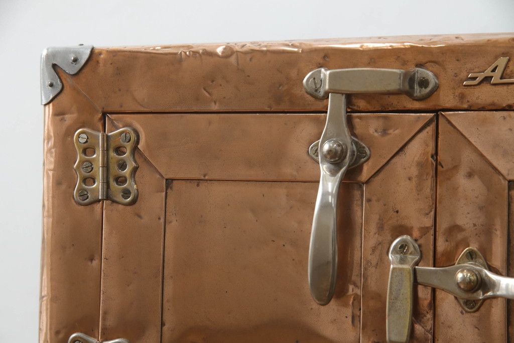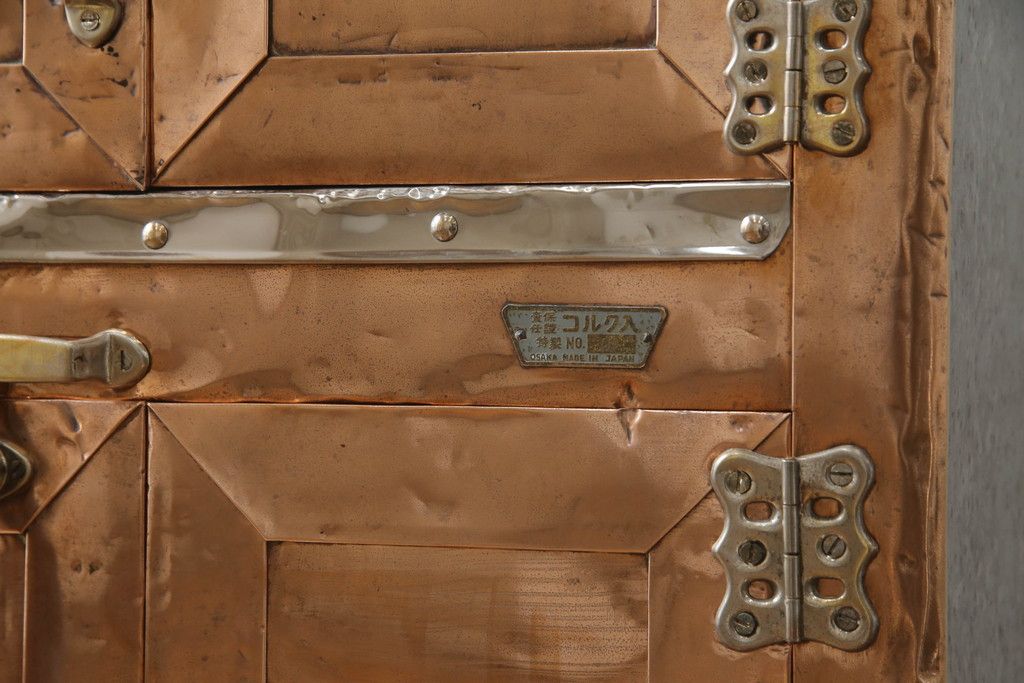 冷蔵庫を綺麗に再生!前面部分の銅を磨き、ヒバ材ですのこを製作。上段には底板・下段には棚板として設置。
