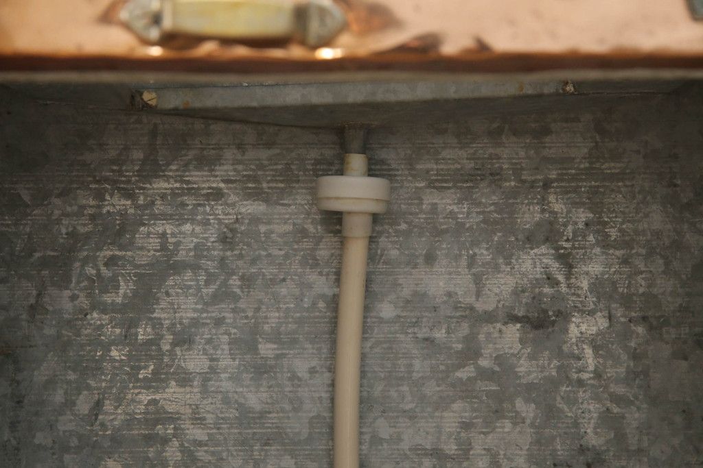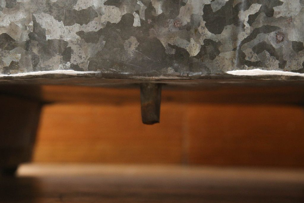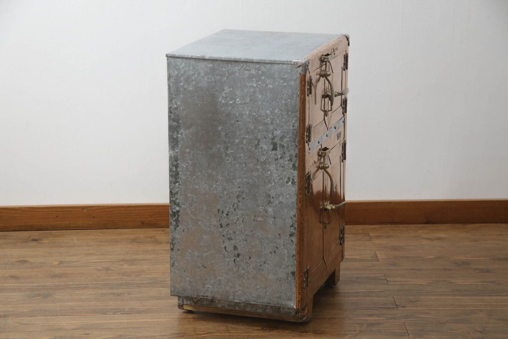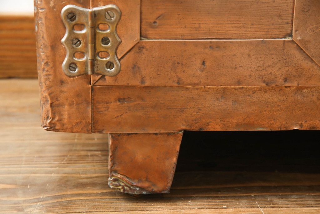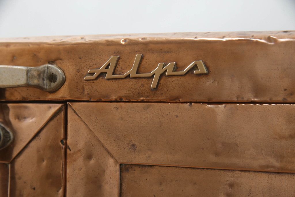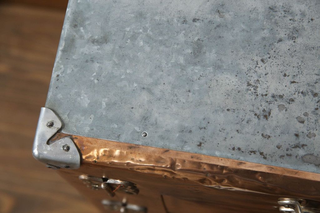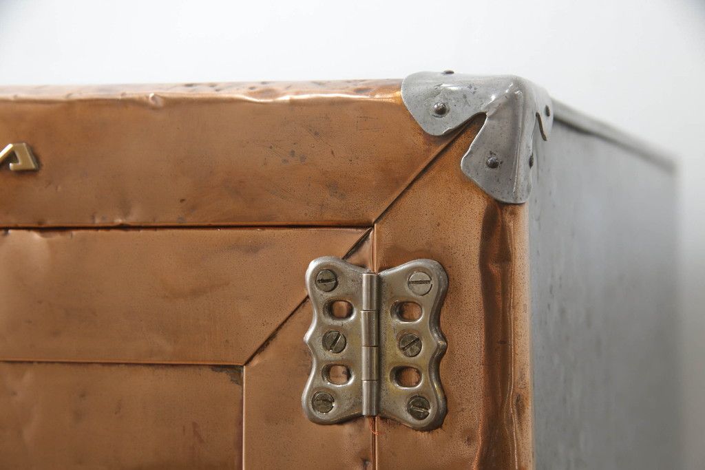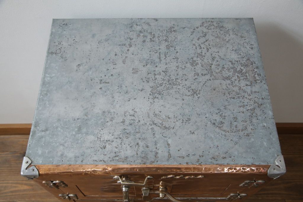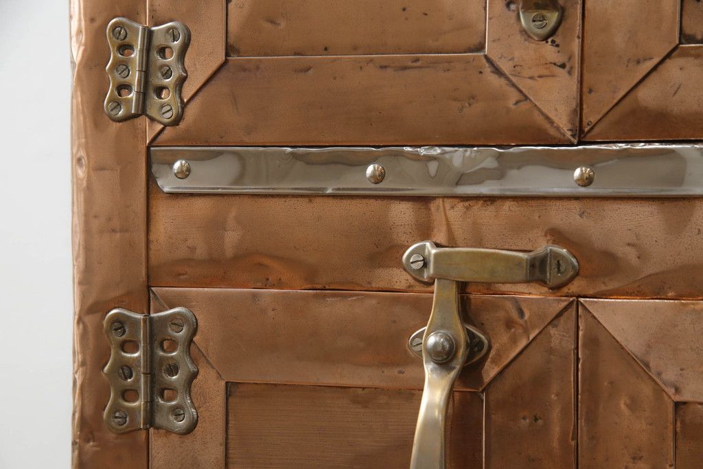 冷蔵庫を綺麗に再生!前面部分の銅を磨き、ヒバ材ですのこを製作。上段には底板・下段には棚板として設置。