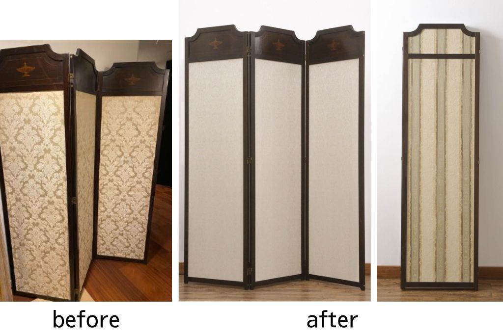 衝立てを綺麗に再生!指定の生地で表裏それぞれ張り替え。木製部分は元の色味をベースに仕上げ。