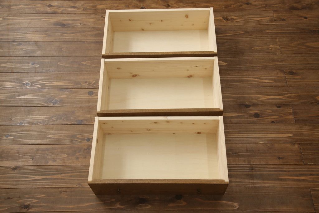 ワードローブを姿見とリビングボードにリメイク!左扉の鏡は背面に壁掛け用の金具とチェーンを取り付け、姿見に。本体は高さと奥行を詰め、左に引き出し・右に棚板を設置。脚付きリビングボードに。2点とも元の色味をベースに、着色して仕上げ。