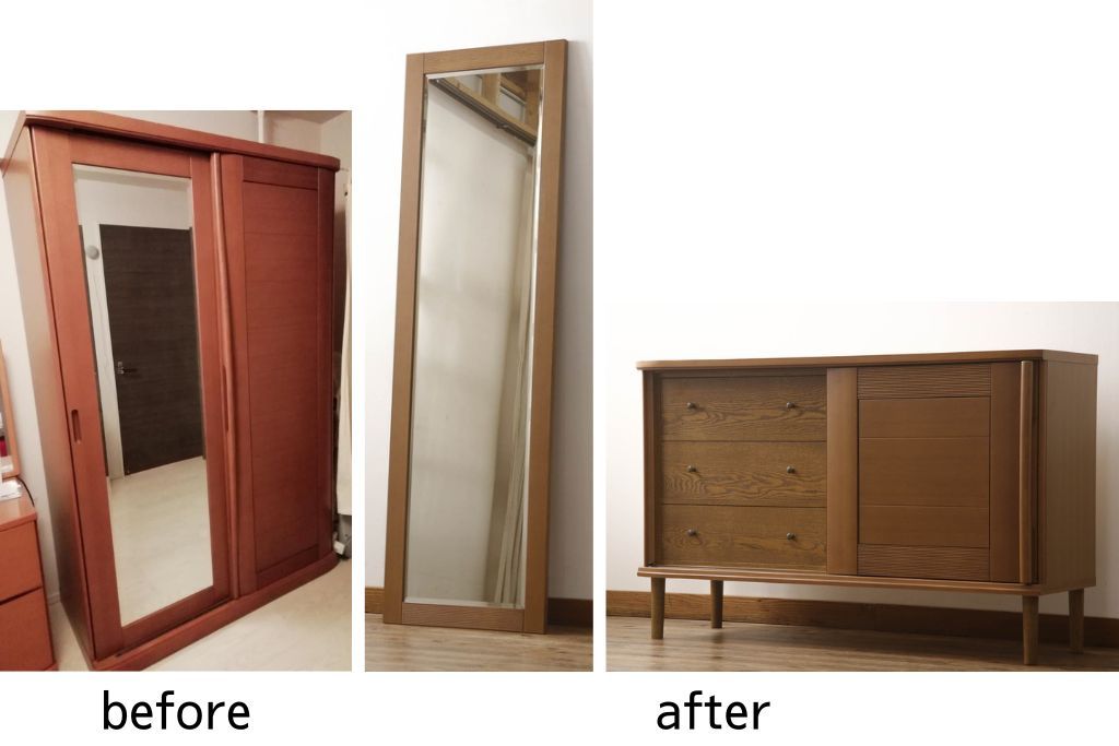 お客様持ち込みの洋箪笥を姿見とリビングボードへリメイク