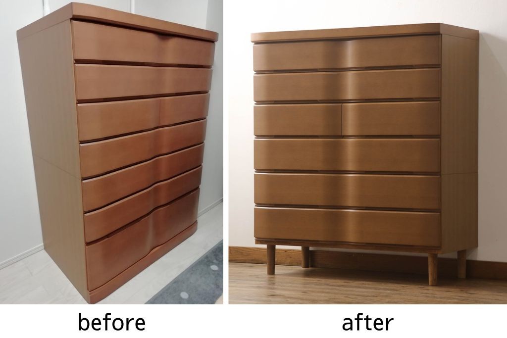 洋タンスをコンパクトにリメイク!最下段の引き出しをカットし、高さと奥行詰め。脚を新たに取り付け、元のお色をベースに着色して仕上げ。