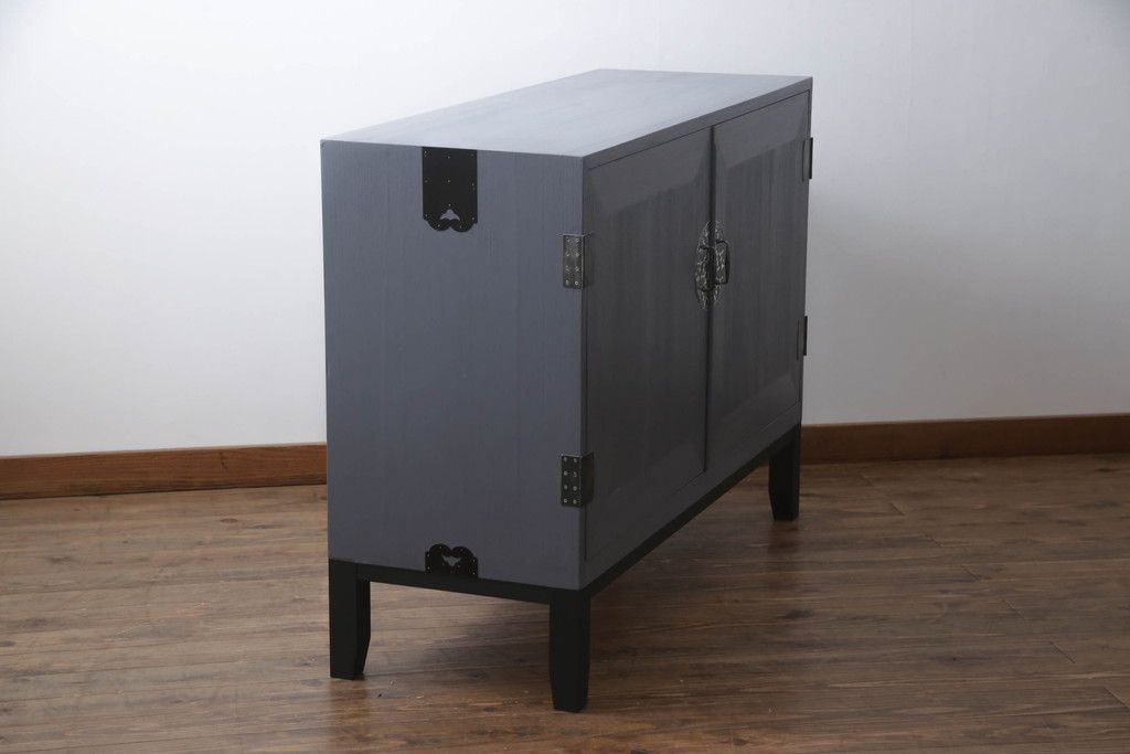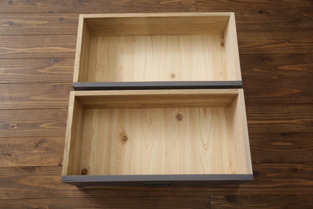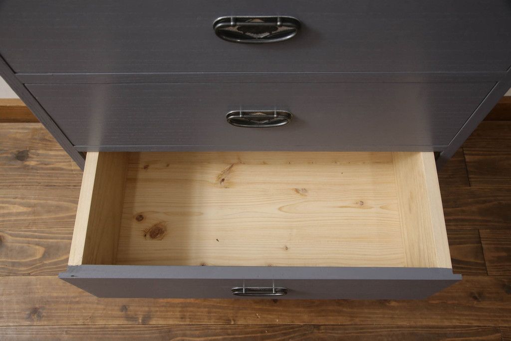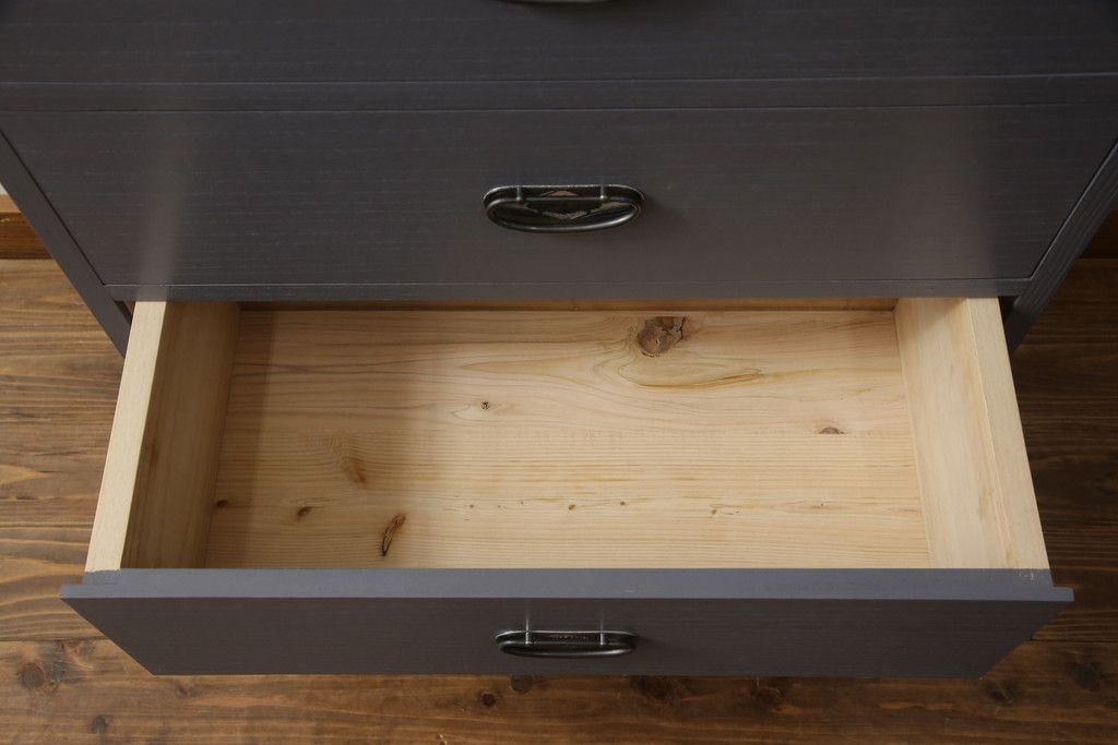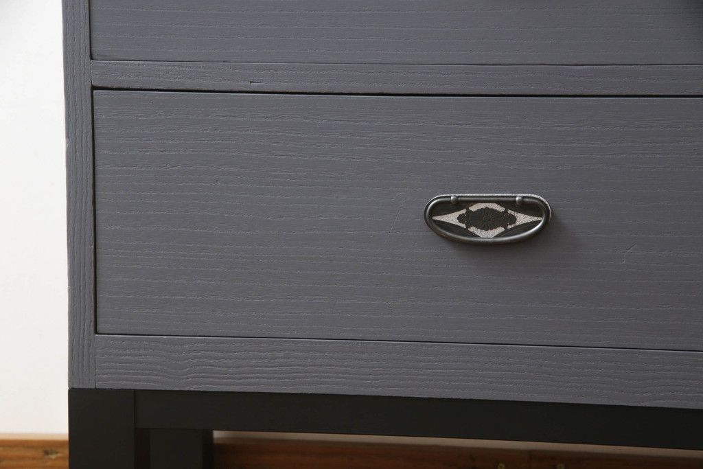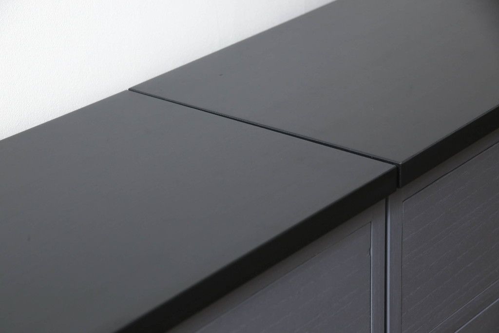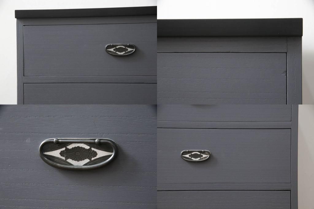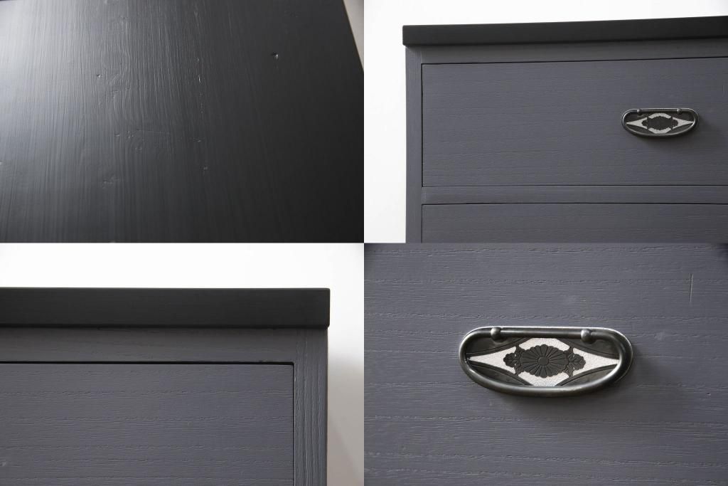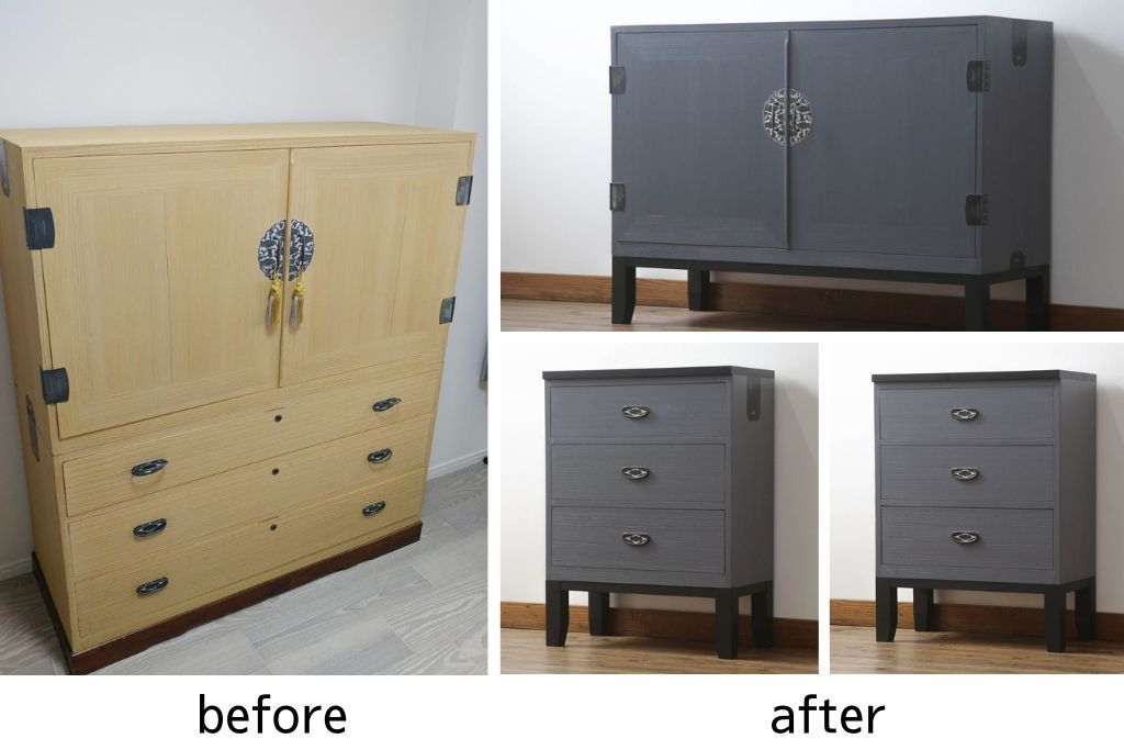 重ね桐箪笥をサイドボードとチェストにリメイク!上段は衣装盆・棚受けを取り外し、棚板を取り付けて脚付きサイドボードに。下段は引き出しを中央から分割し、奥行きを詰めて脚付チェスト2台に。3台ともダークグレー/マットブラックでペイント。