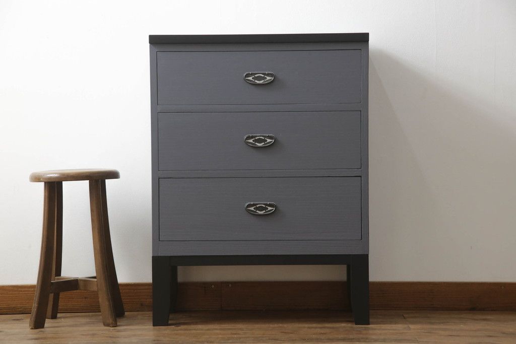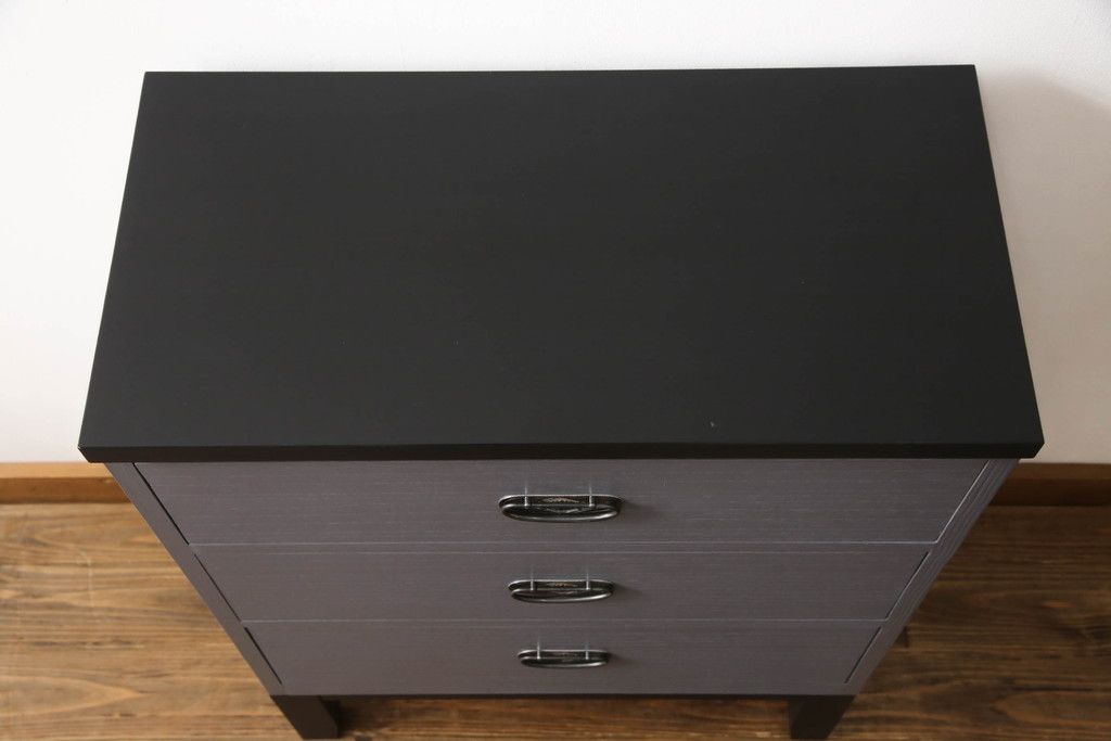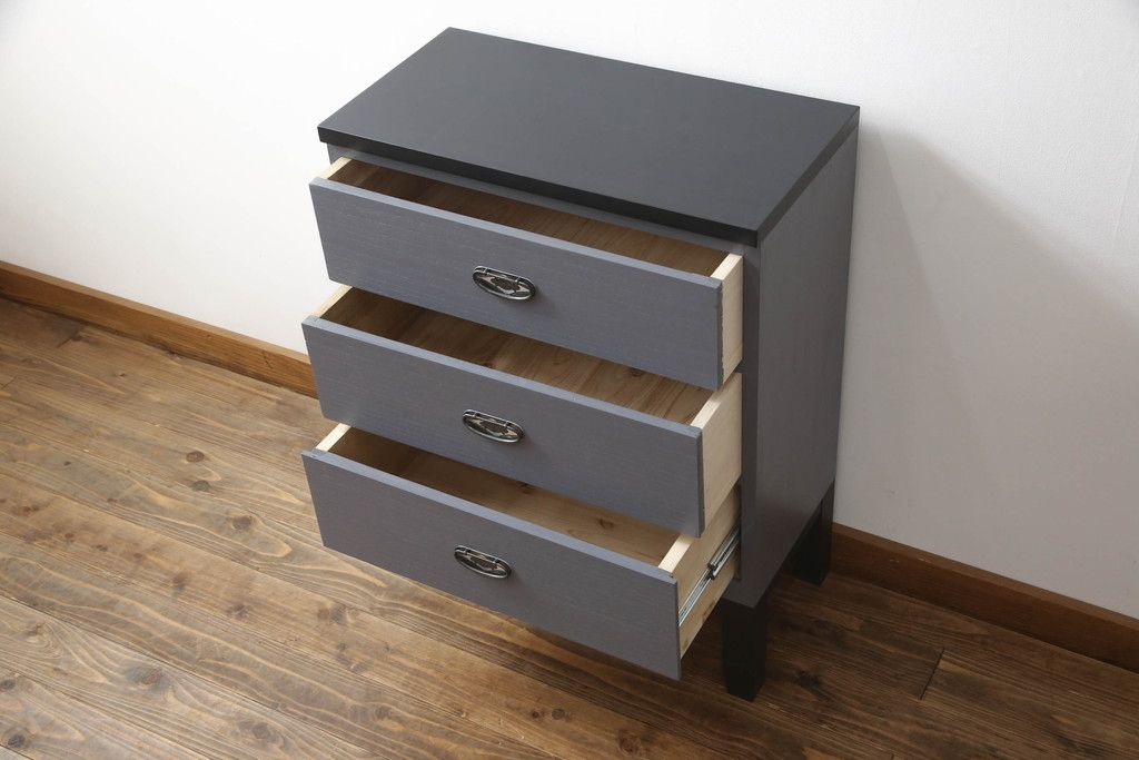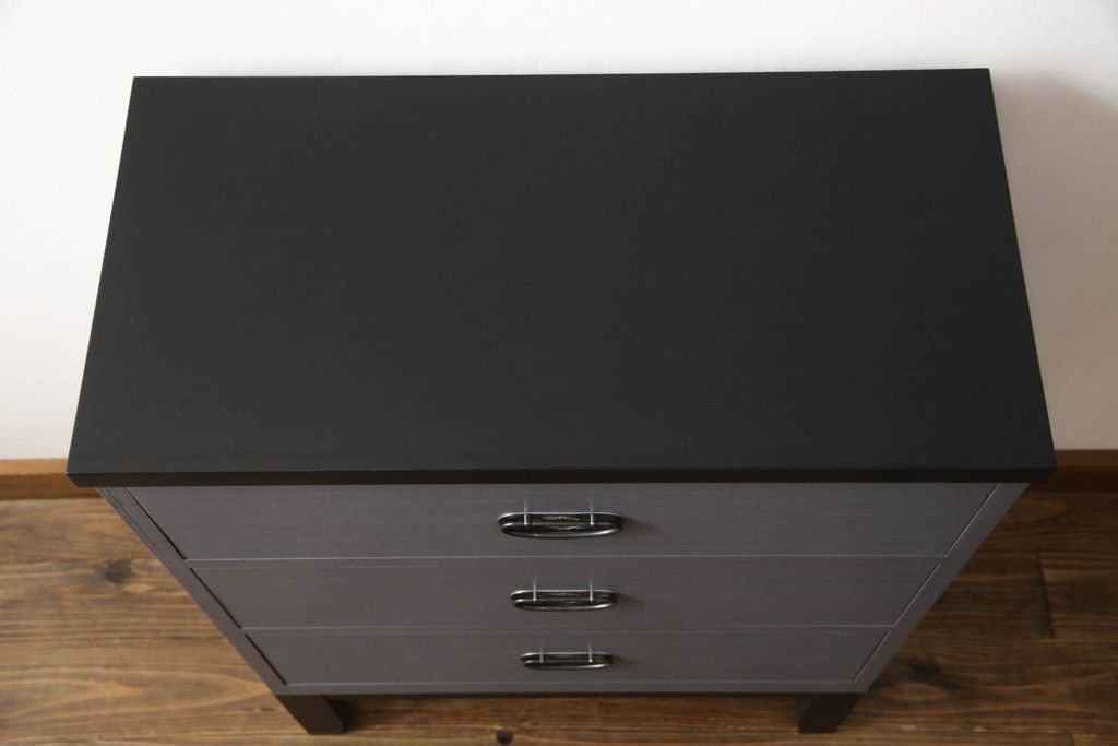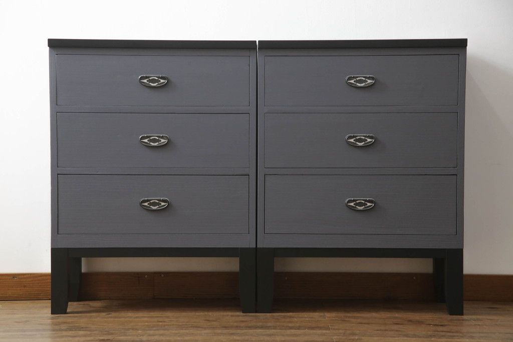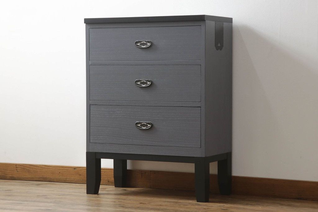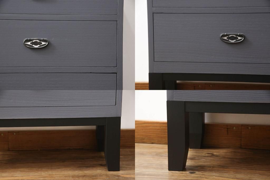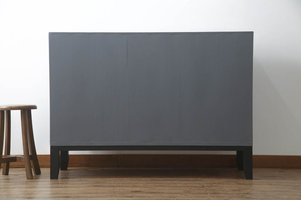重ね桐箪笥をサイドボードとチェストにリメイク!上段は衣装盆・棚受けを取り外し、棚板を取り付けて脚付きサイドボードに。下段は引き出しを中央から分割し、奥行きを詰めて脚付チェスト2台に。3台ともダークグレー/マットブラックでペイント。