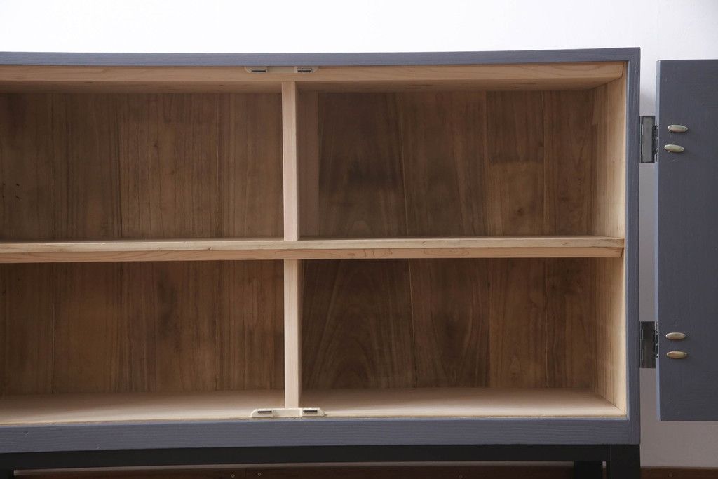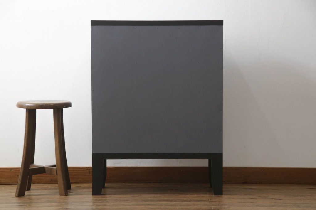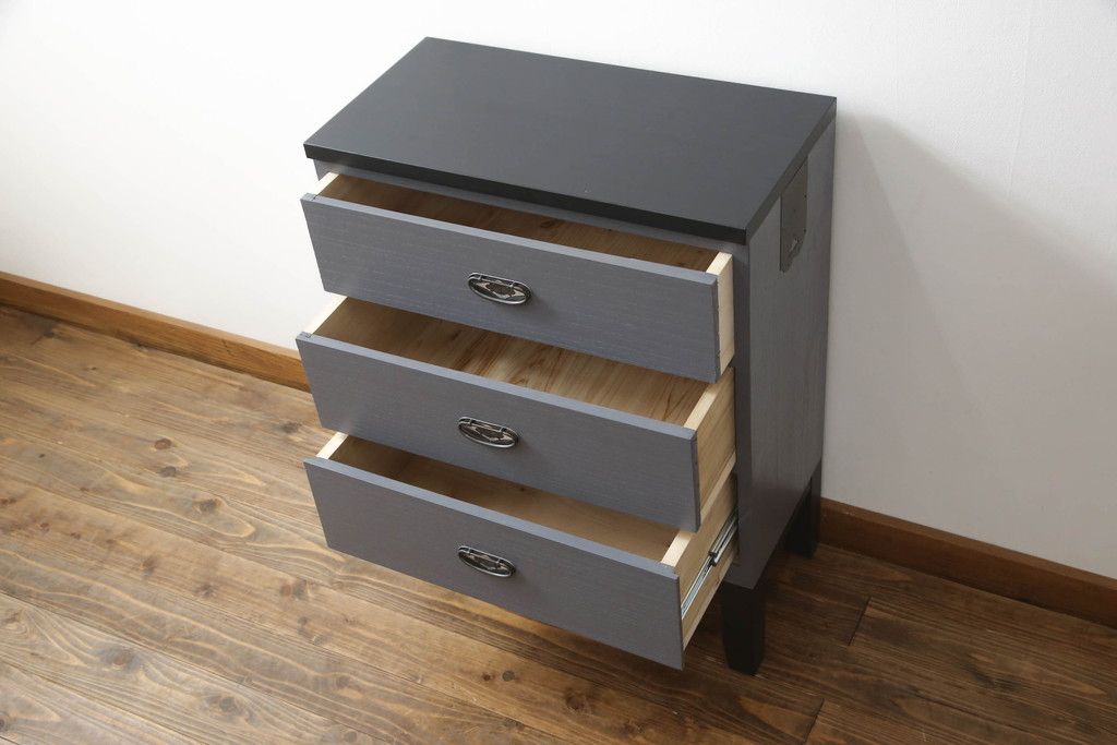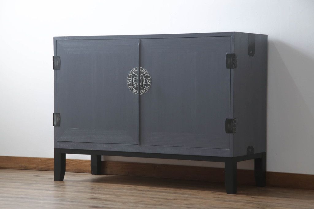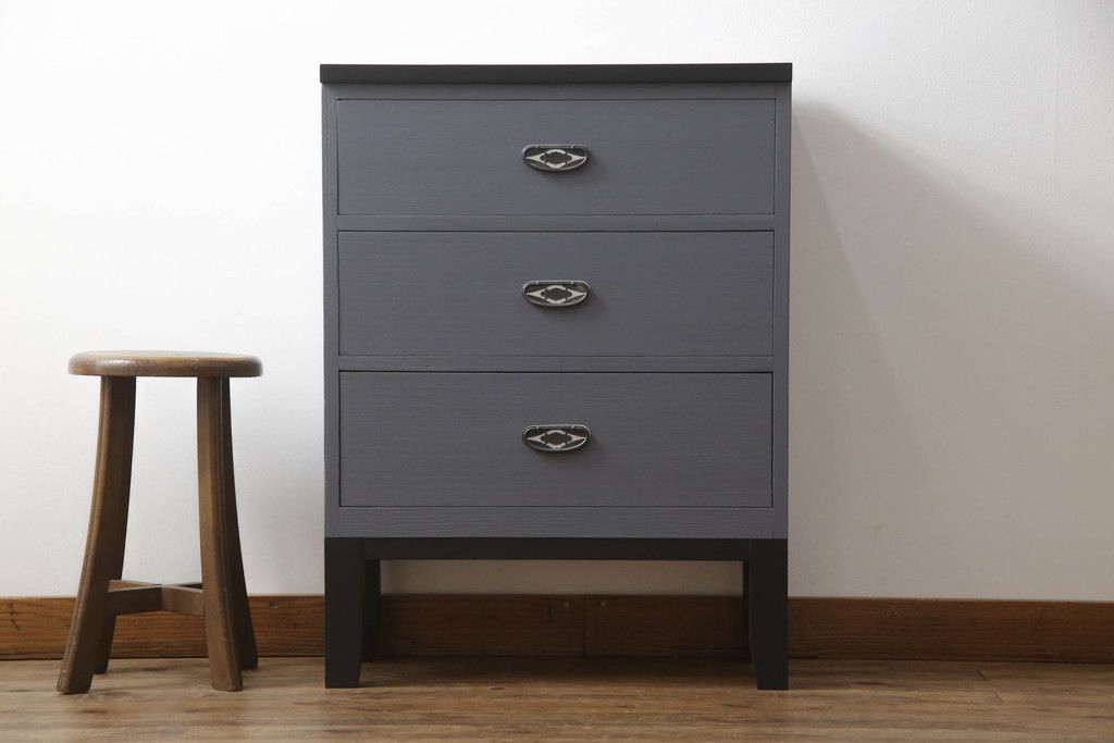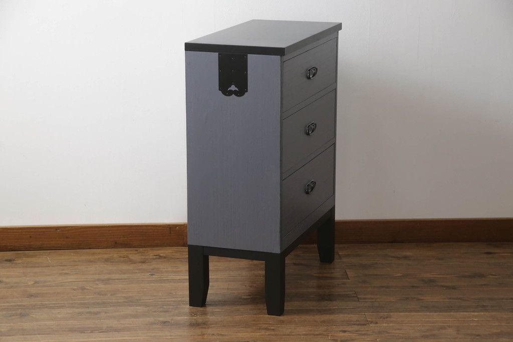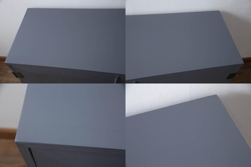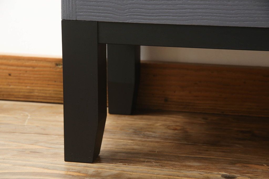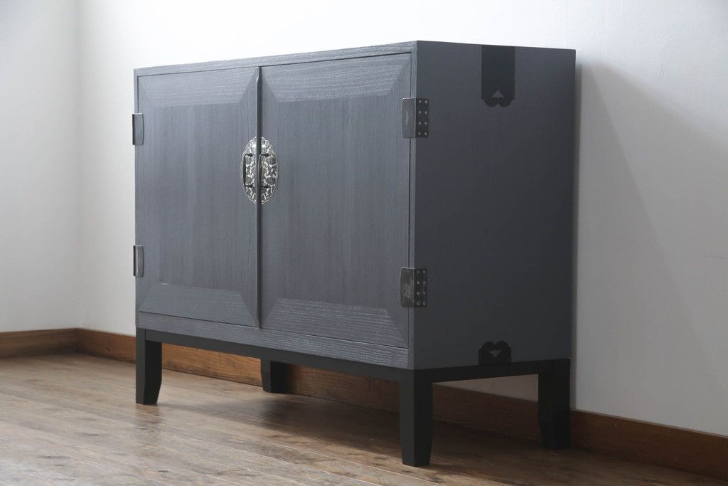 重ね桐箪笥をサイドボードとチェストにリメイク!上段は衣装盆・棚受けを取り外し、棚板を取り付けて脚付きサイドボードに。下段は引き出しを中央から分割し、奥行きを詰めて脚付チェスト2台に。3台ともダークグレー/マットブラックでペイント。
