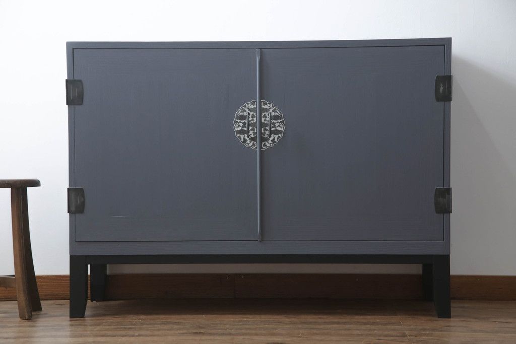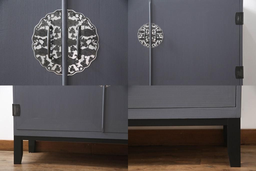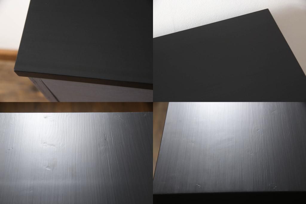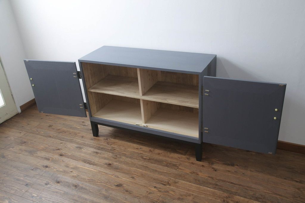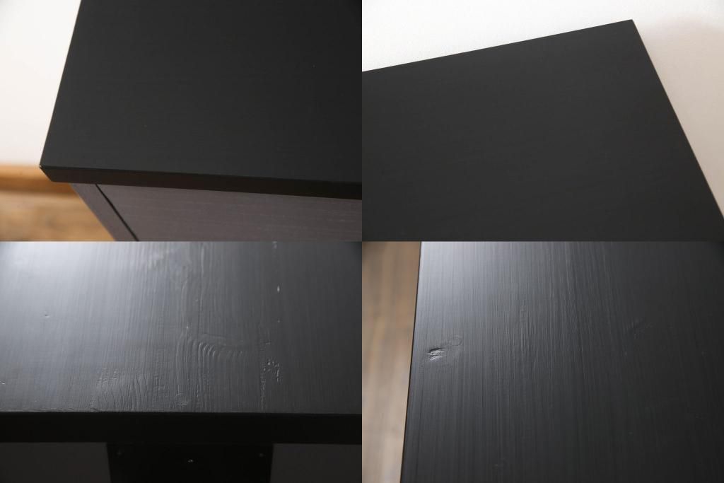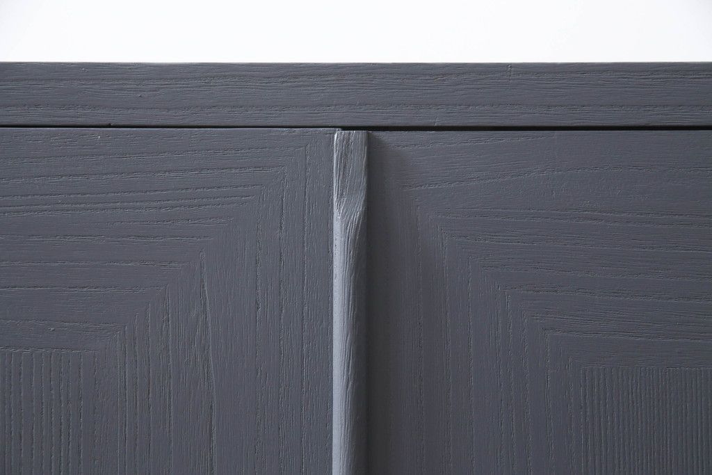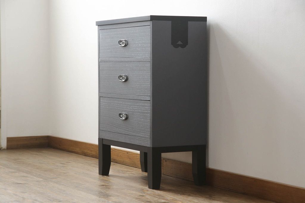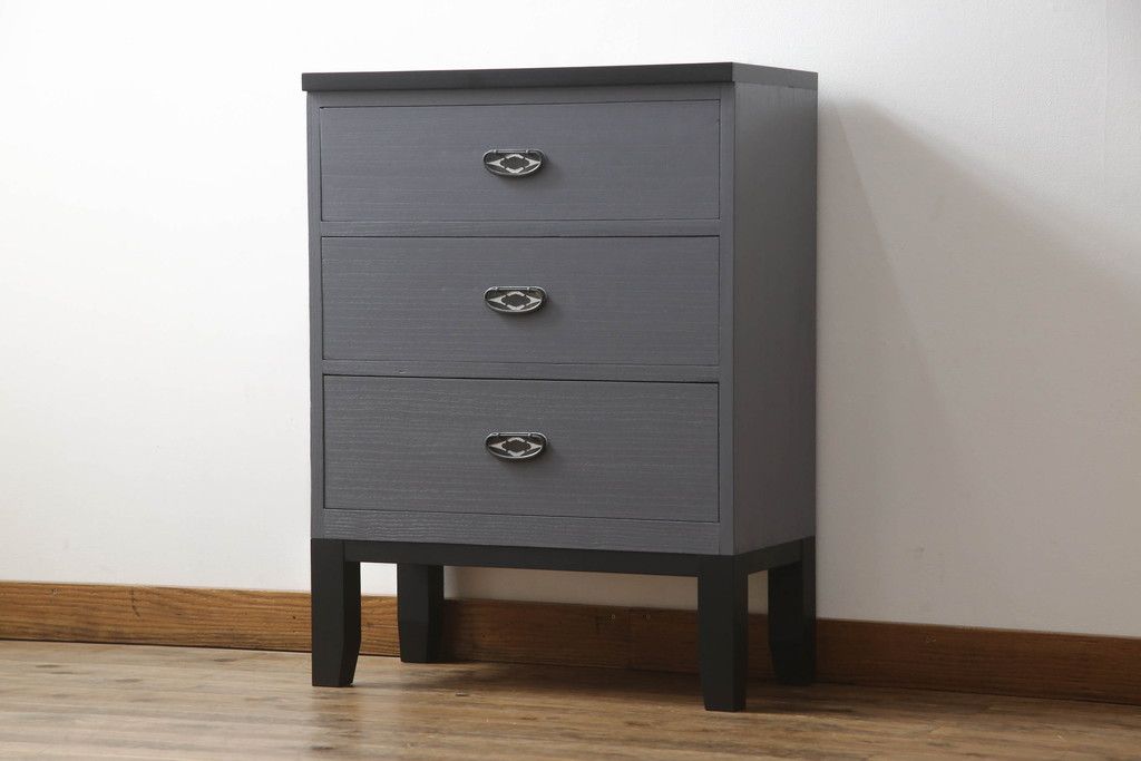 重ね桐箪笥をサイドボードとチェストにリメイク!上段は衣装盆・棚受けを取り外し、棚板を取り付けて脚付きサイドボードに。下段は引き出しを中央から分割し、奥行きを詰めて脚付チェスト2台に。3台ともダークグレー/マットブラックでペイント。