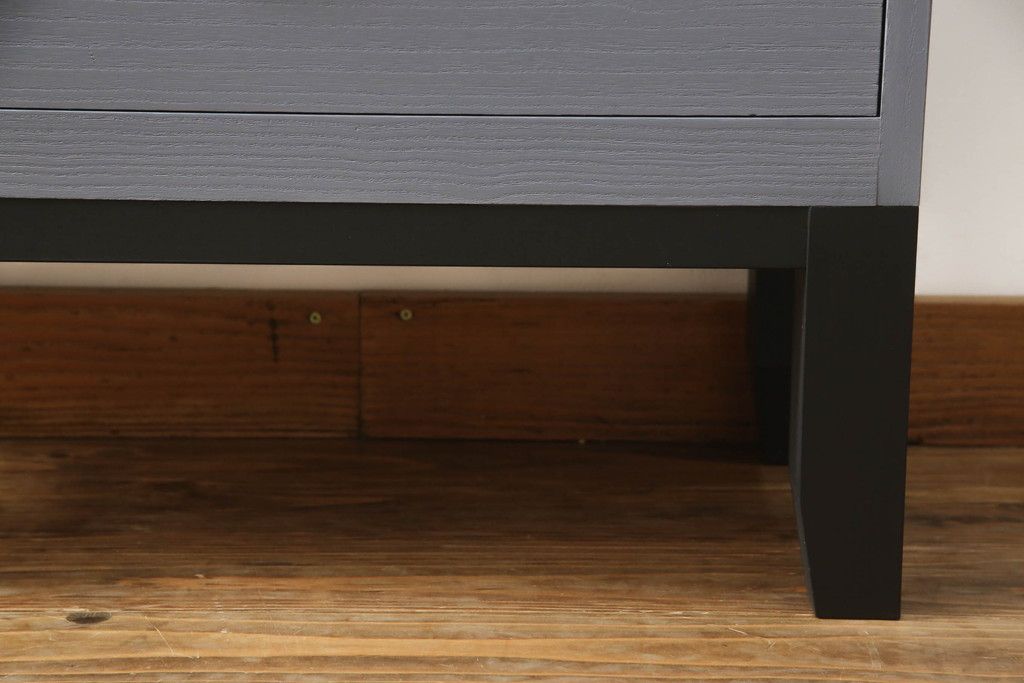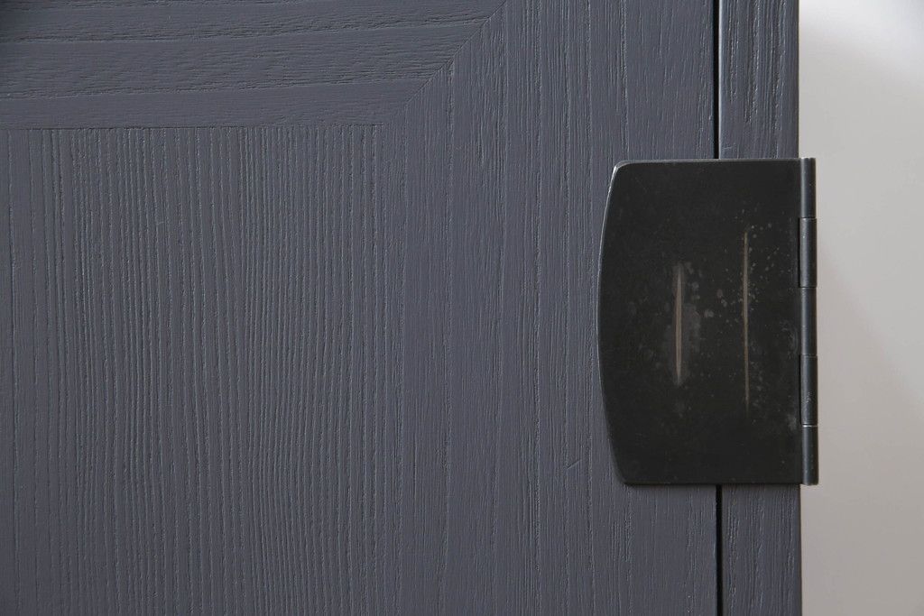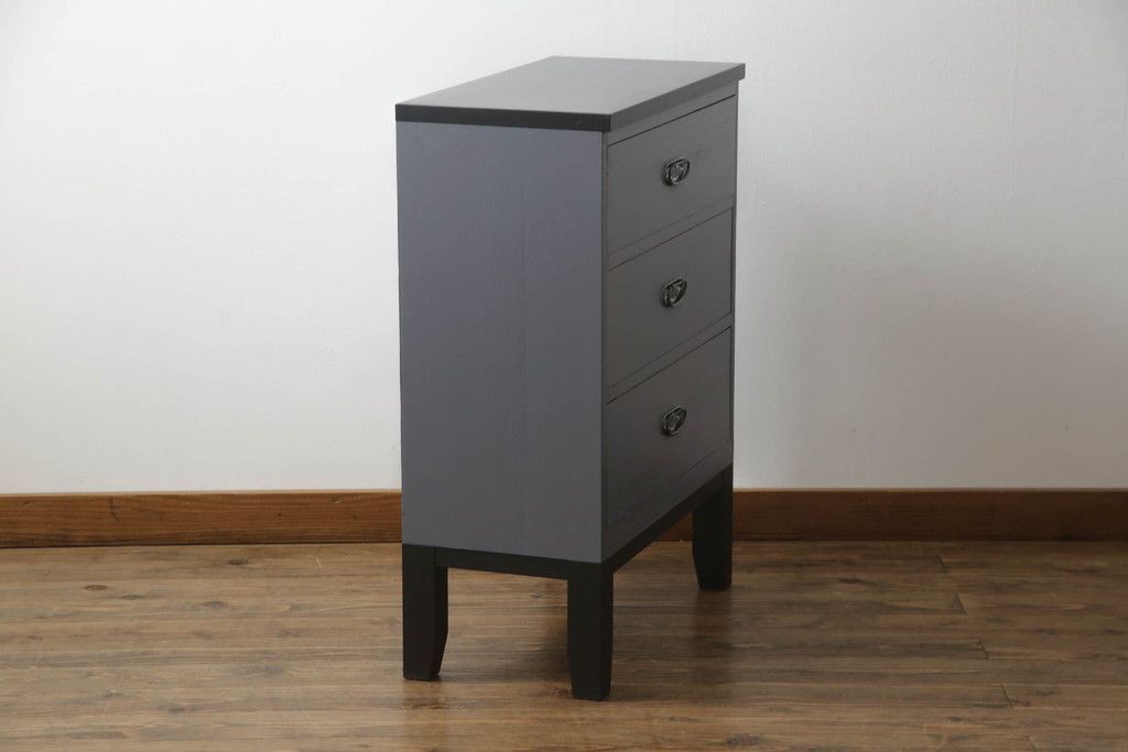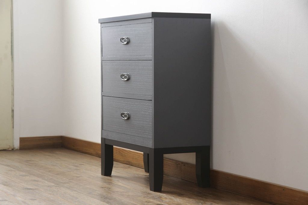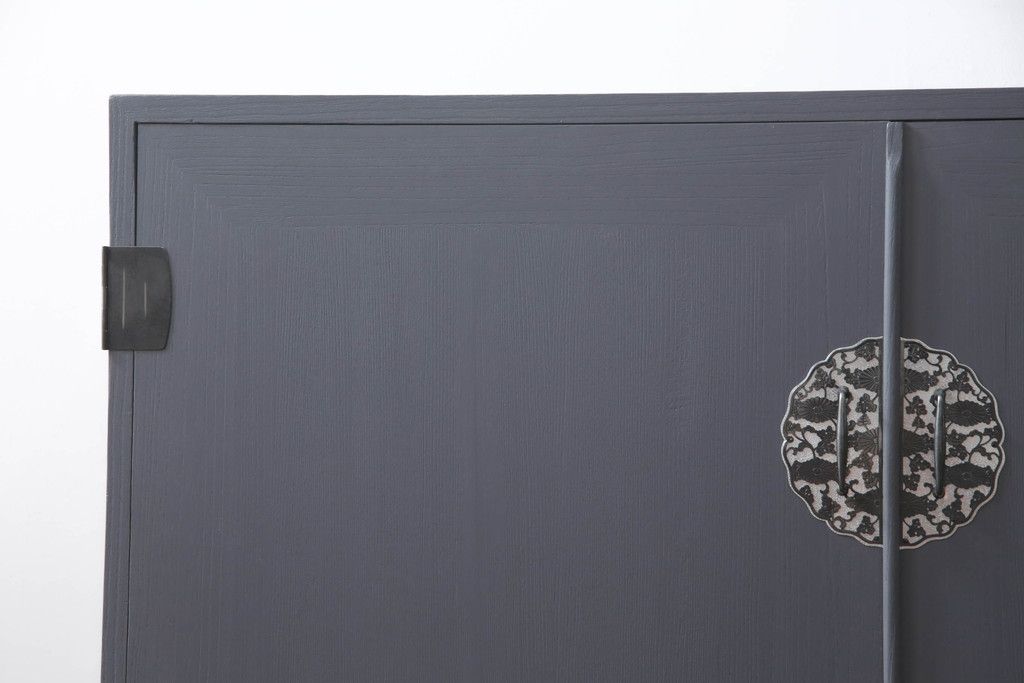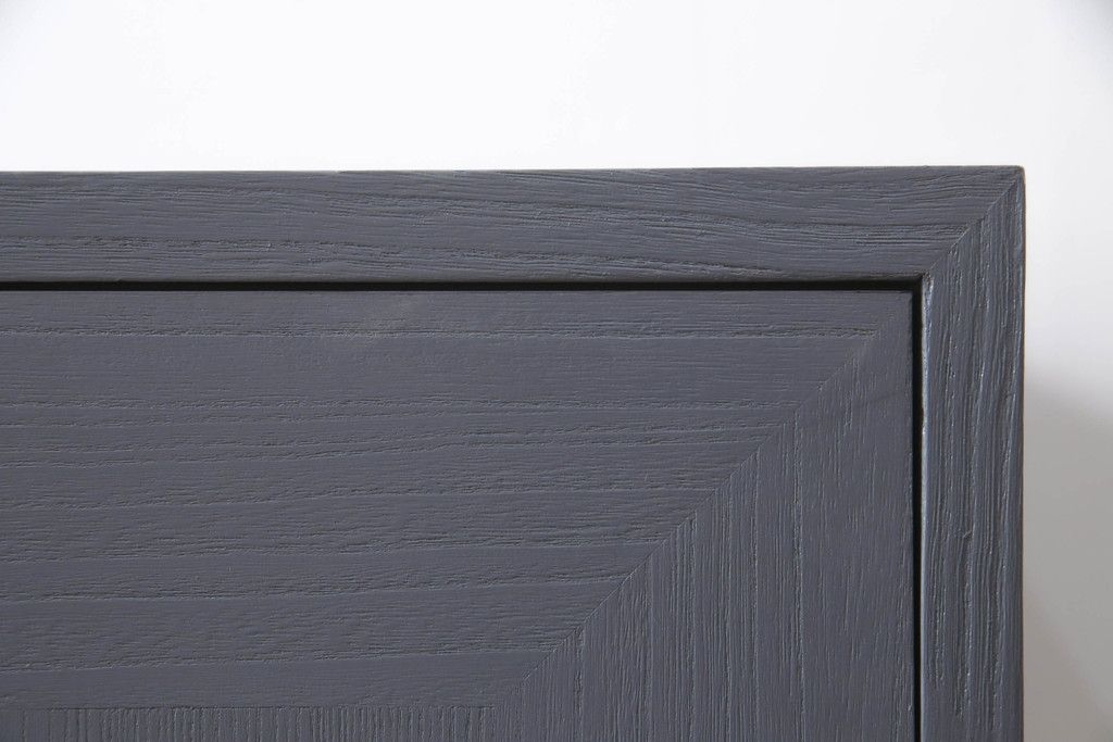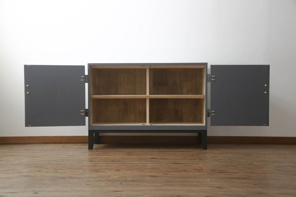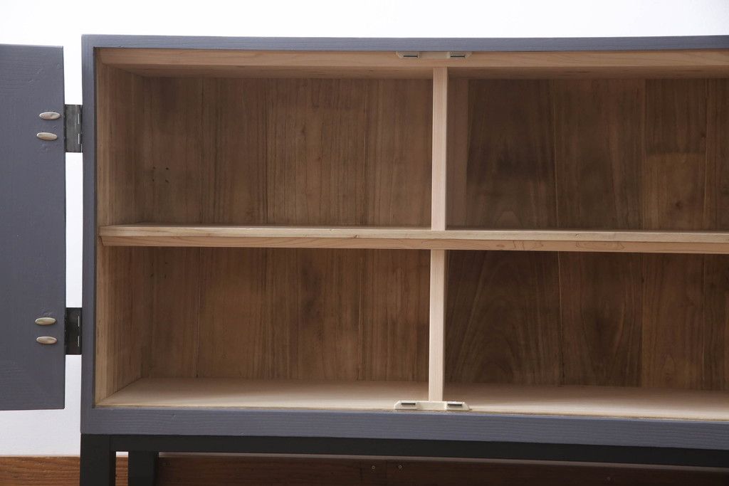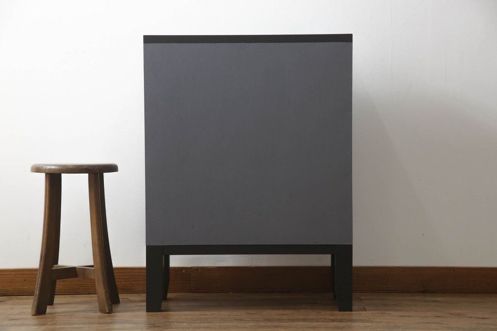 重ね桐箪笥をサイドボードとチェストにリメイク!上段は衣装盆・棚受けを取り外し、棚板を取り付けて脚付きサイドボードに。下段は引き出しを中央から分割し、奥行きを詰めて脚付チェスト2台に。3台ともダークグレー/マットブラックでペイント。