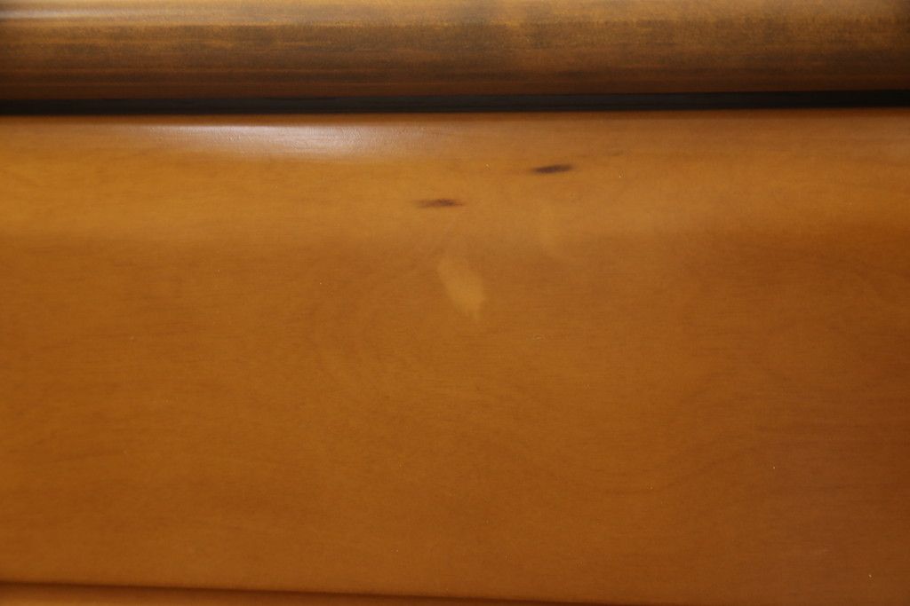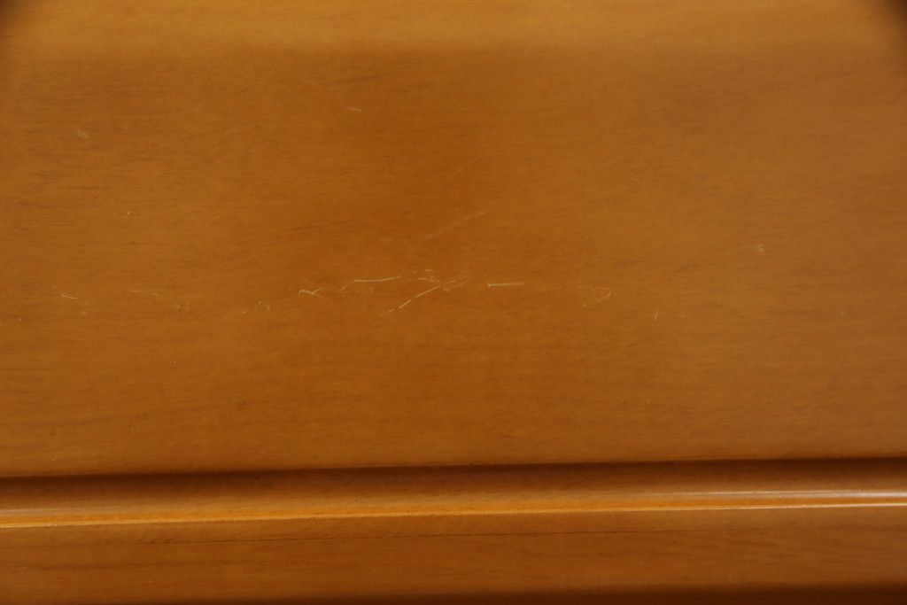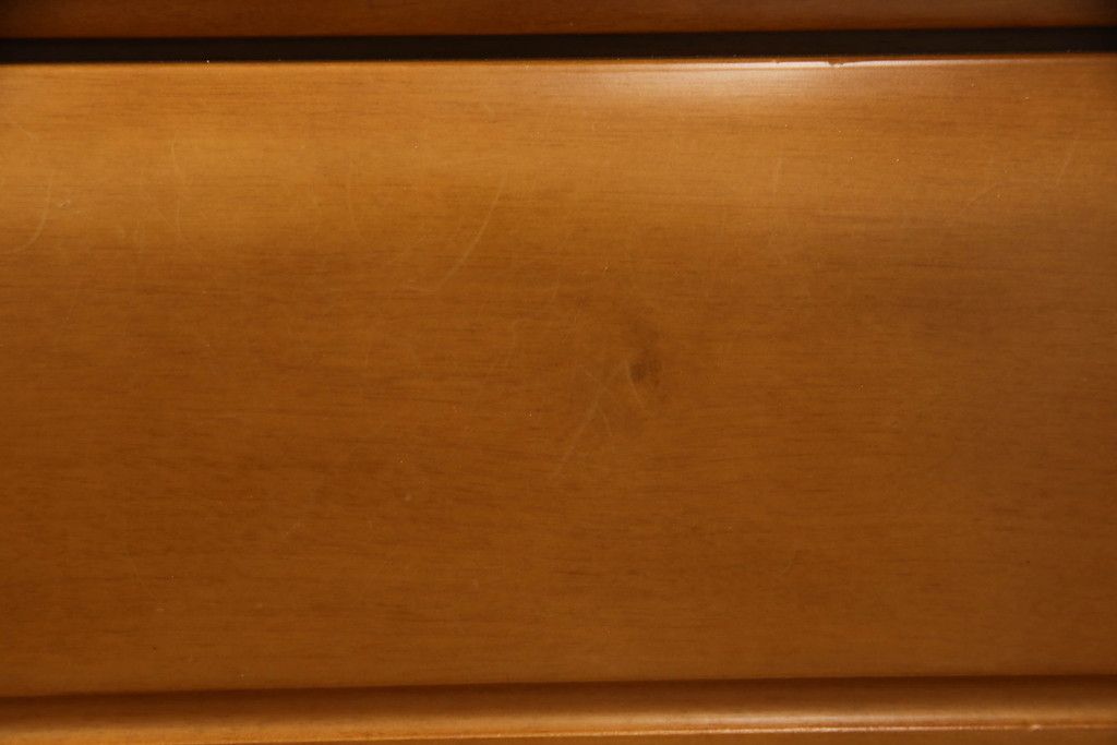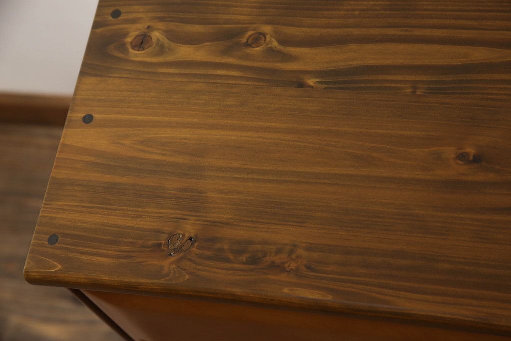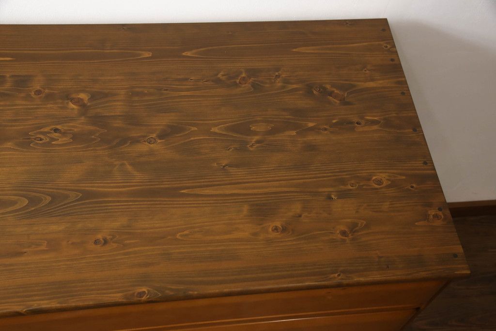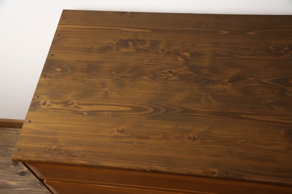 婚礼タンスをチェストにリメイク!新たに取り付けた天板は着色して仕上げ。本体は元の色味をベースに、キズ消しや補色をメインに行い仕上げ。