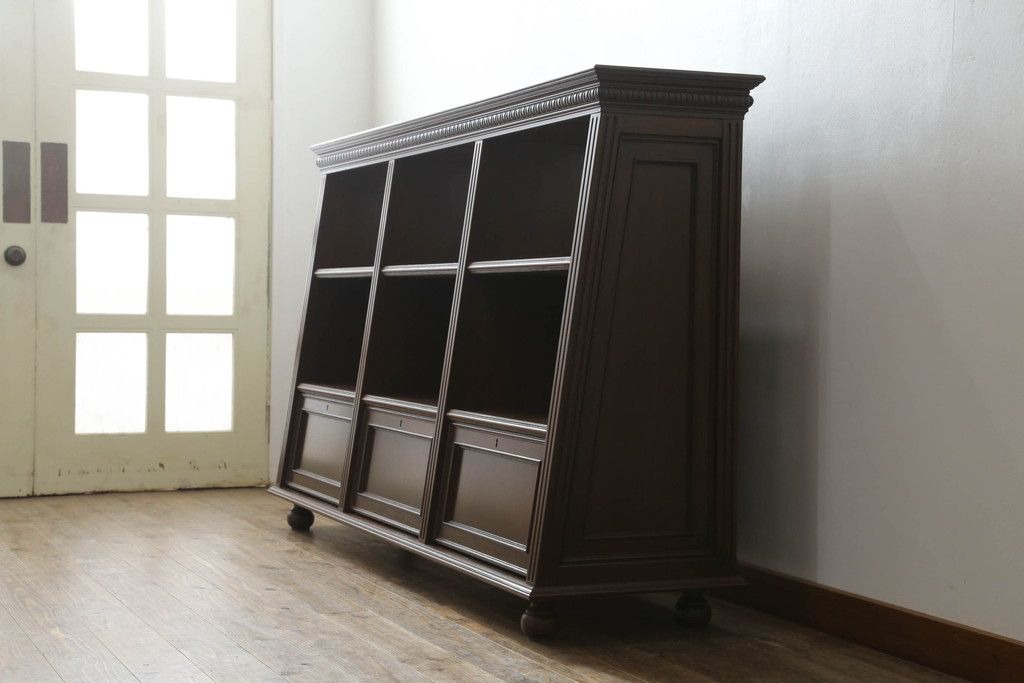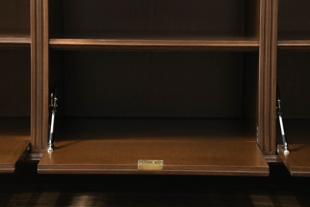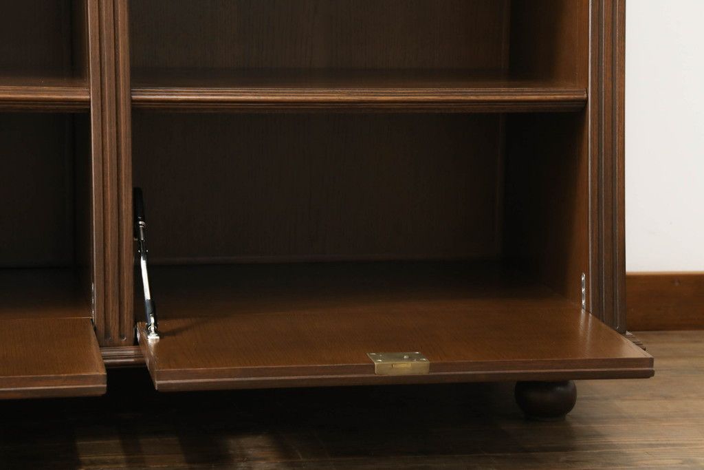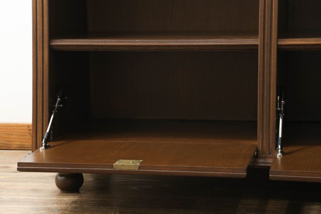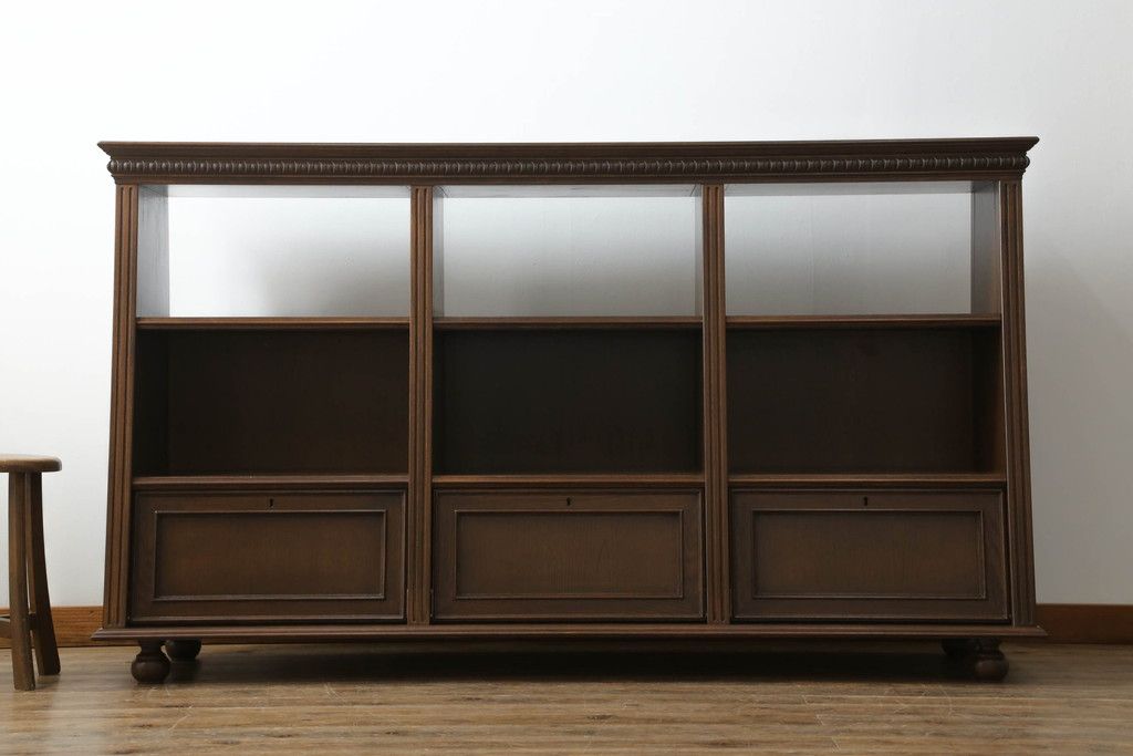 オープンラック・シェルフ> ディスプレイラック > 軽井沢カフェ物件で使用するディスプレイシェルフを新規製作!1、2段目はオープン棚、3段目はフラップダウン式扉仕様の棚に。底面には丸脚を取り付け。(飾り棚、陳列棚、オープンラック、カウンターテーブル、収納棚、店舗什器)