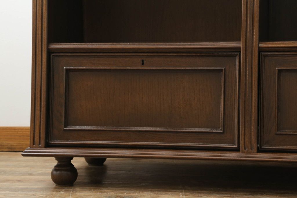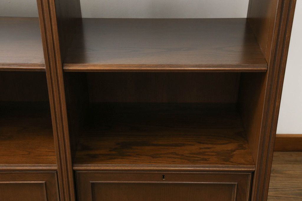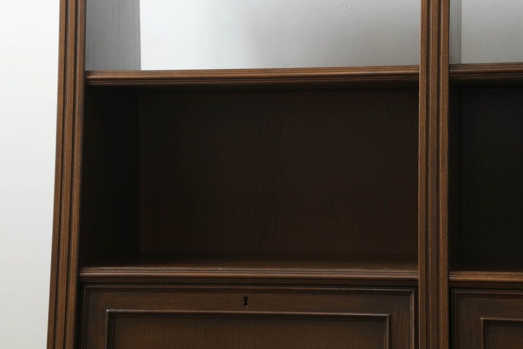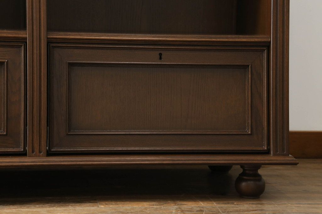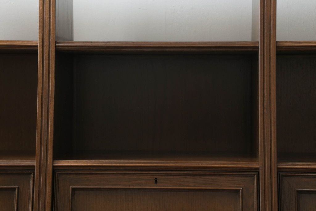 オープンラック・シェルフ> ディスプレイラック > 軽井沢カフェ物件で使用するディスプレイシェルフを新規製作!1、2段目はオープン棚、3段目はフラップダウン式扉仕様の棚に。底面には丸脚を取り付け。(飾り棚、陳列棚、オープンラック、カウンターテーブル、収納棚、店舗什器)