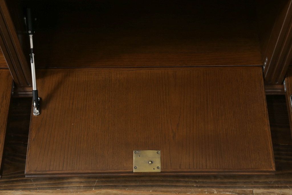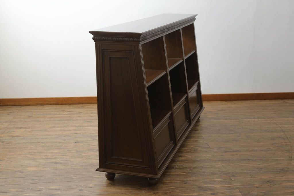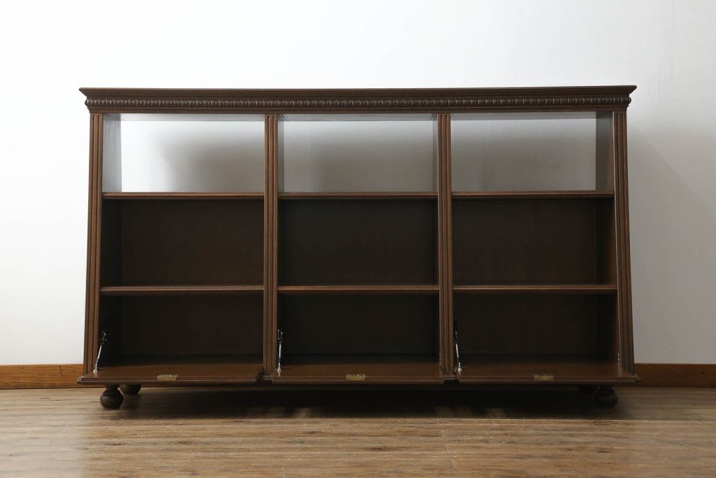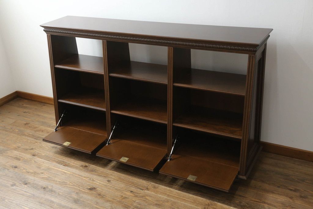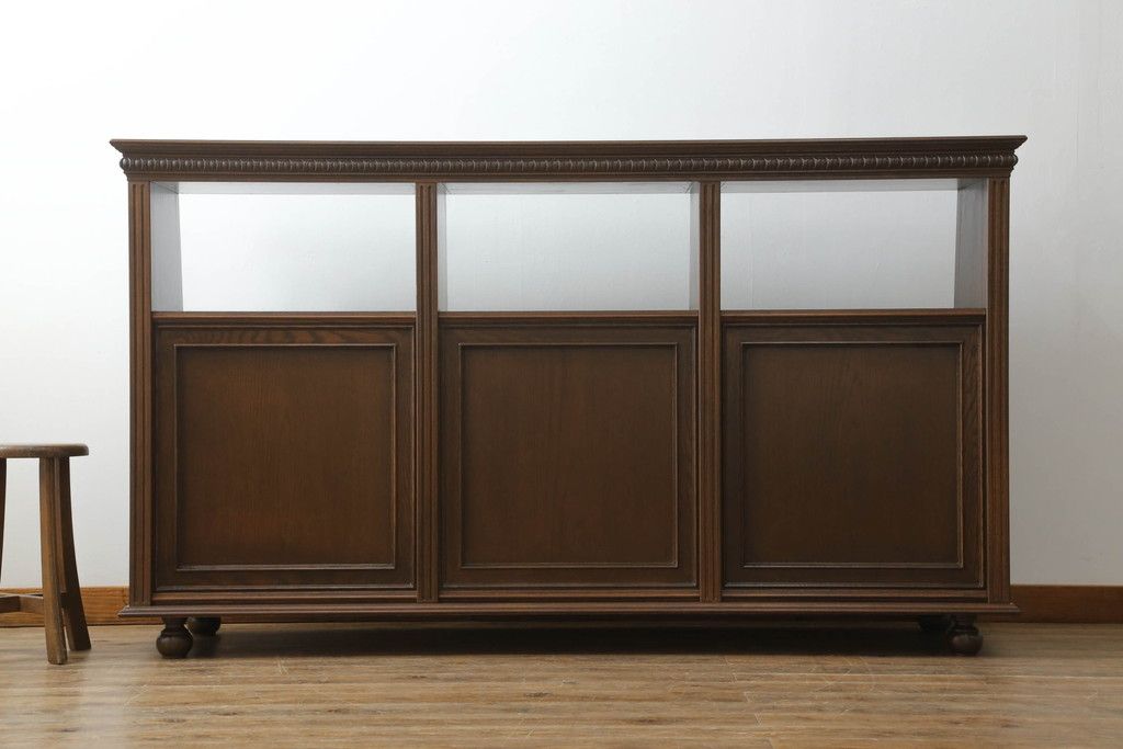 キャビネット・戸棚> サイドボード > 軽井沢カフェ物件で使用するディスプレイシェルフを新規製作!1、2段目はオープン棚、3段目はフラップダウン式扉仕様の棚に。底面には丸脚を取り付け。(飾り棚、陳列棚、オープンラック、カウンターテーブル、収納棚、店舗什器)