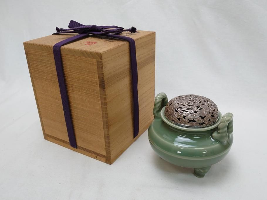 ラフジュ工房> 骨董品の買取実績> 香炉の買取実績 > 【骨董買取】二代 加藤渓山(Kato Keizan) 天龍寺 青磁 耳付 香炉 公寿造純銀火屋(鶴、ツル)を買取りました。