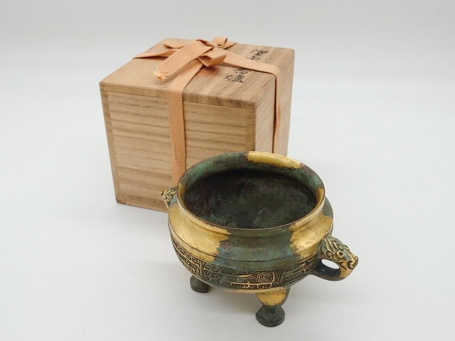 ラフジュ工房> 骨董品の買取実績> 香炉の買取実績 > 【骨董買取】昭和中期 鋳金家 四世 秦蔵六作(Hata Zoroku) 嘉禮龍紋敦式 塗金銅香炉(香爐、三つ脚、仏具)を買取りました。