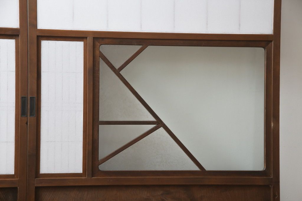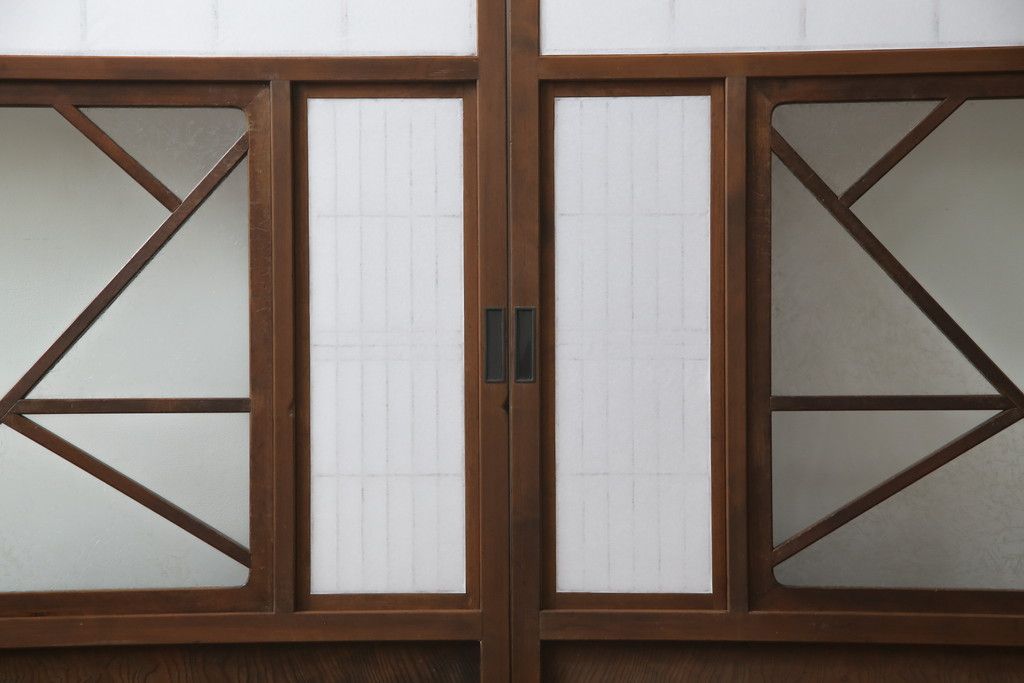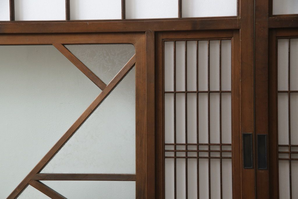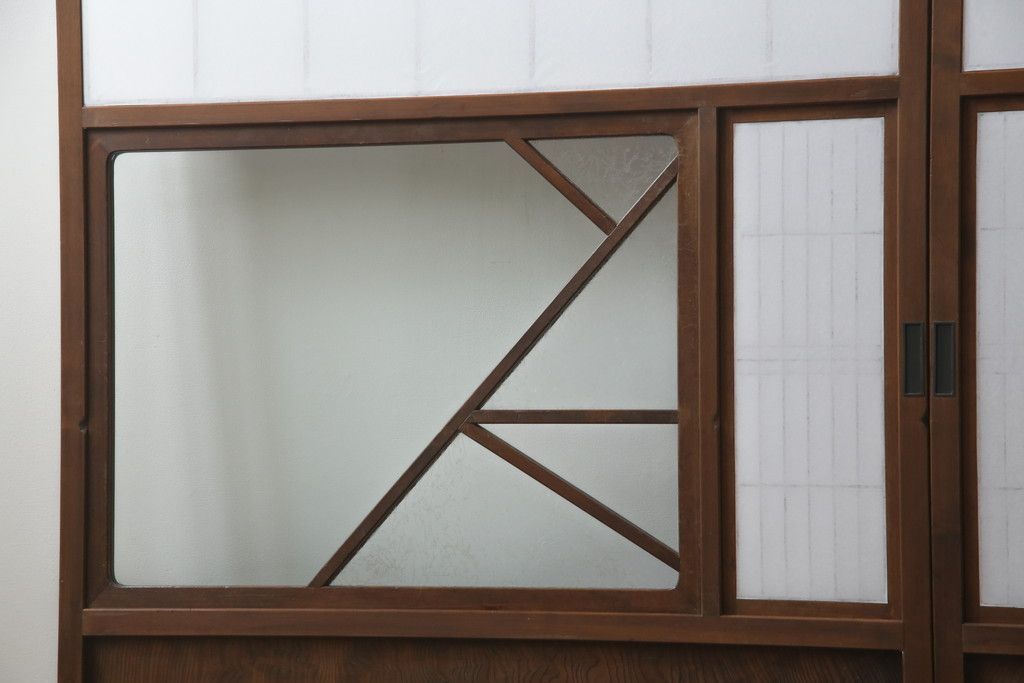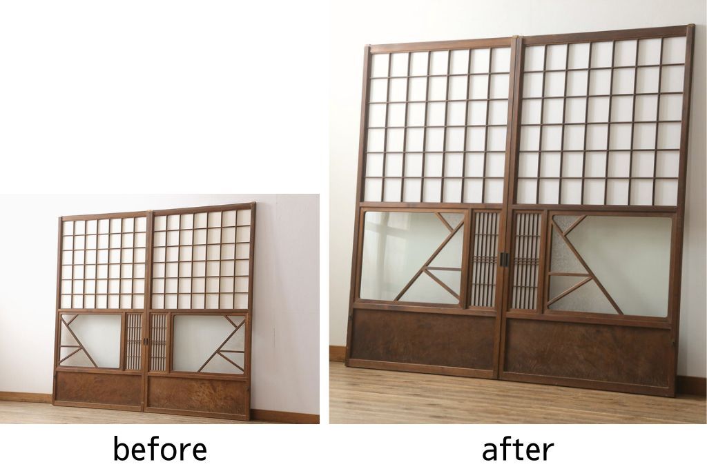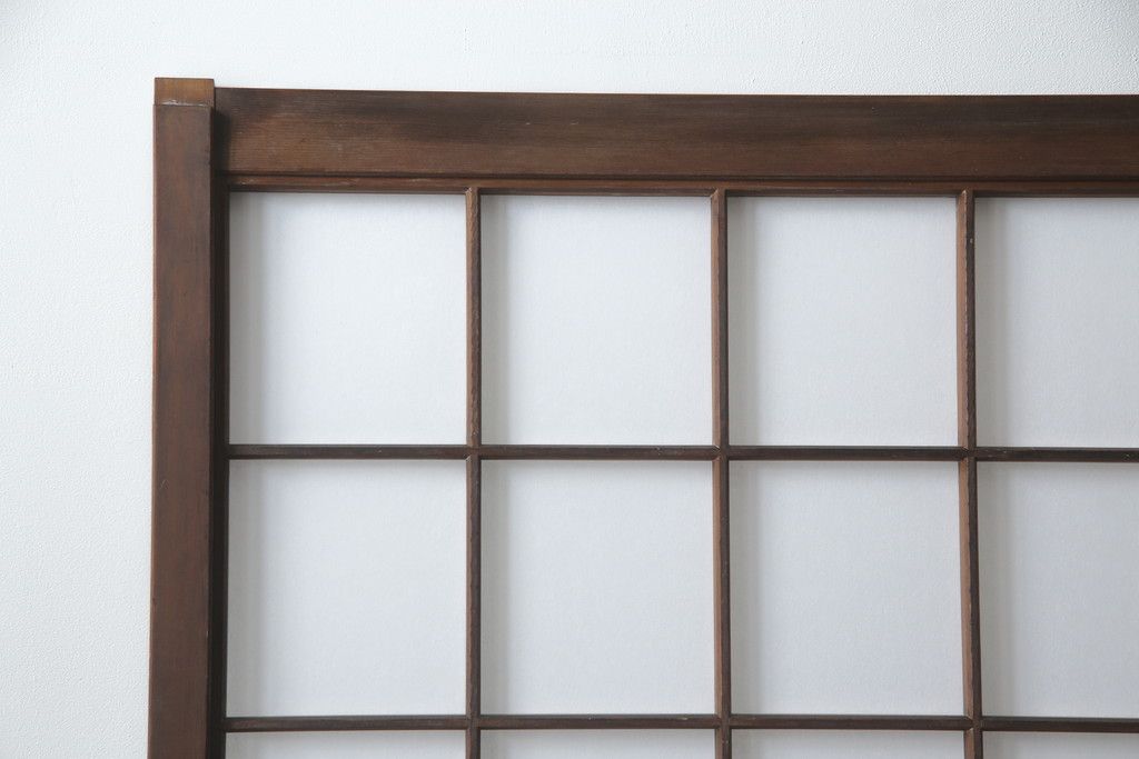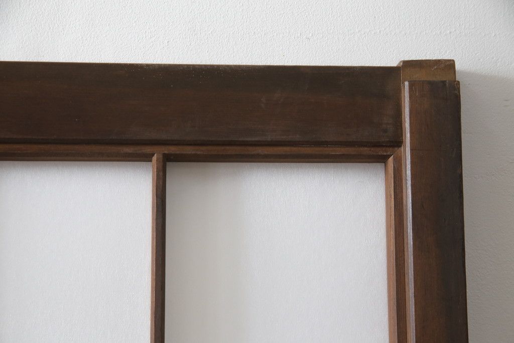 昭和初期の障子戸2枚をリペア&カスタム!金具は交換し、障子もプラスチック障子へ張り替え。全体を元の色味に合わせて着色して仕上げ。(建具、引き戸、ガラス戸)