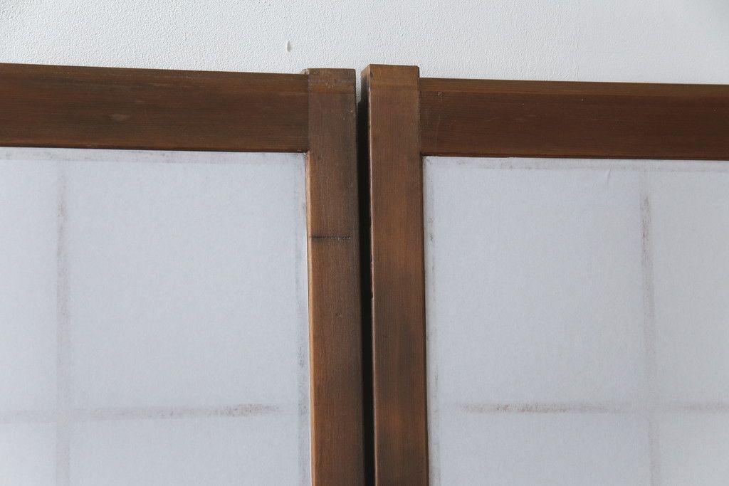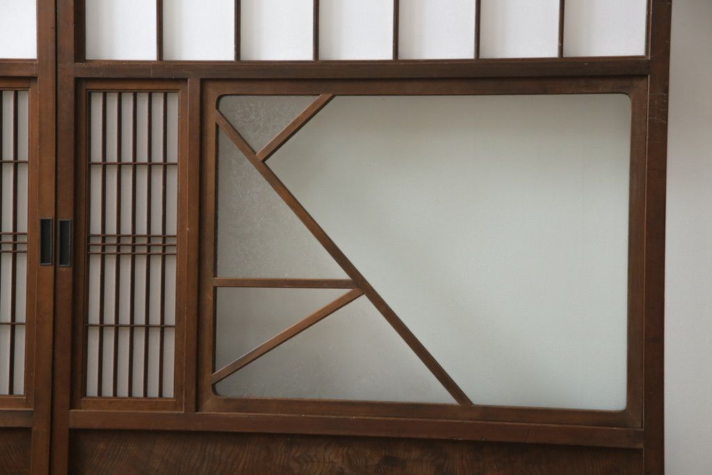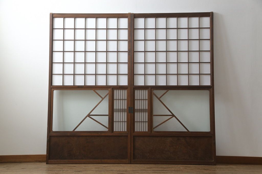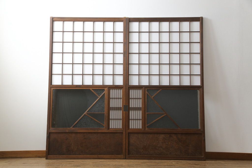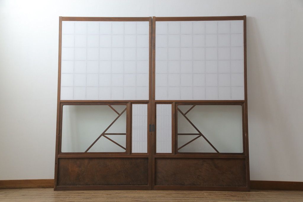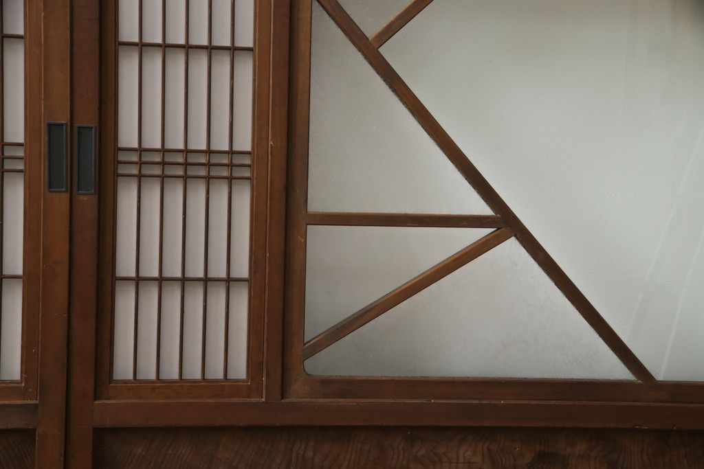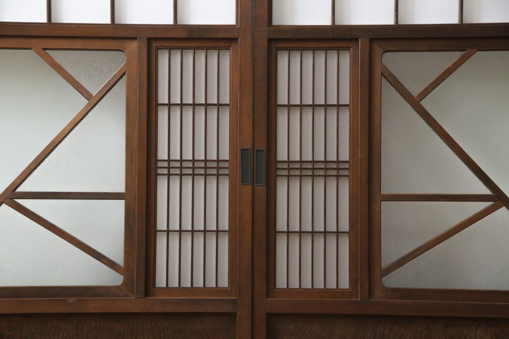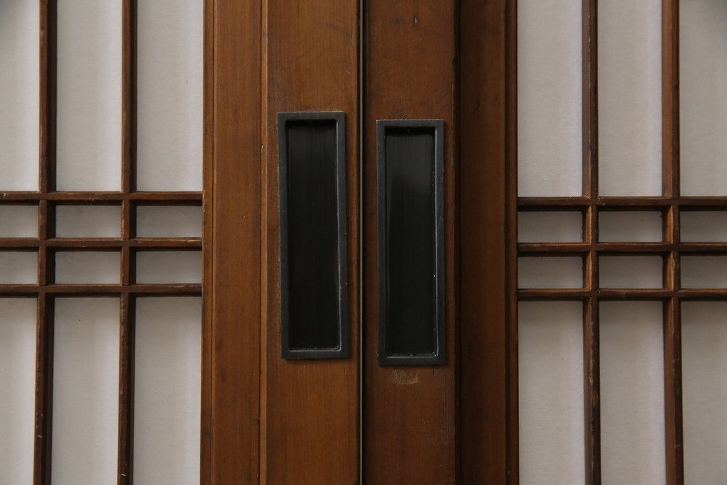 昭和初期の障子戸2枚をリペア&カスタム!金具は交換し、障子もプラスチック障子へ張り替え。全体を元の色味に合わせて着色して仕上げ。(建具、引き戸、ガラス戸)