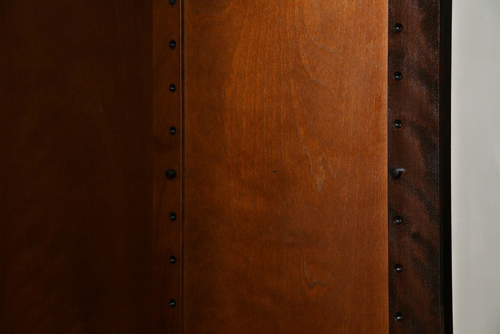 棚板は取り外しできます。棚板は4枚あります。棚受けは20ヶ所、50mmピッチで調整できます。棚幅サイズのものが1枚の作りです。