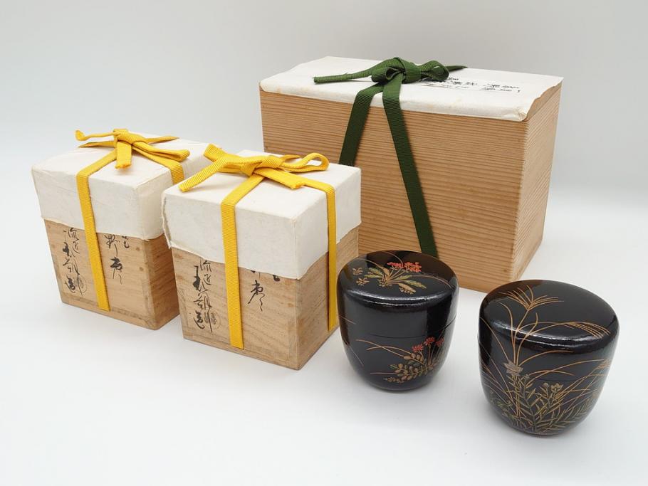ラフジュ工房> 骨董品の買取実績> 棗の買取実績 > 【骨董買取】時代物 鈴木表朔(Suzuki Hyosaku) 一閑張 色漆絵 春野 秋野 棗 一双入 尋牛斎書(茶筒、茶道具)を買取りました。