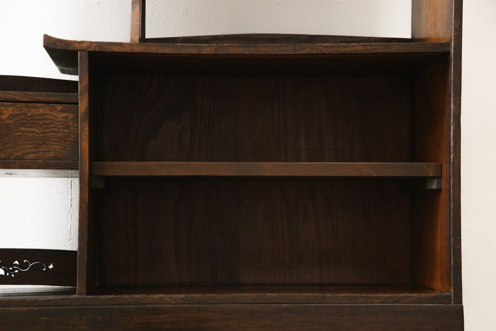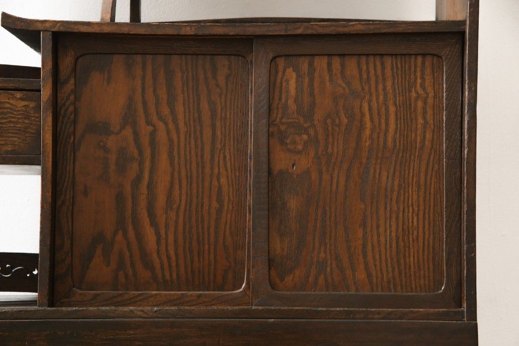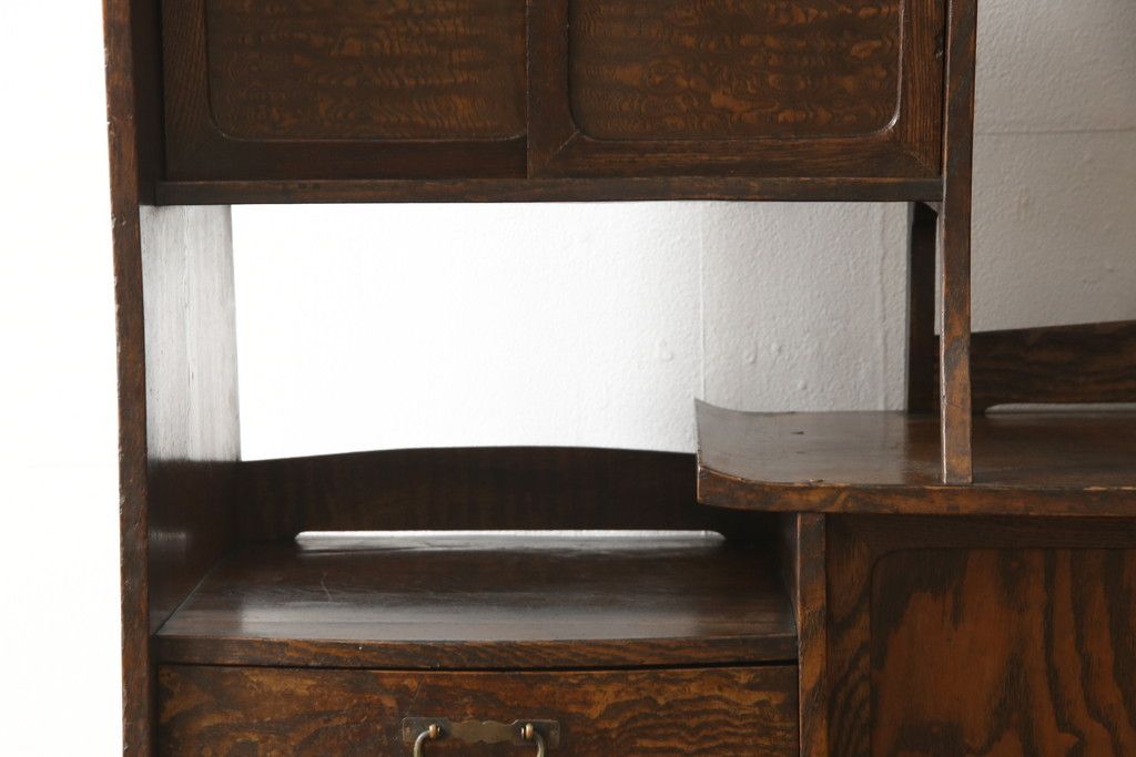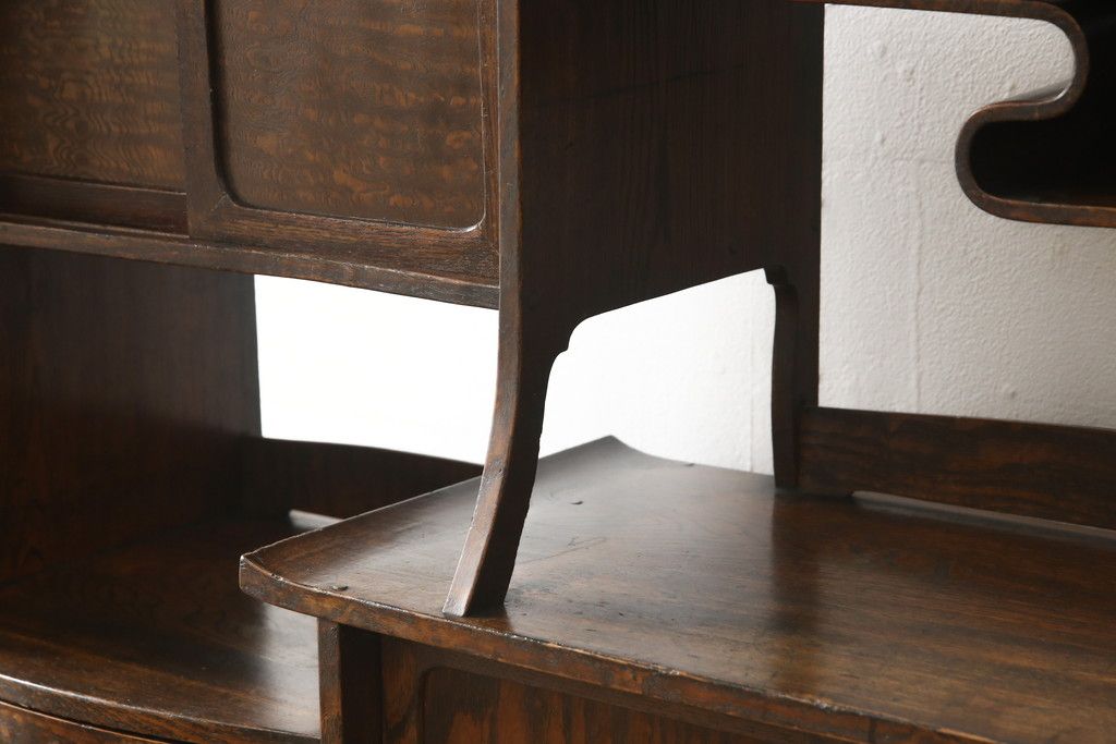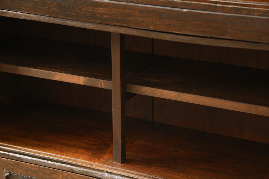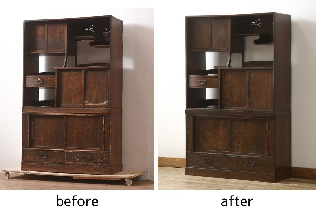 セミオーダー家具実績 > 重ね茶棚にリペア&カスタム!中段・下段引き戸内部の既存の棚板を取り外し、棚受けを取り付け、棚板を各1枚製作し取り付け。本体は現状をベースに着色。(茶箪笥、飾り棚、収納棚、戸棚)