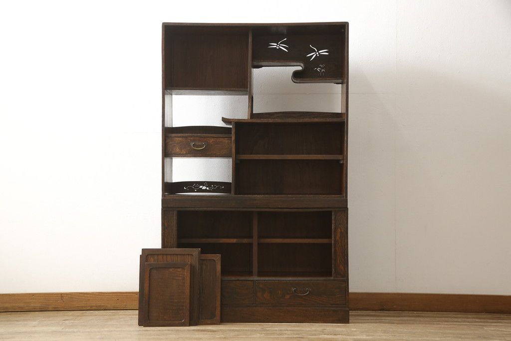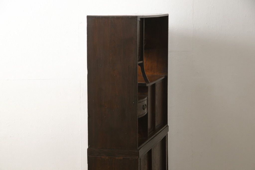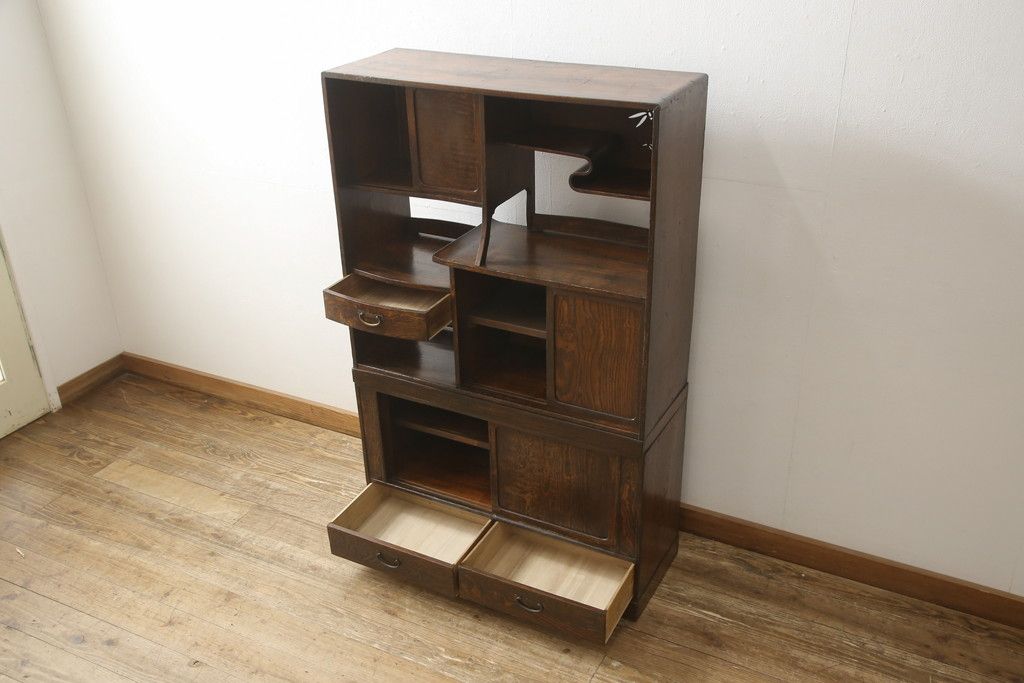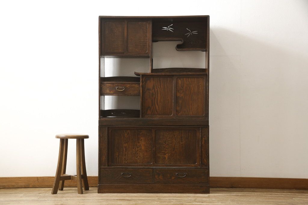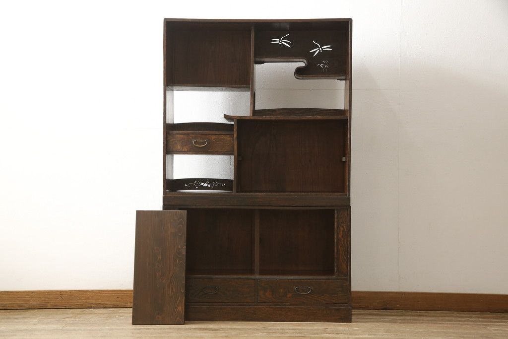 和箪笥> 茶箪笥・茶棚 > 重ね茶棚にリペア&カスタム!中段・下段引き戸内部の既存の棚板を取り外し、棚受けを取り付け、棚板を各1枚製作し取り付け。本体は現状をベースに着色。(茶箪笥、飾り棚、収納棚、戸棚)
