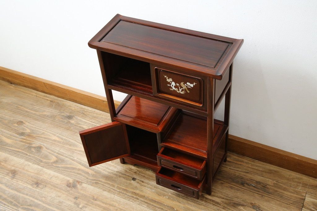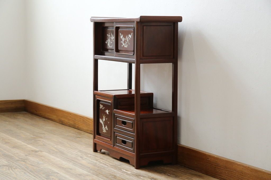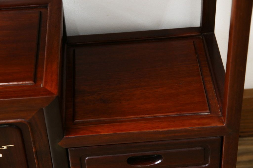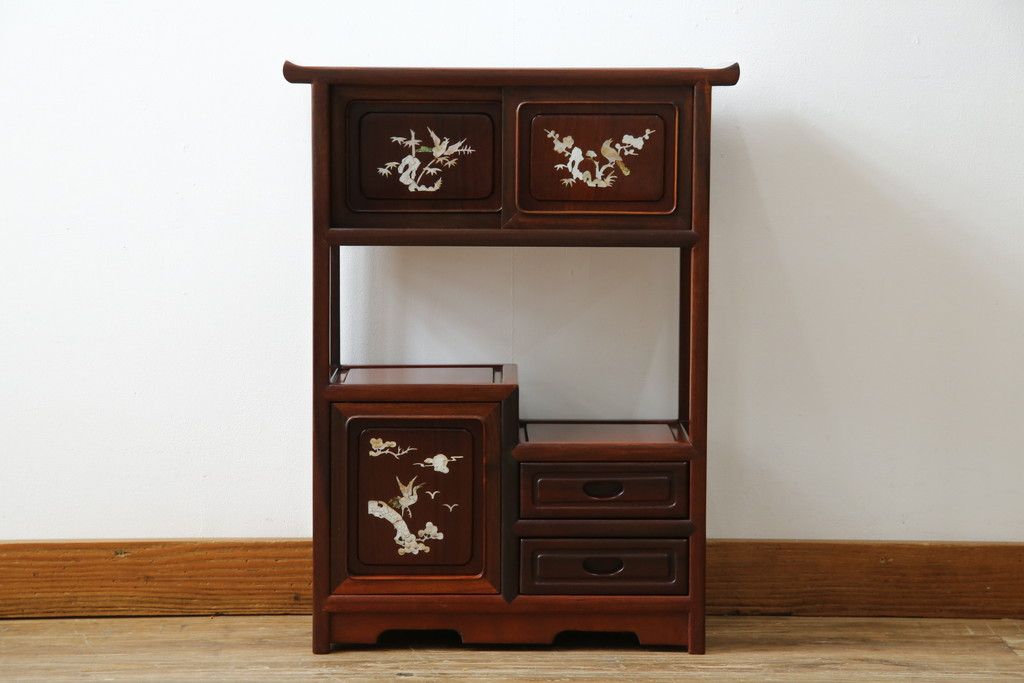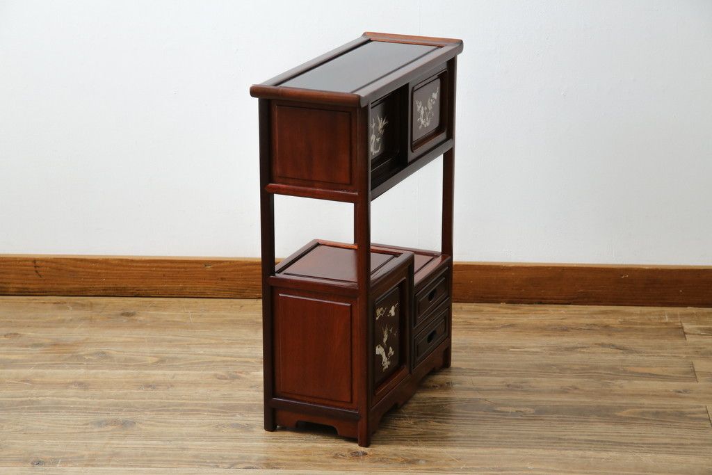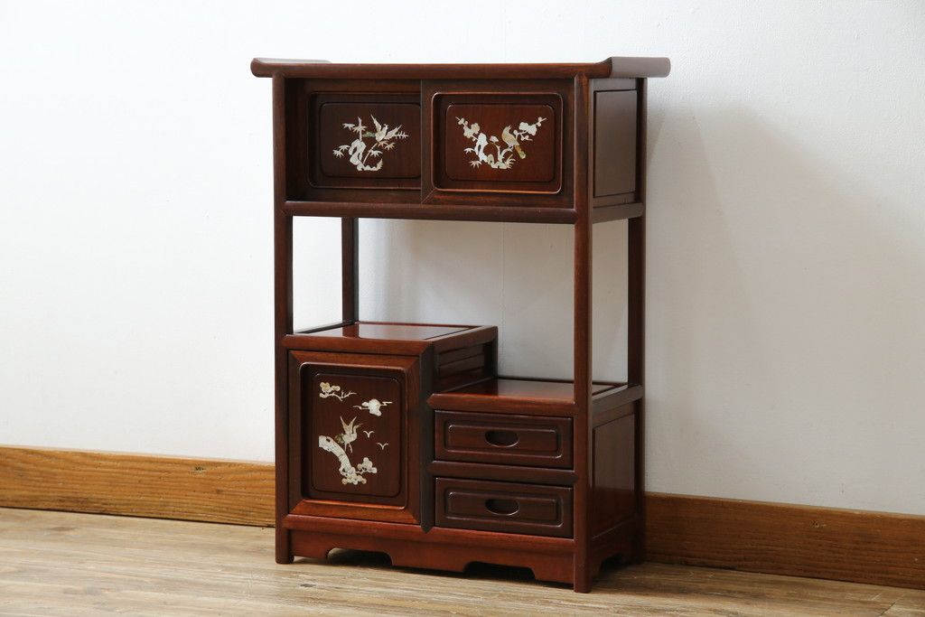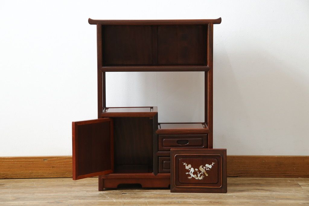 和製ビンテージ 花梨(カリン)材 螺鈿(ラデン) 象嵌入り 上品な佇まいで和の雰囲気を引き立てる小振りな茶棚(収納棚、戸棚、違い棚、ヴィンテージ)(R-078622)