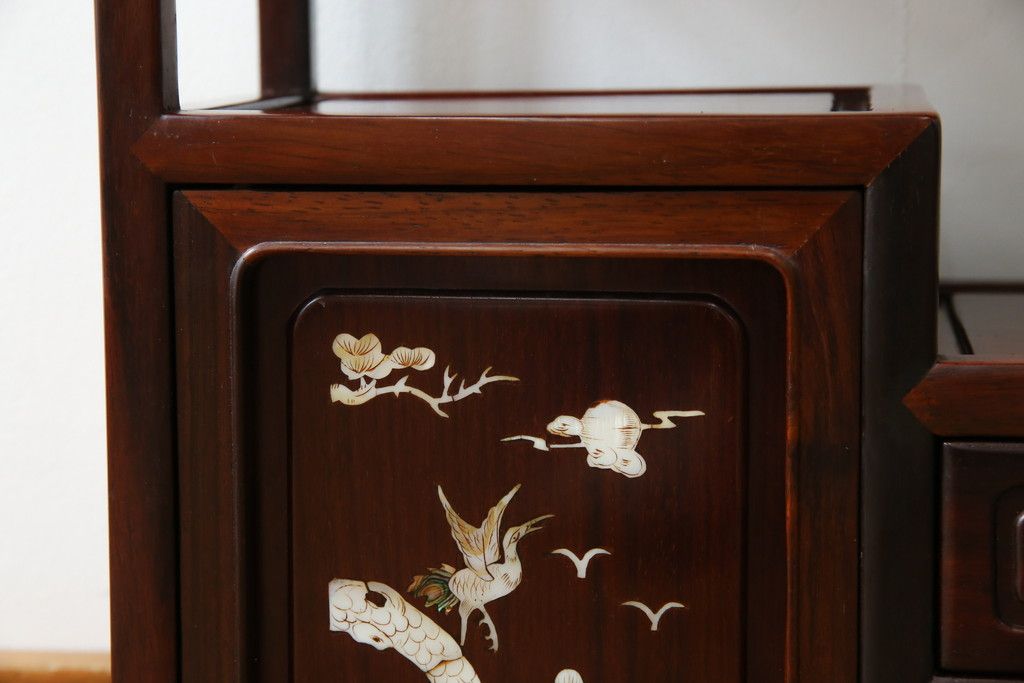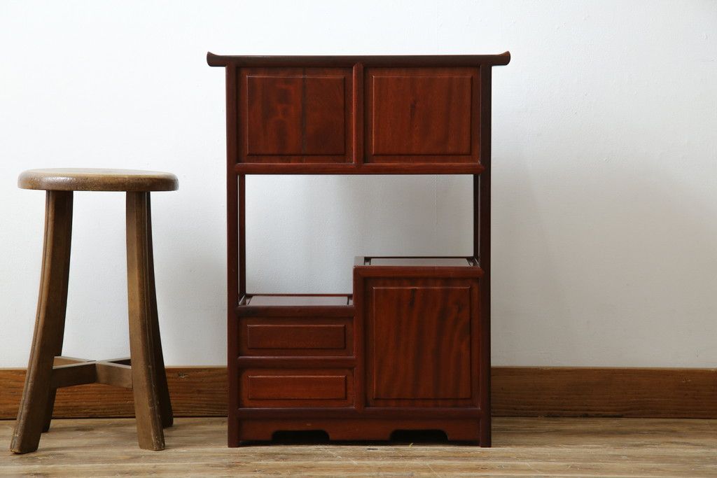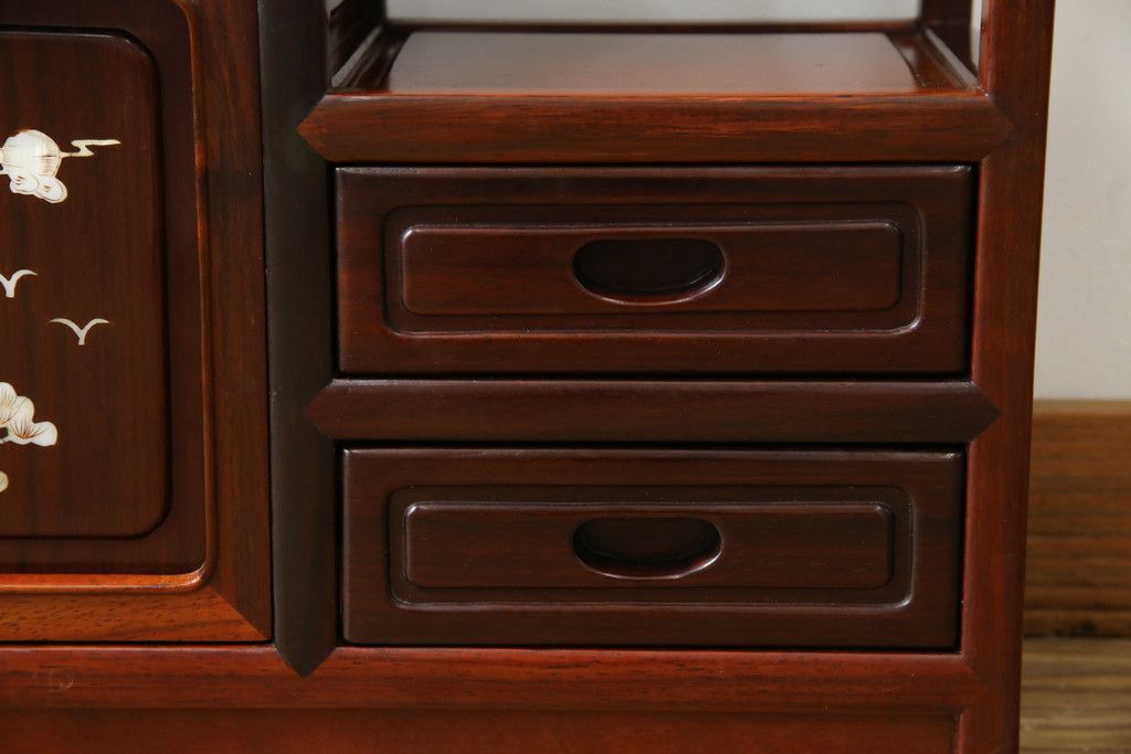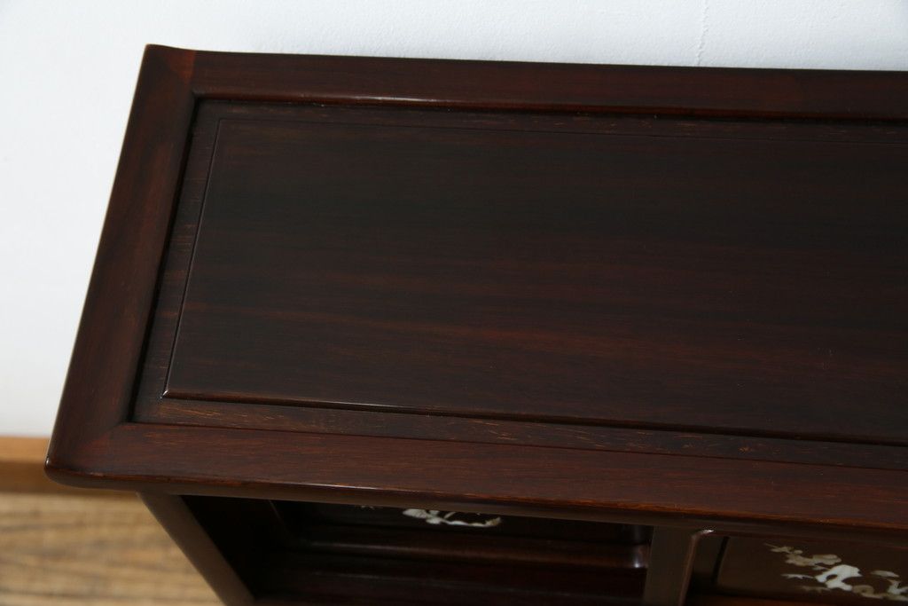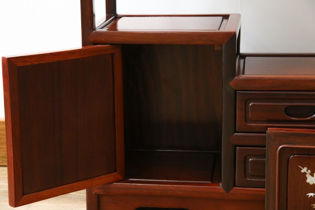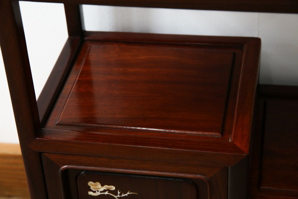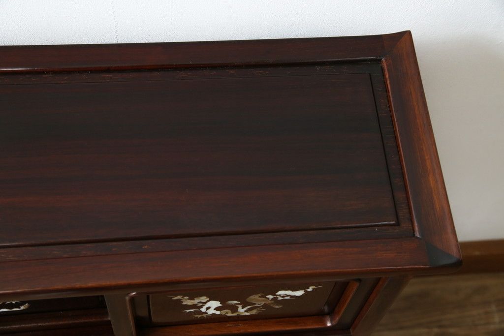 和製ビンテージ 花梨(カリン)材 螺鈿(ラデン) 象嵌入り 上品な佇まいで和の雰囲気を引き立てる小振りな茶棚(収納棚、戸棚、違い棚、ヴィンテージ)(R-078622)