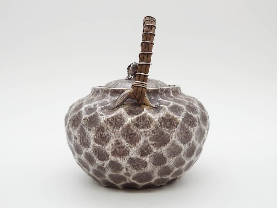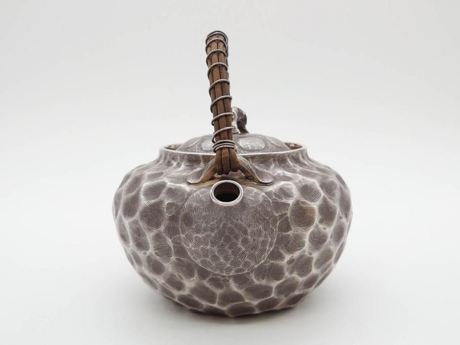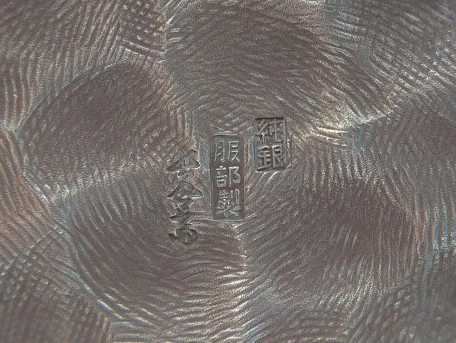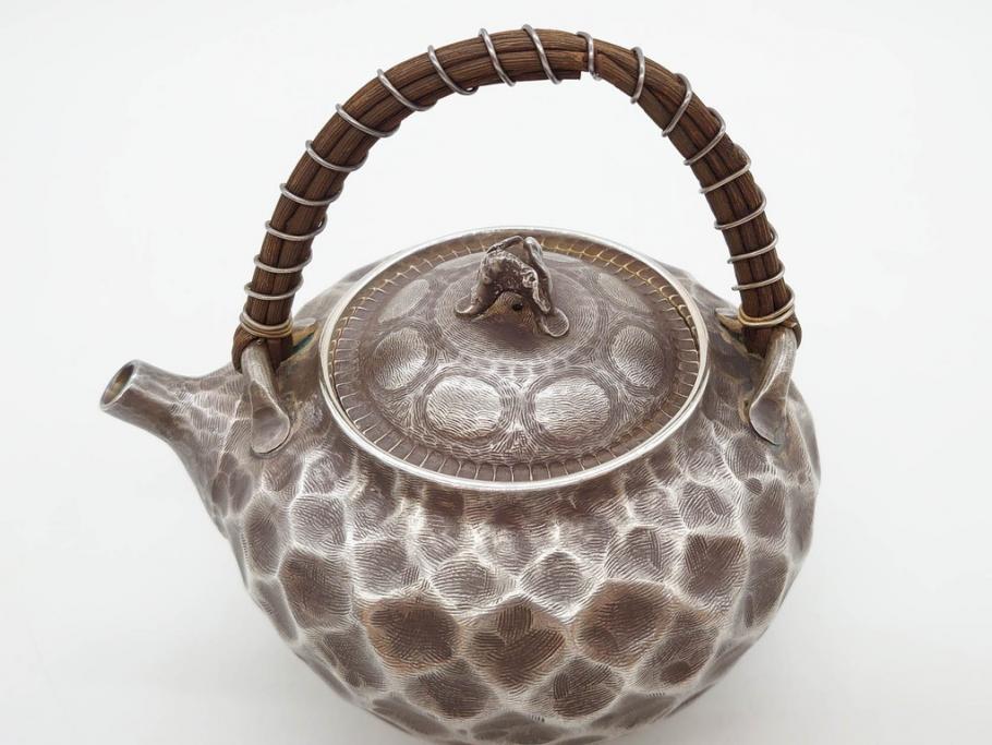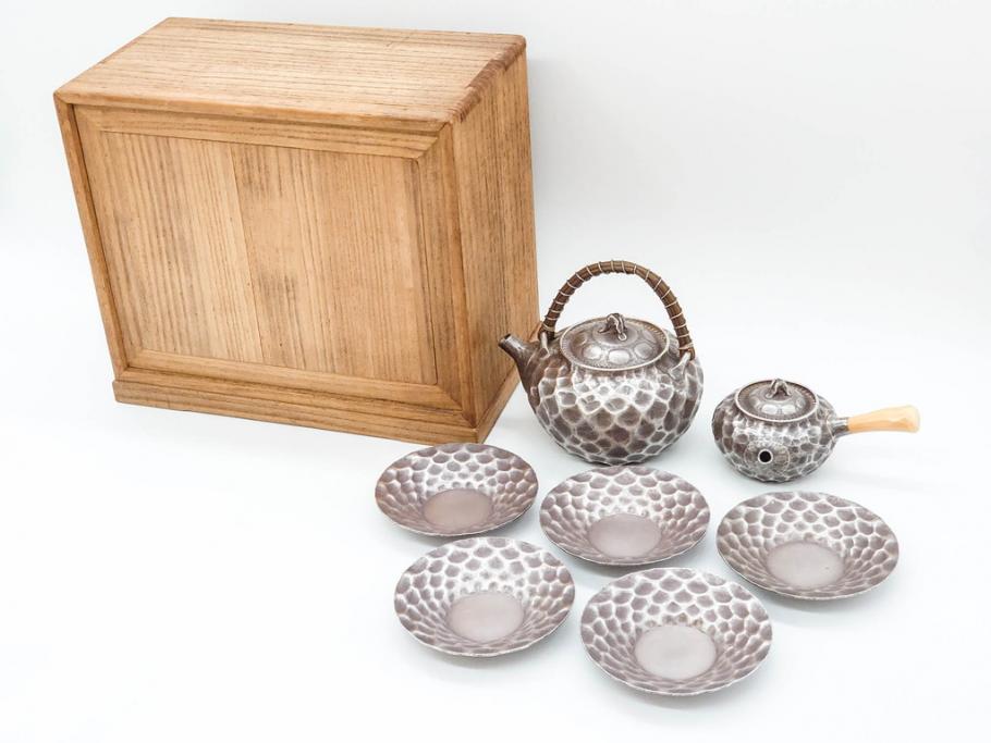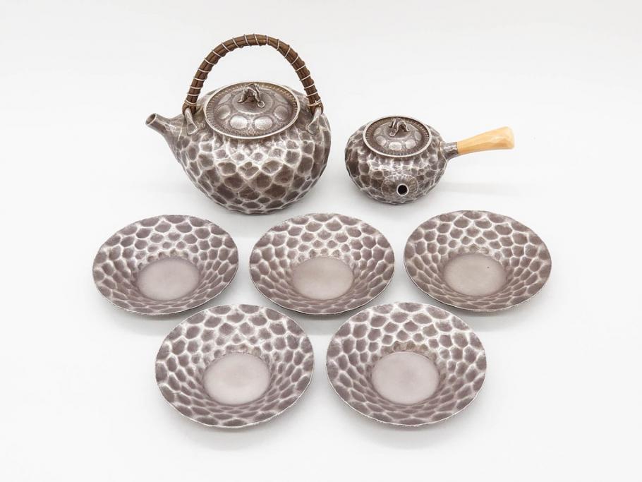 ラフジュ工房> 和食器・茶道具> 皿 > 純銀 服部製 茶器揃 在銘作家物 合計972g 槌目模様が魅力的な重厚感のある茶器揃(銀瓶、湯瓶、煎茶道具、服部時計店、シルバー、茶道具、湯沸かし、急須、茶托、和食器、共箱付き、説明書付き)(R-078648)