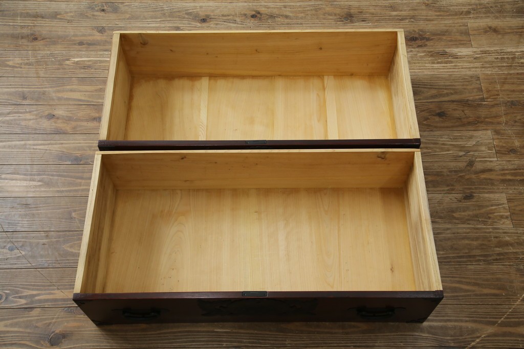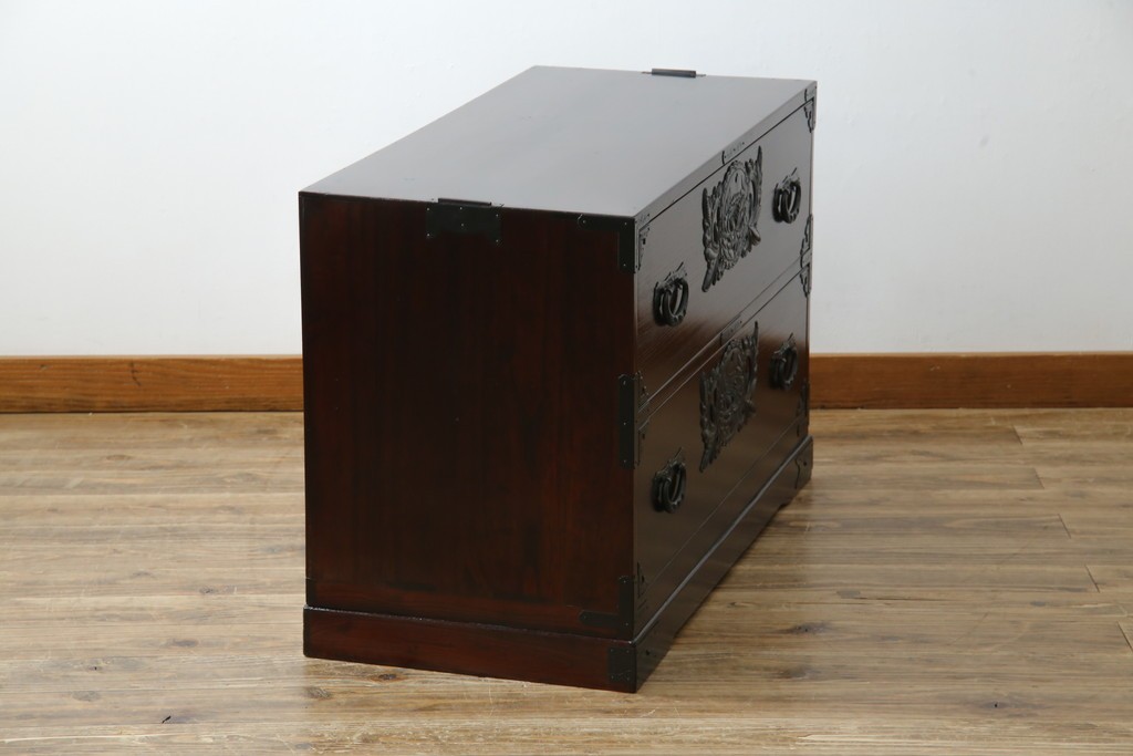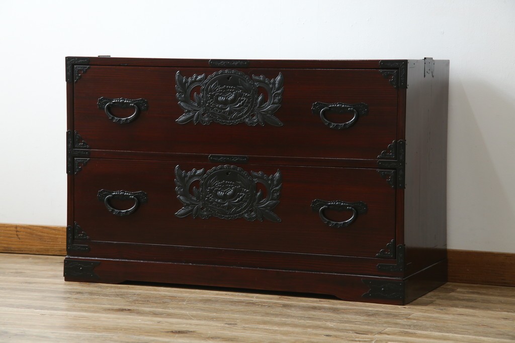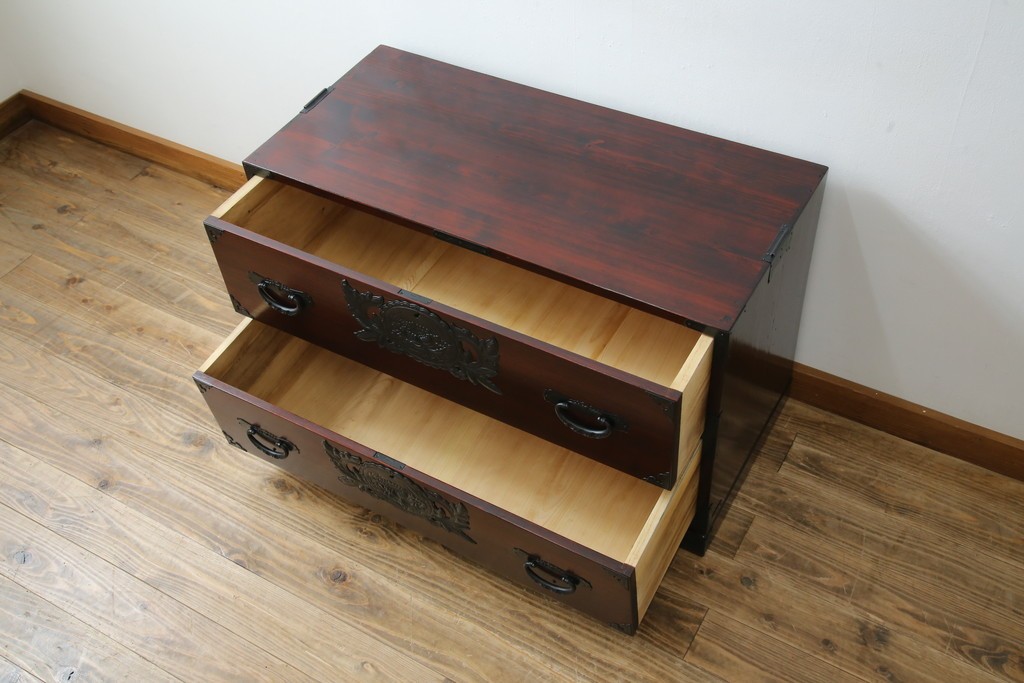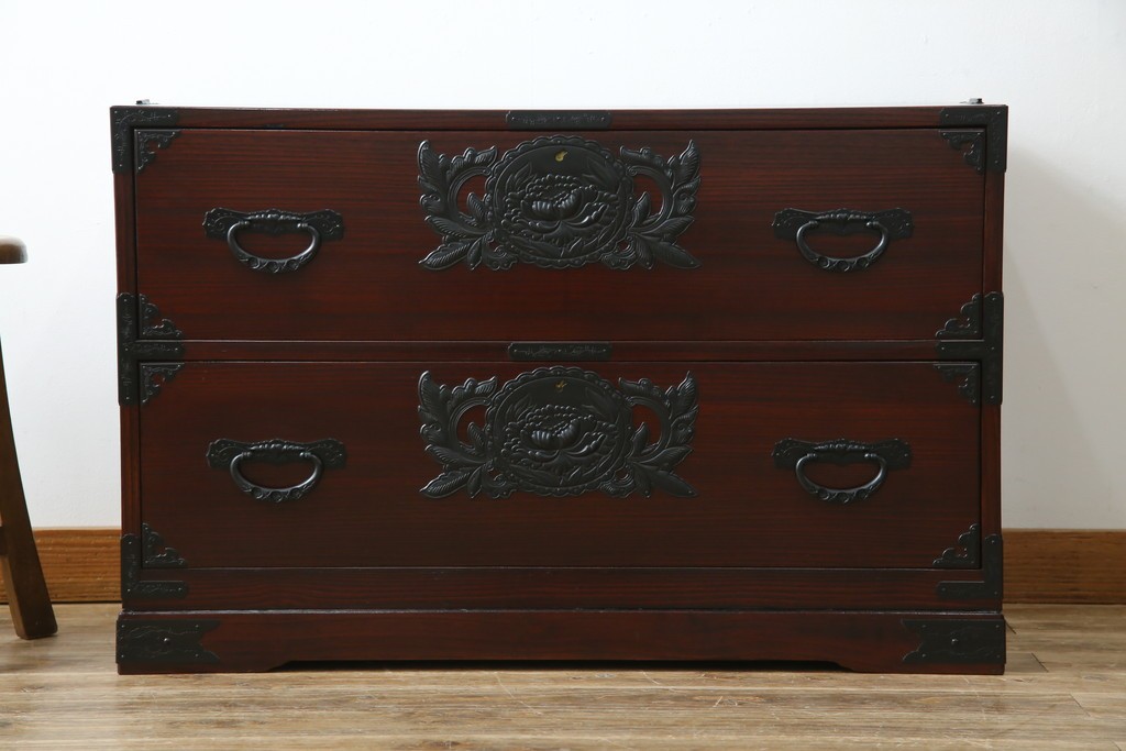 チェスト・引き出し> ローチェスト > 和製ヴィンテージ 美品!! 欅産業社にて仙台箪笥にリメイク済み 落ち着いた色味と美しい金具が目を惹く漆塗りの衣装箪笥ローチェスト (R-078655)