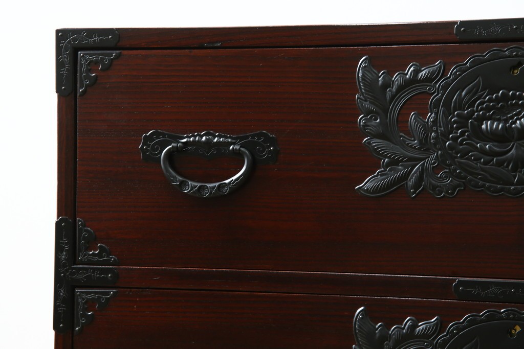 伝統工芸品> 仙台箪笥 > 和製ヴィンテージ 美品!! 欅産業社にて仙台箪笥にリメイク済み 落ち着いた色味と美しい金具が目を惹く漆塗りの衣装箪笥ローチェスト (R-078655)