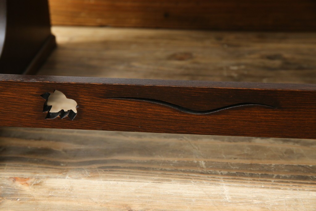 テーブル> 作業台 > 中古 美品 国産工芸家具 栓材 内部桐材 ひょうたんの透かし彫りが目を惹く文机(座机)(R-078720)