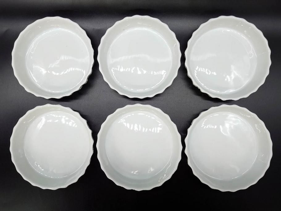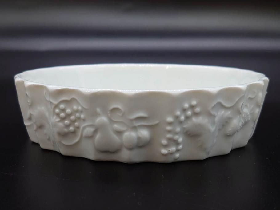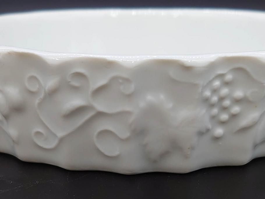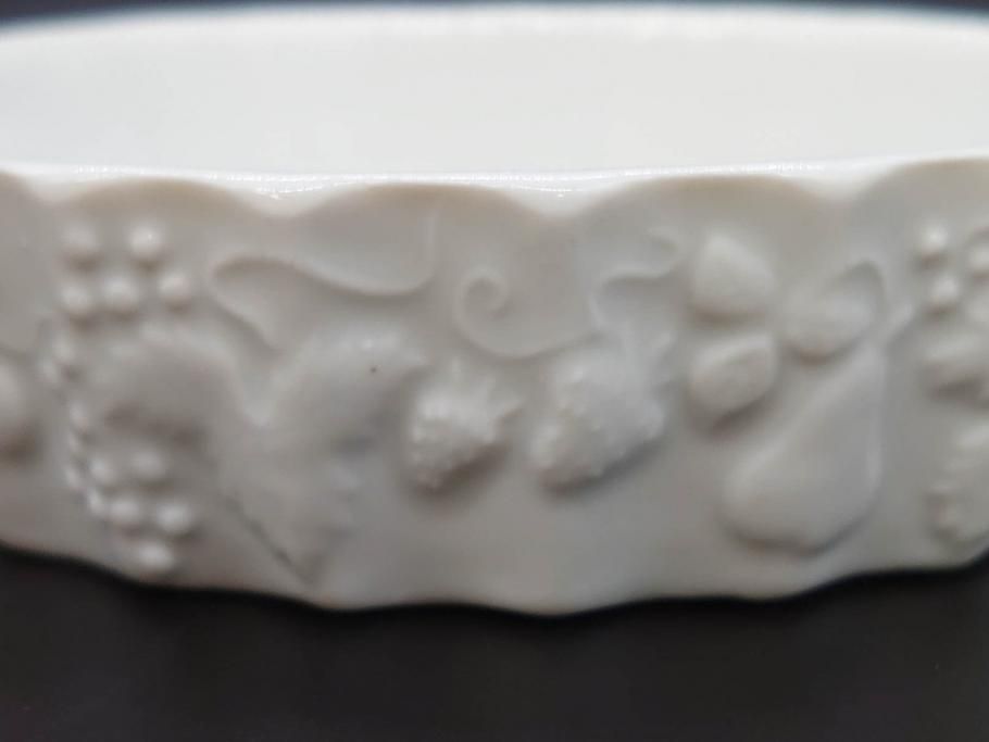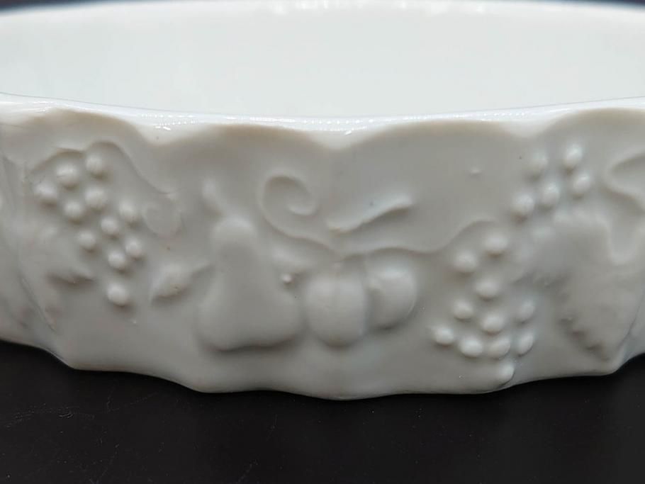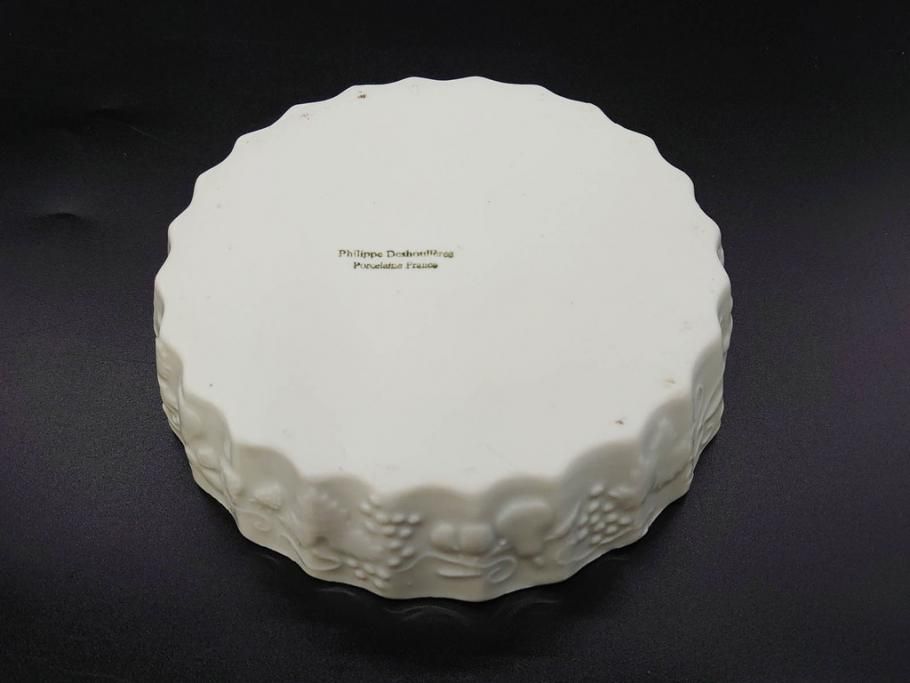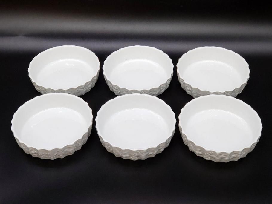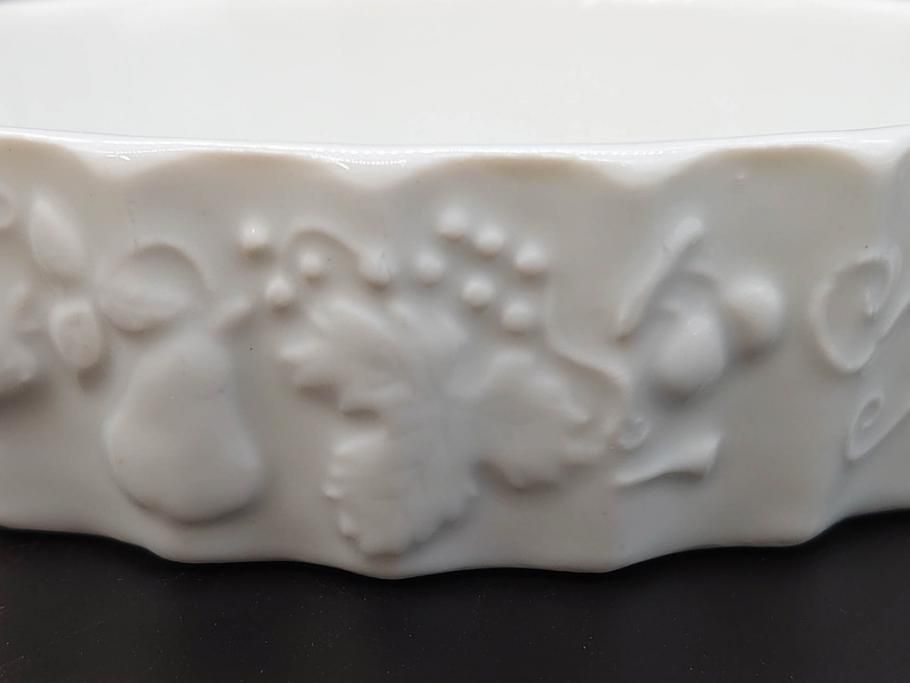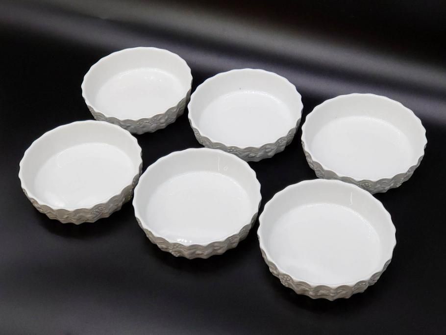 ビンテージ フランス Philippe Deshoulieres(フィリップデズリエ) LIMOGES(リモージュ) 側面に施されたフルーツの模様が可愛らしいグラタン皿6枚セット(ヴィンテージ、果物、いちご、葡萄、洋ナシ、白磁、プレート、中皿、深皿、洋食器)(R-078885)