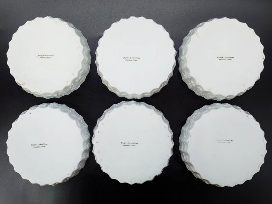ラフジュ工房> 洋食器・キッチン用品 > ビンテージ フランス Philippe Deshoulieres(フィリップデズリエ) LIMOGES(リモージュ) 側面に施されたフルーツの模様が可愛らしいグラタン皿6枚セット(ヴィンテージ、果物、いちご、葡萄、洋ナシ、白磁、プレート、中皿、深皿、洋食器)(R-078885)