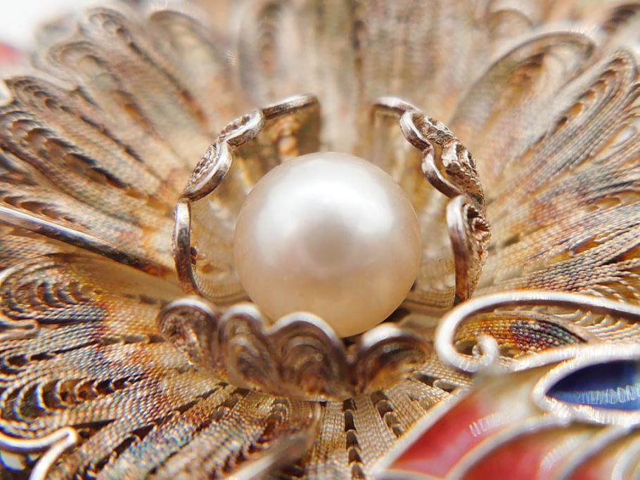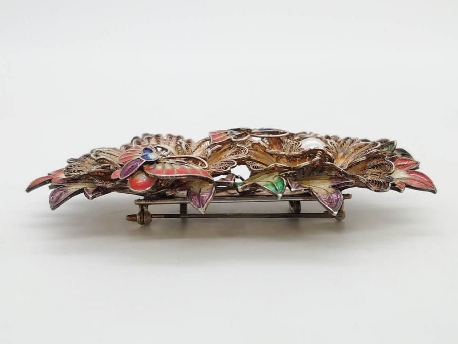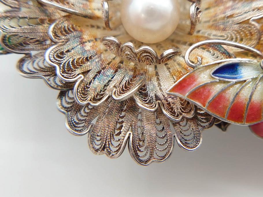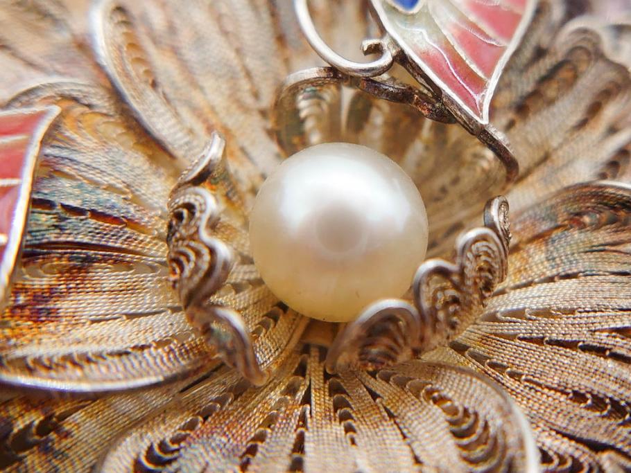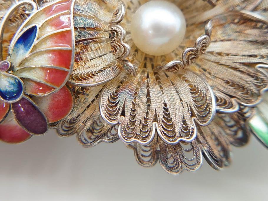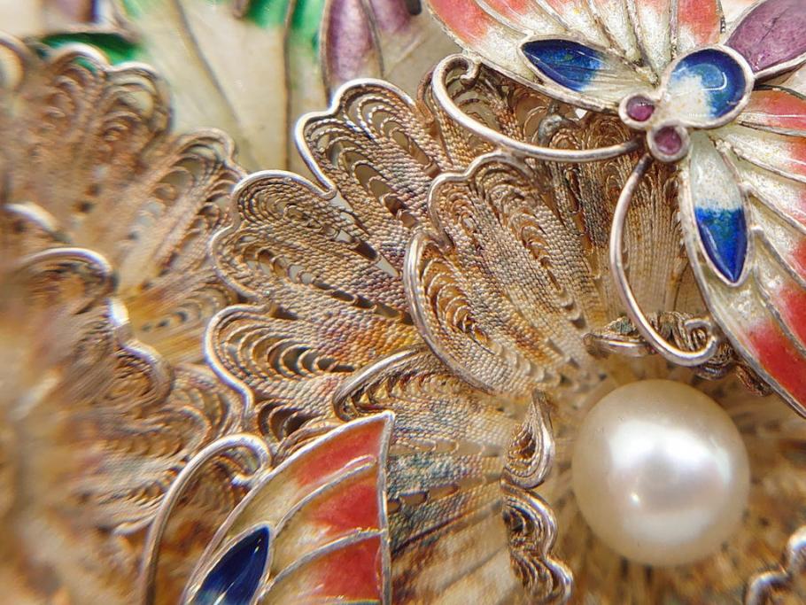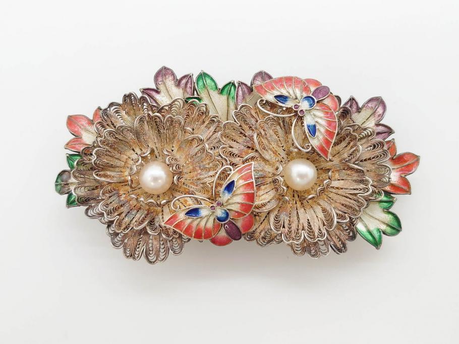 ラフジュ工房> アクセサリー > 希少 アンティーク 金工 舞妓用 パール(真珠) 鮮やかな蝶と繊細な花の細工が目を引く豪華な帯留(ぽっちり、帯留め、着物道具、和装小物、アクセサリー、ブローチ、ケース付き)(R-078991)