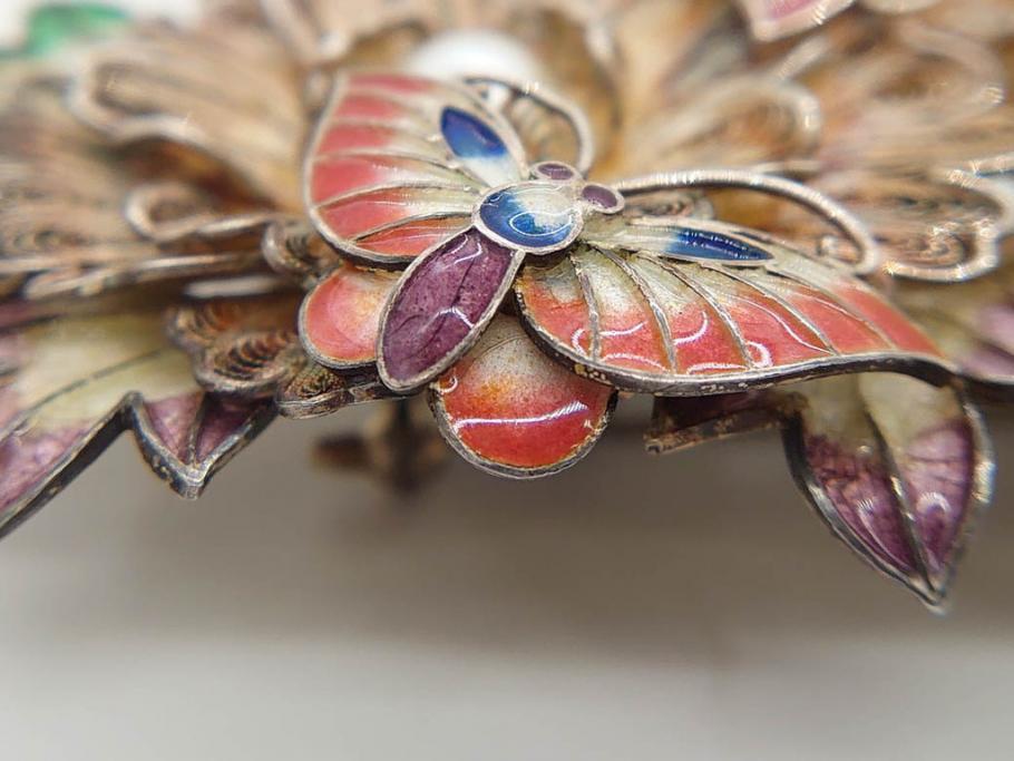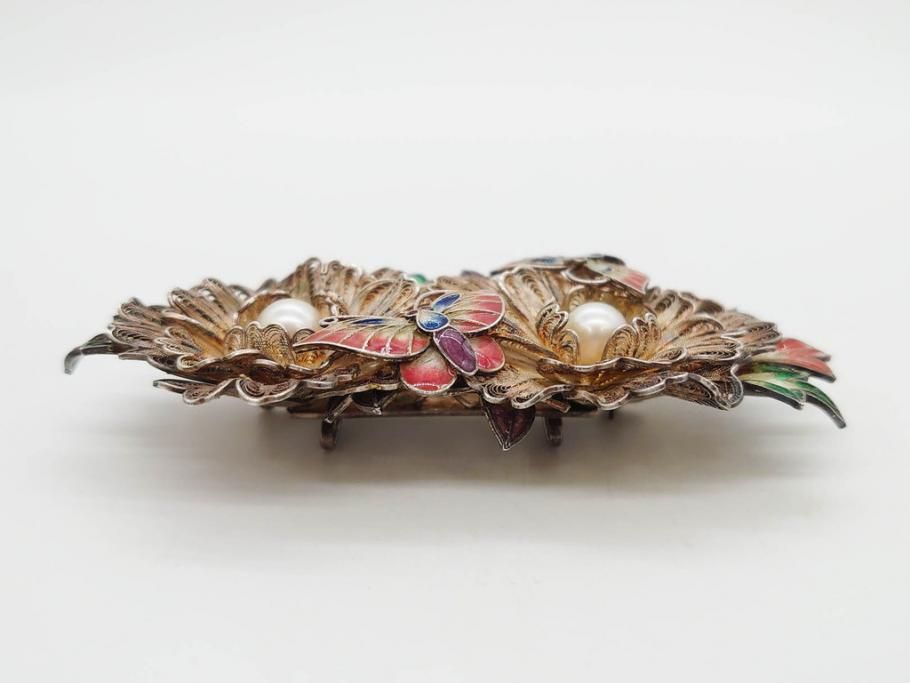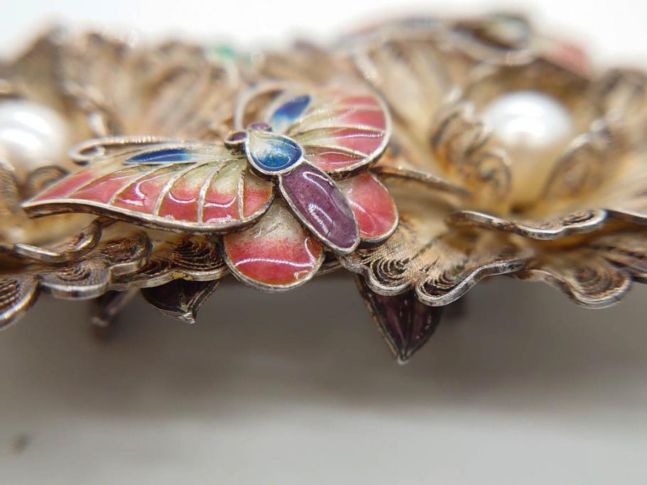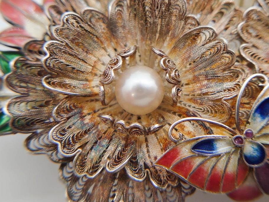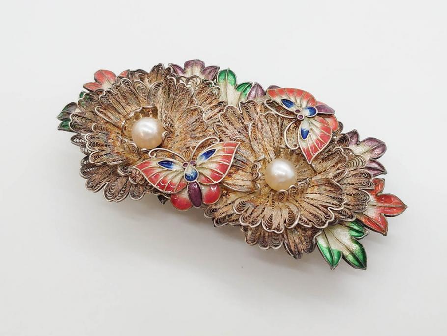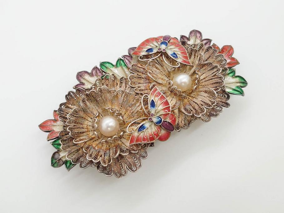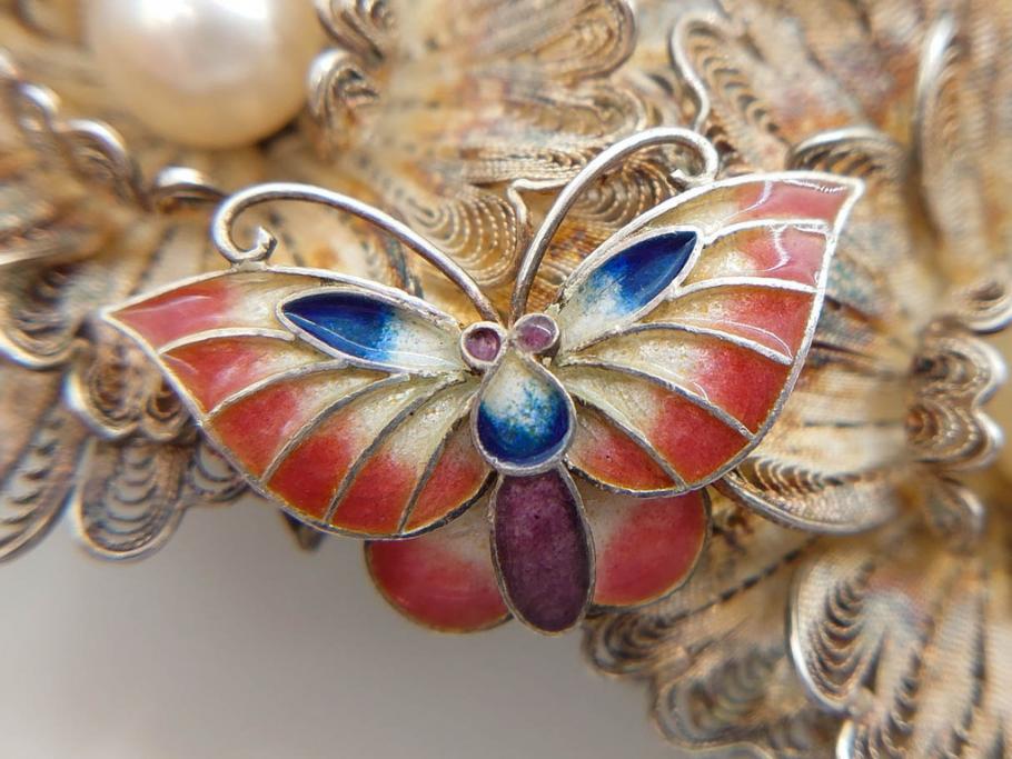 希少 アンティーク 金工 舞妓用 パール(真珠) 鮮やかな蝶と繊細な花の細工が目を引く豪華な帯留(ぽっちり、帯留め、着物道具、和装小物、アクセサリー、ブローチ、ケース付き)(R-078991)