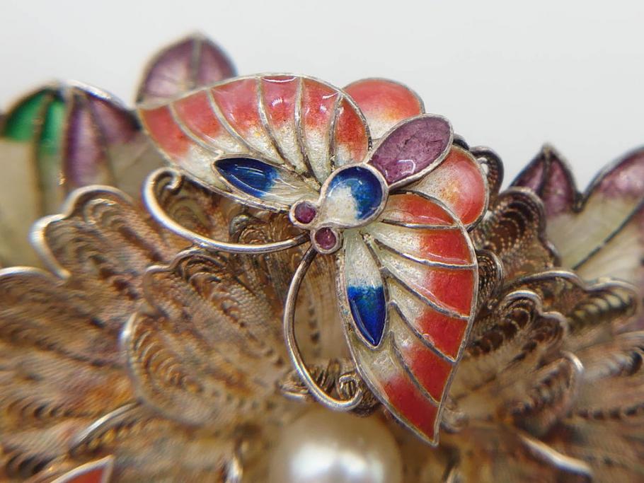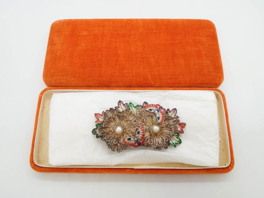 ラフジュ工房> 骨董・美術品 > 希少 アンティーク 金工 舞妓用 パール(真珠) 鮮やかな蝶と繊細な花の細工が目を引く豪華な帯留(ぽっちり、帯留め、着物道具、和装小物、アクセサリー、ブローチ、ケース付き)(R-078991)