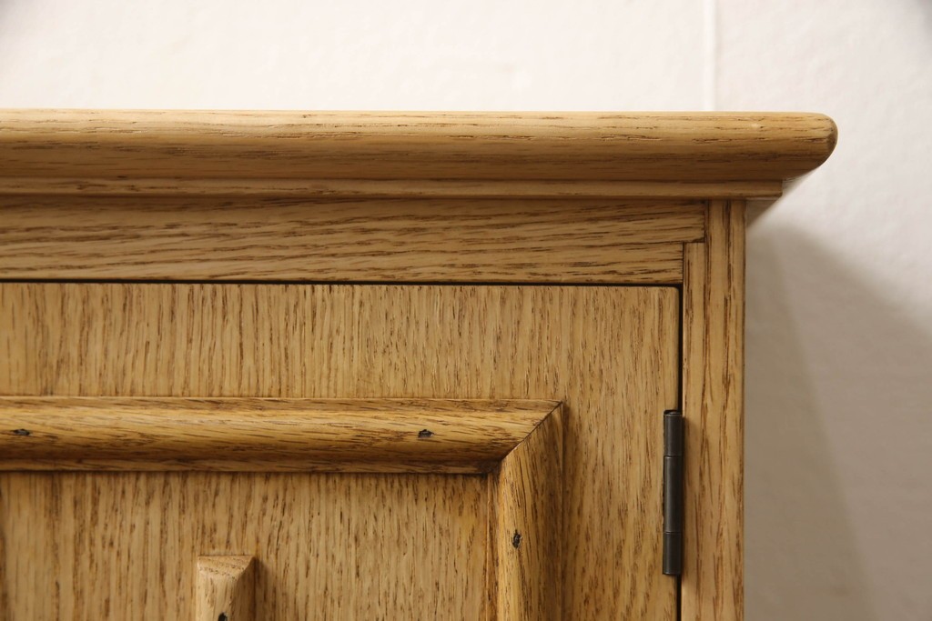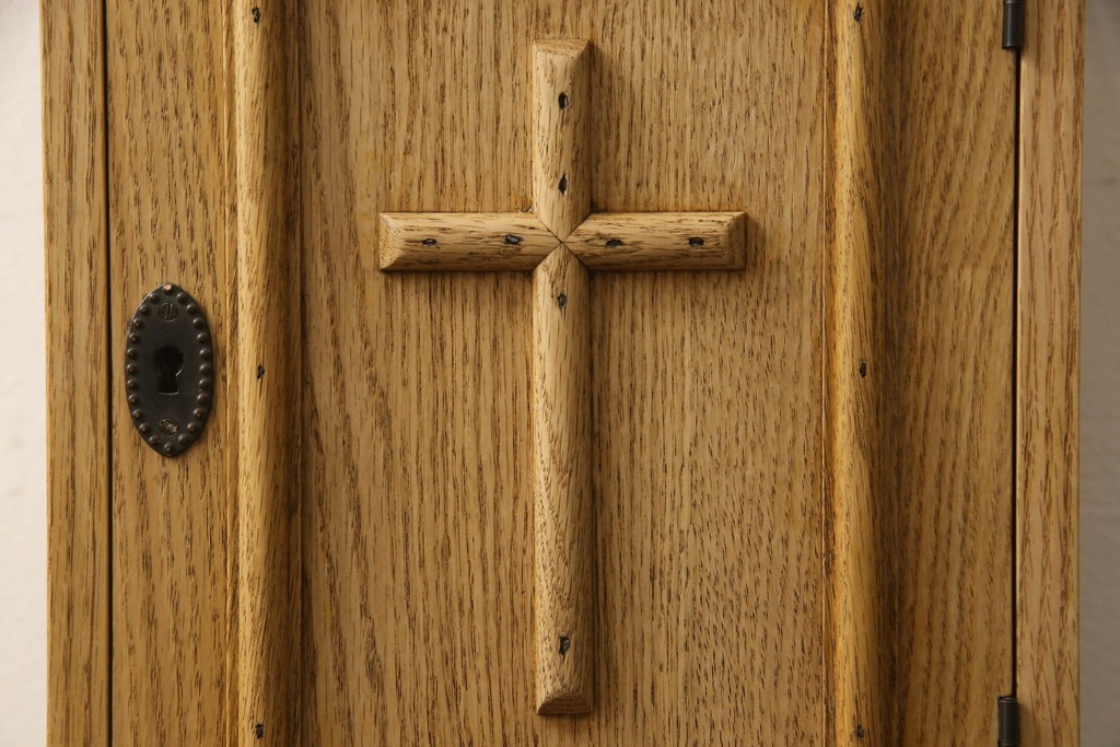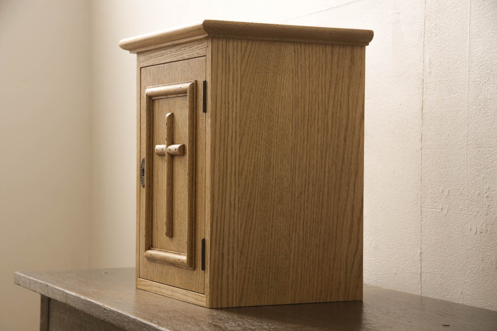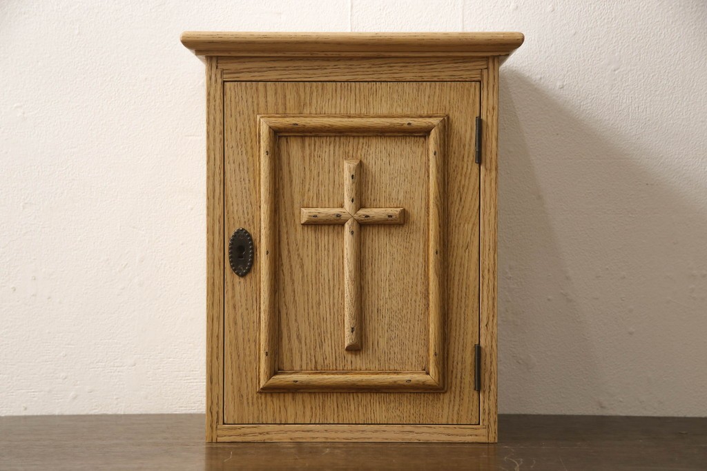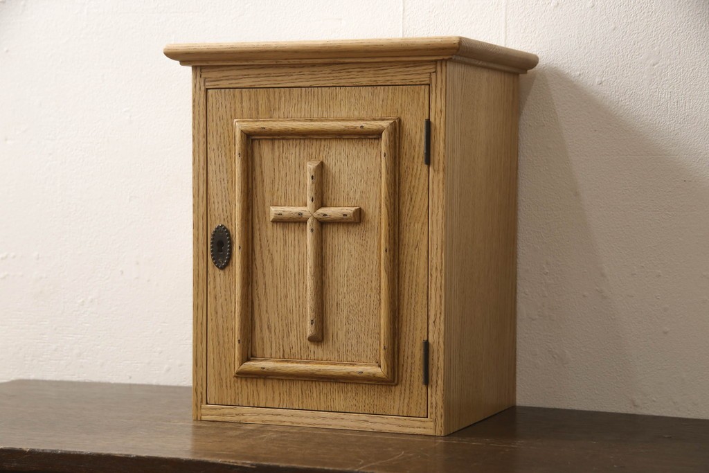 キャビネット・戸棚> サイドキャビネット > キャビネットを新規製作!オーク材を使用し、ご希望のサイズ、デザインにて製作。支給の鍵を取り付け、内部は棚板2枚の仕様。仕上げはアンティーク加工。(収納棚、戸棚、サイドボード)