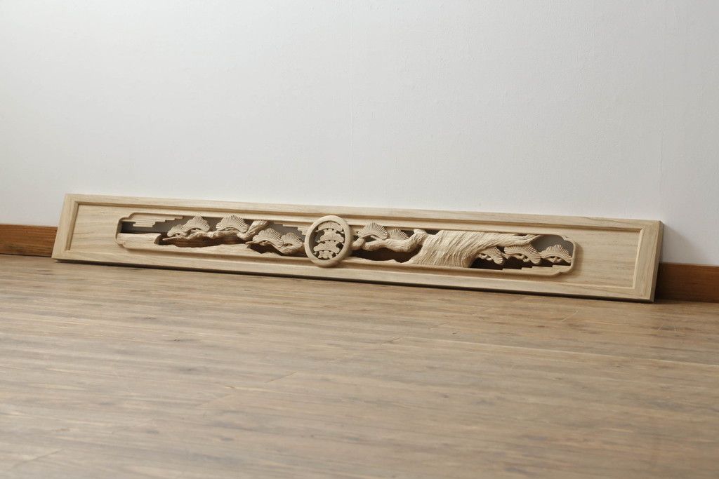 欄間を新規製作!ご希望のサイズで、デザインは中央に家紋、まわりに松の彫刻。色味は提供いただいた画像に近しい色味で着色。(明かり取り、明り取り、建具)
