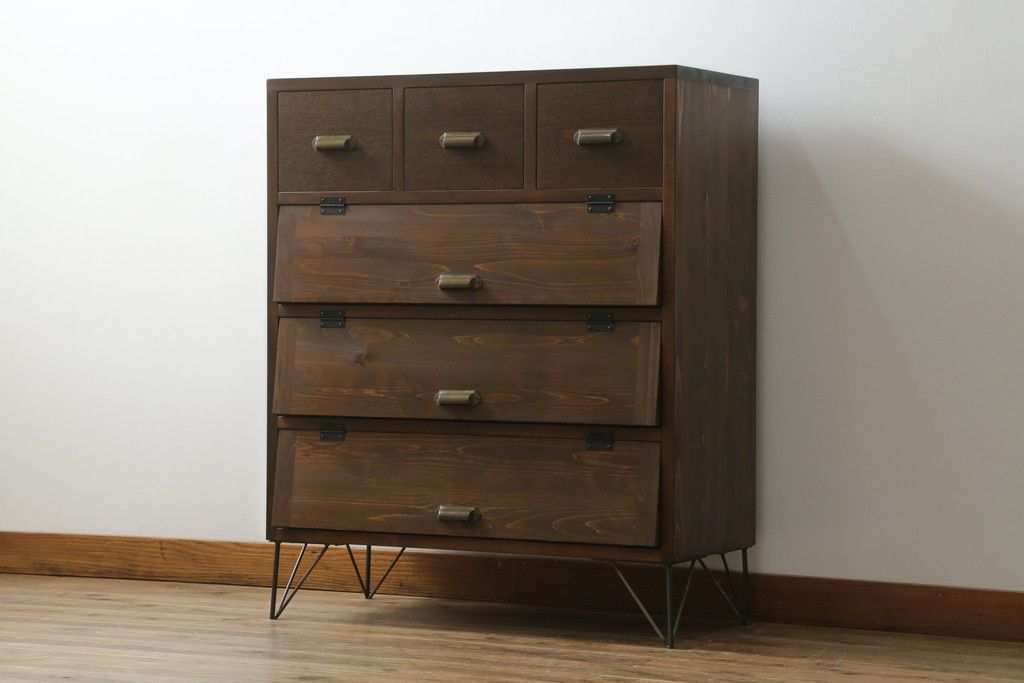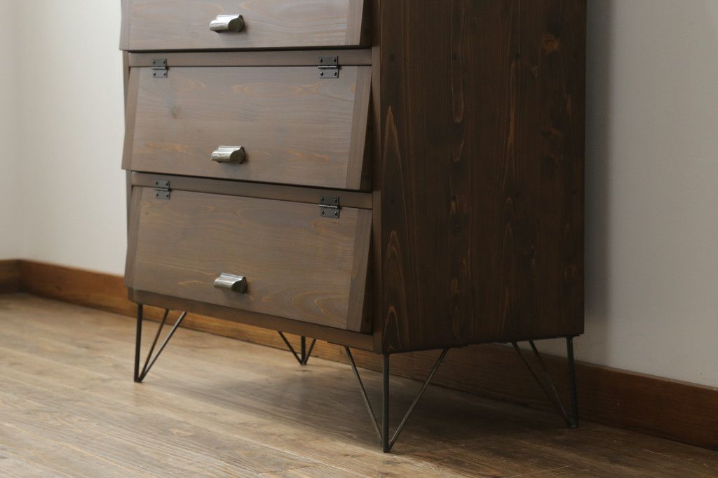 ワードローブ・ロッカー> ロッカー > パタパタ収納棚を新規製作!当店のオーダー家具を参考に、一番上に3杯の引き出し、パタパタ収納部は3段の仕様にて。(戸棚、キャビネット、サイドボード、ロッカー)
