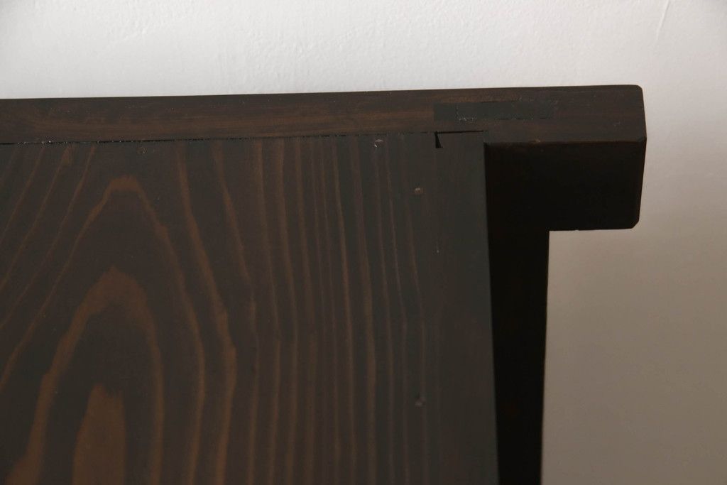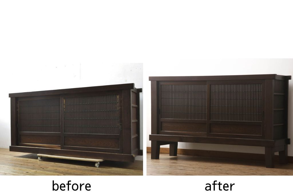 セミオーダー家具実績 > 水屋箪笥サイドボードをリペア&カスタム!前回購入いただいた脚とデザインの同じものを取り付け、棚内部は元からある棚を取り外し、中央で分割して新しく棚を取り付け。色味は現状の色味をベースに仕上げ。新規製作部分は本体に色合わせ。(収納棚、戸棚、キャビネット)