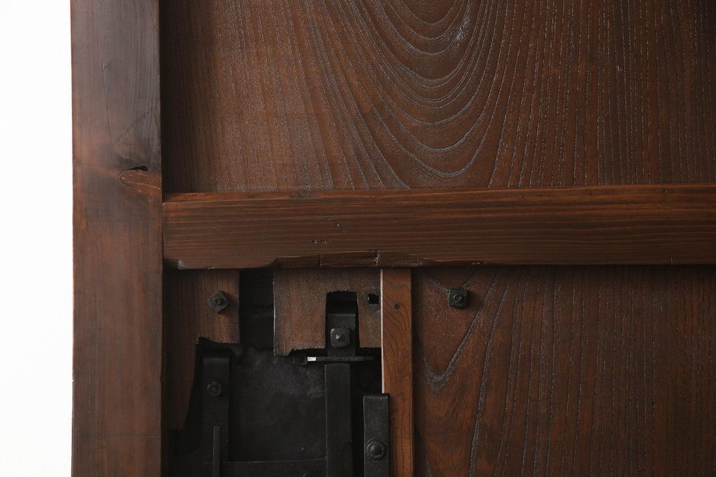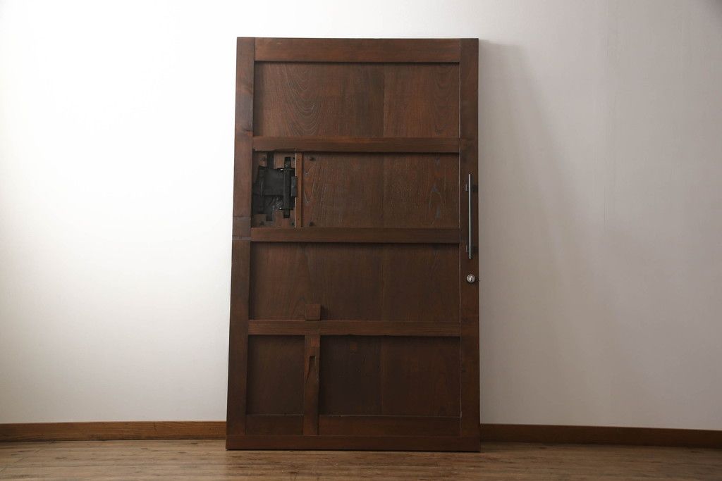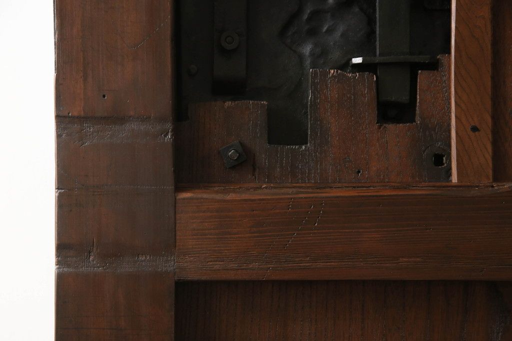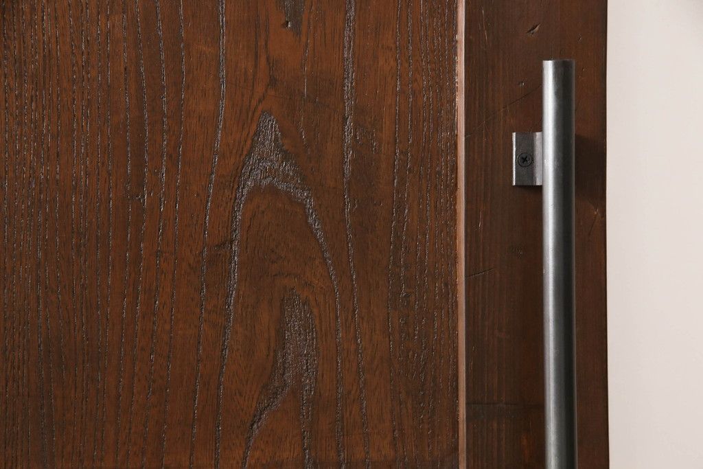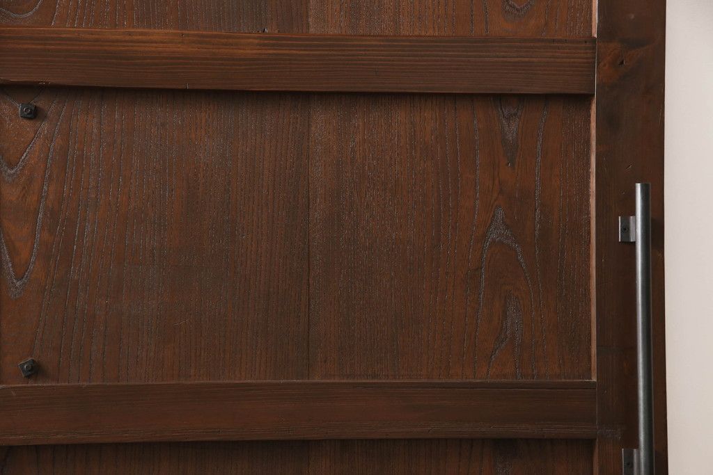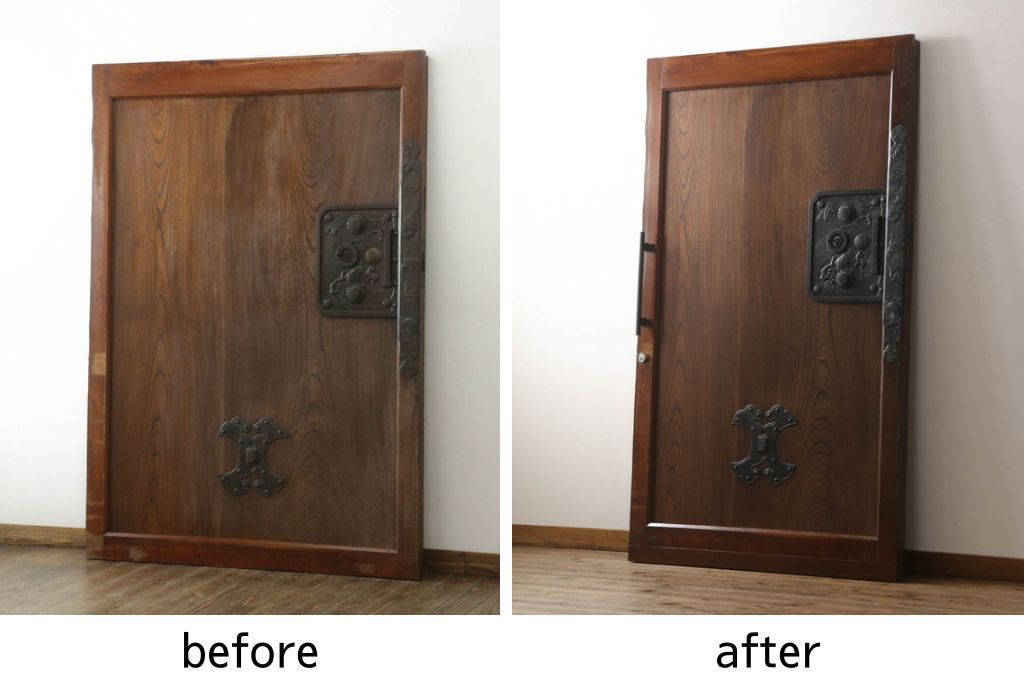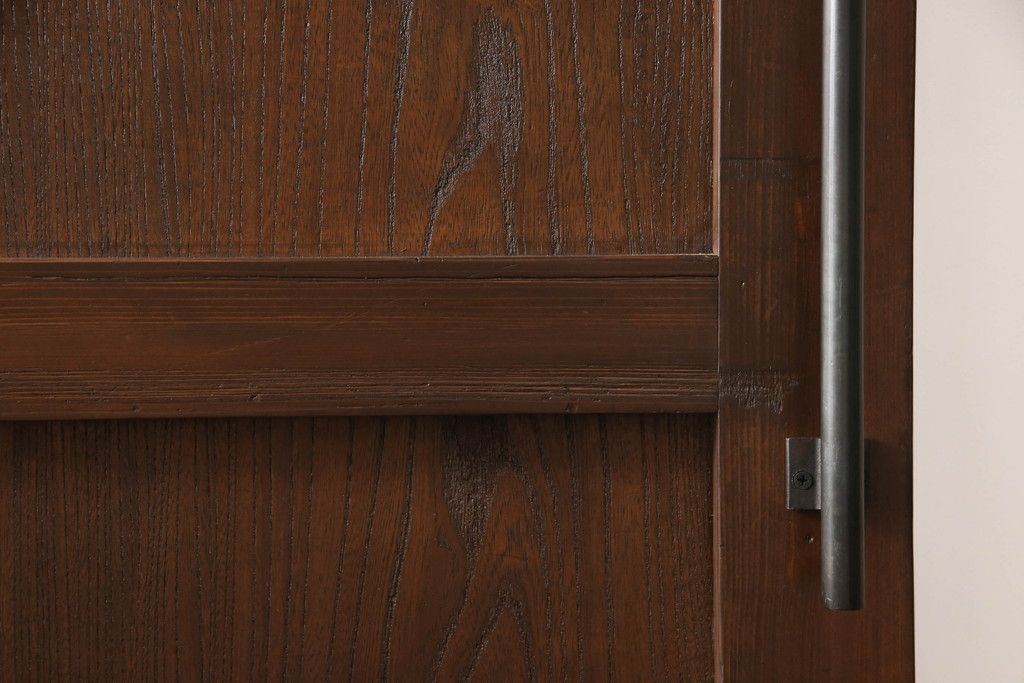 セミオーダー家具実績 > 蔵戸をリペア&カスタム!高さと幅をリサイズし、アイアン製のドアハンドルを取り付け。戸枠を製作し、蔵戸を戸枠に合わせた上下の加工。既存の色味を活かして着色。(引き戸、玄関戸、板戸)