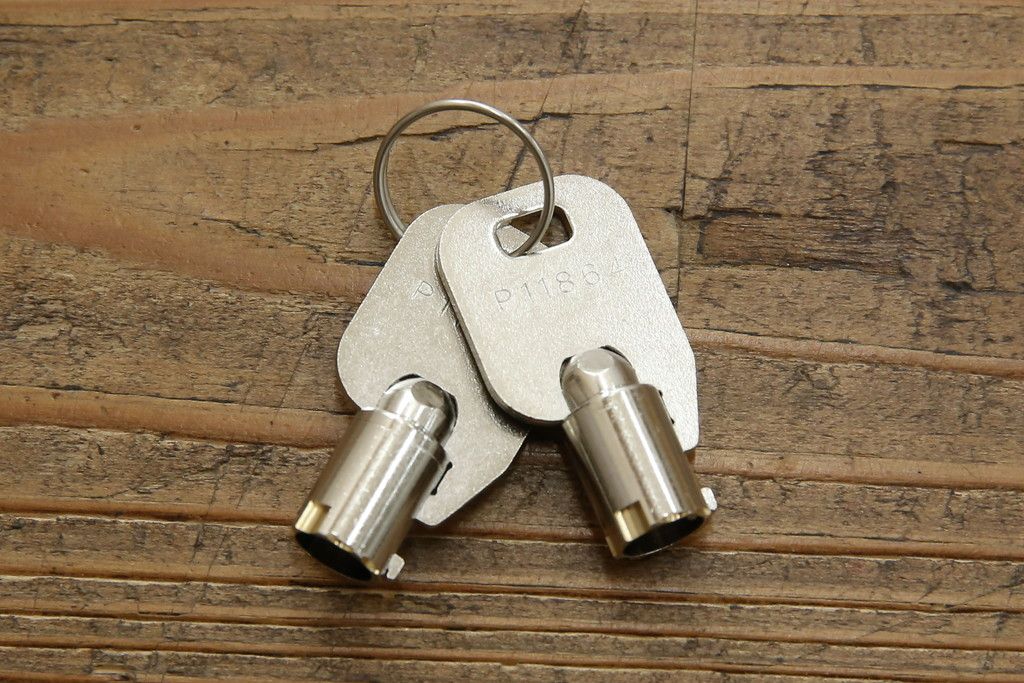 鍵は付属します。画像にありますように、袋に入れお付けします。スムーズに動くように調整していますが、あくまでも古いものや中古品ですので、長期の使用保証は出来かねます。ご購入後、鍵に不具合が発生した場合は、当店でサポートさせていただきますので、お気軽にご相談くださいませ。