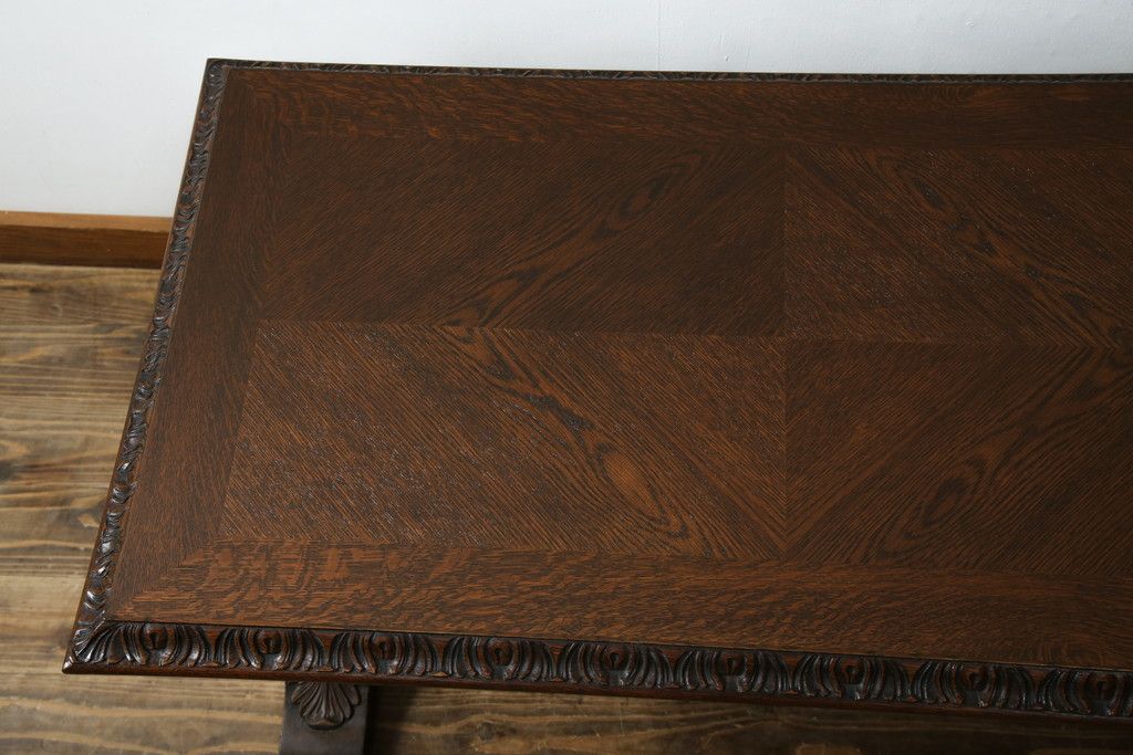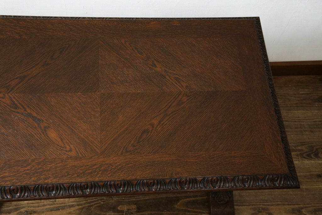 イギリスアンティーク 高級品!! オーク材 パ-ケットリー(象嵌)天板とバルボスレッグが目を引くセンターテーブル(ローテーブル、リビングテーブル、コーヒーテーブル、英国)(R-080749)です。