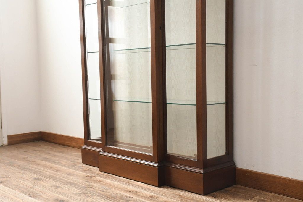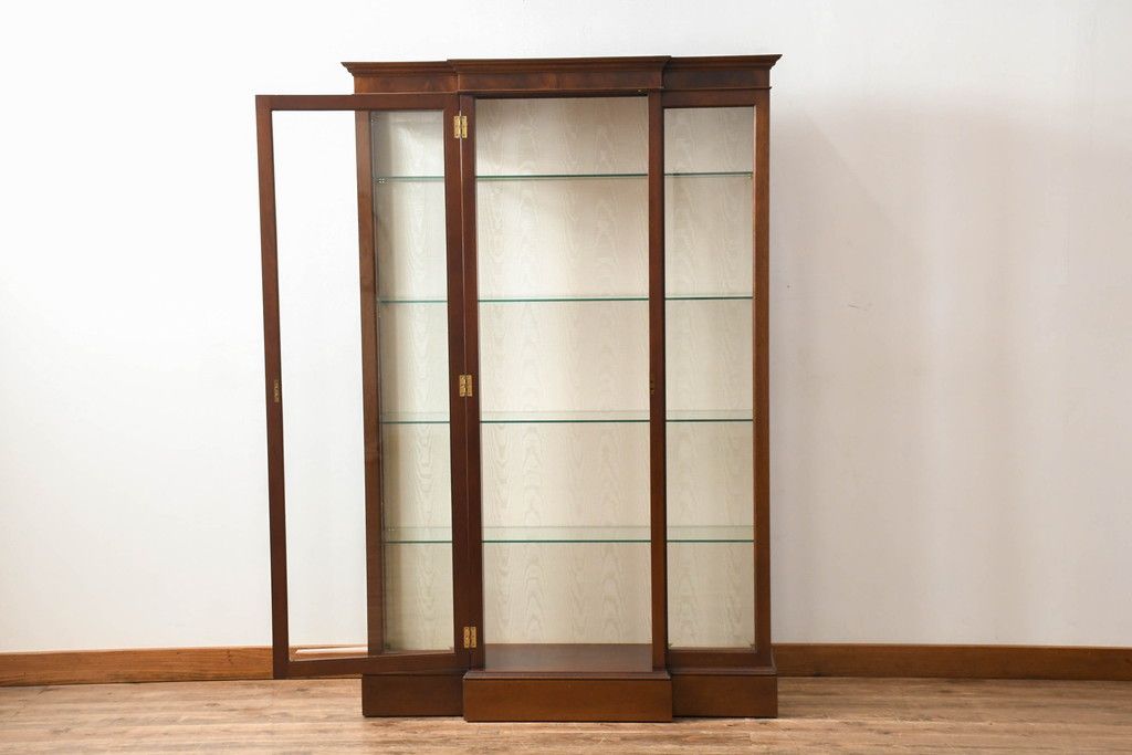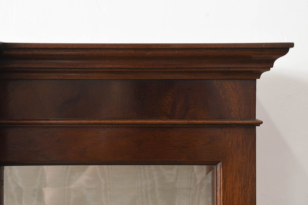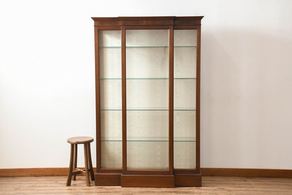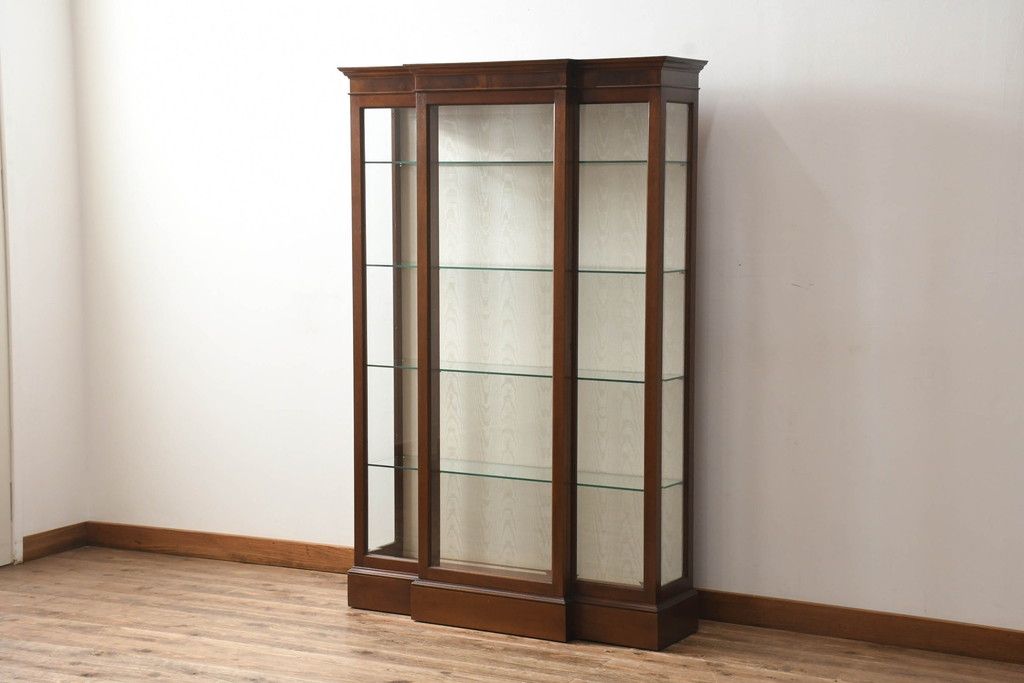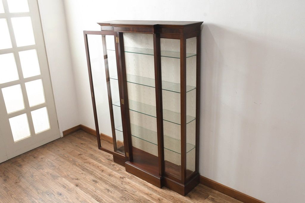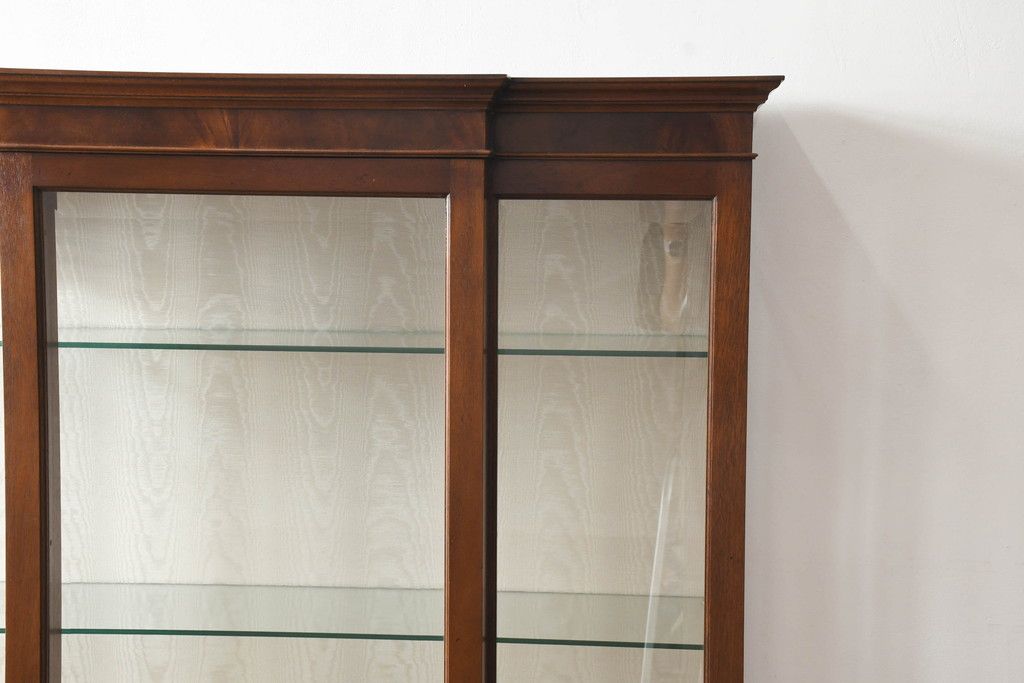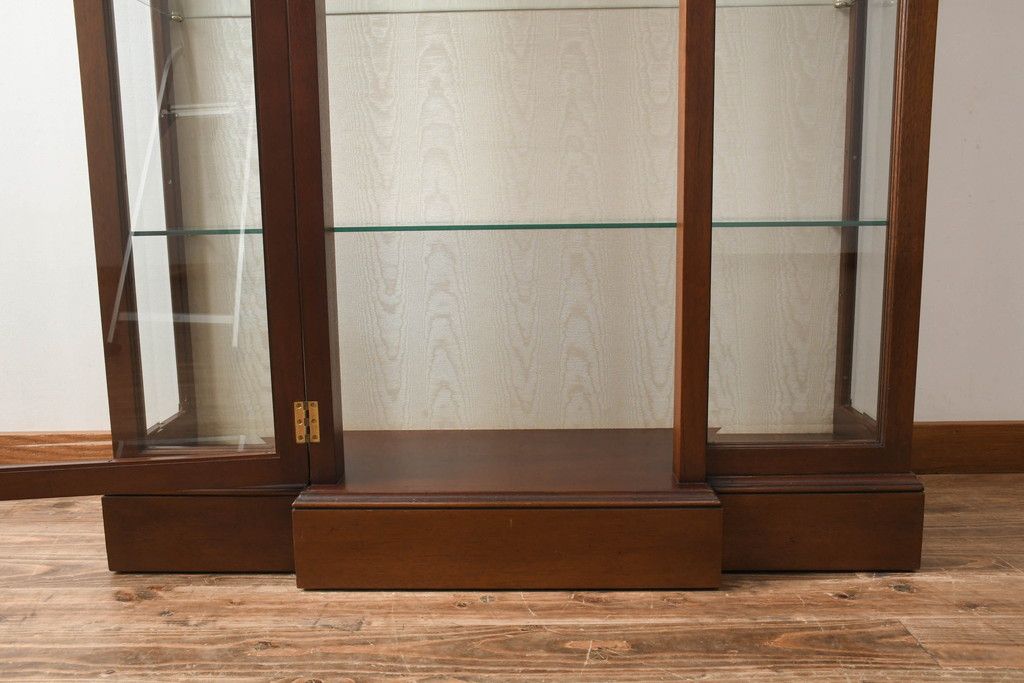店舗什器 > イギリスビンテージ 美品 高品質の手作り品!! Archer&Smith(アーチャー&スミス) マホガニー材 エレガントなデザインが美しい照明付きの三面ガラスキャビネット(キュリオケース、ガラスケース、ショーケース、コレクションケース、ディスプレイケース、飾り棚、陳列棚、戸棚、収納棚、店舗什器、英国、ヴィンテージ)(R-081245)