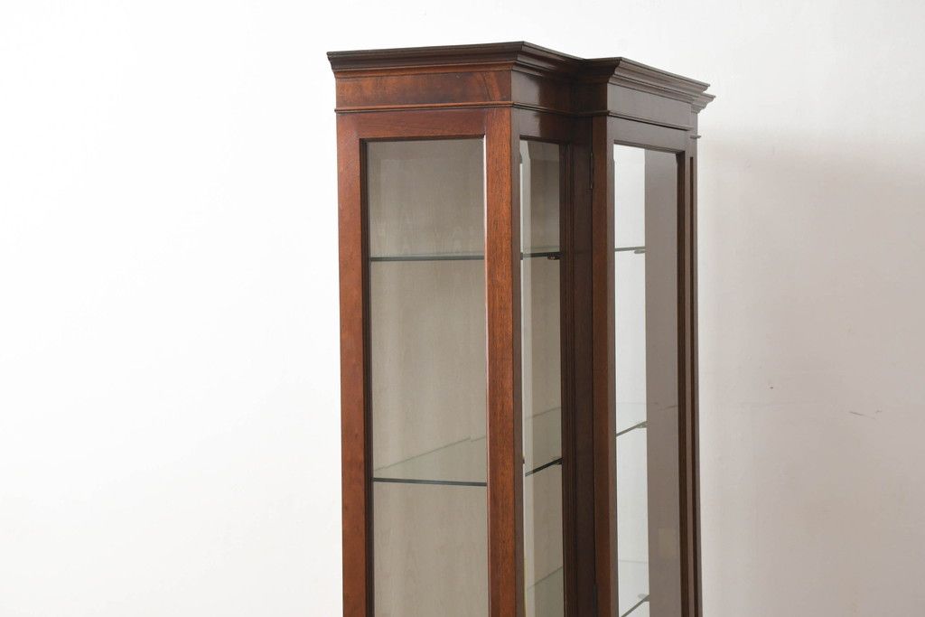 ガラスケース・ショーケース> コレクションケース > イギリスビンテージ 美品 高品質の手作り品!! Archer&Smith(アーチャー&スミス) マホガニー材 エレガントなデザインが美しい照明付きの三面ガラスキャビネット(キュリオケース、ガラスケース、ショーケース、コレクションケース、ディスプレイケース、飾り棚、陳列棚、戸棚、収納棚、店舗什器、英国、ヴィンテージ)(R-081245)