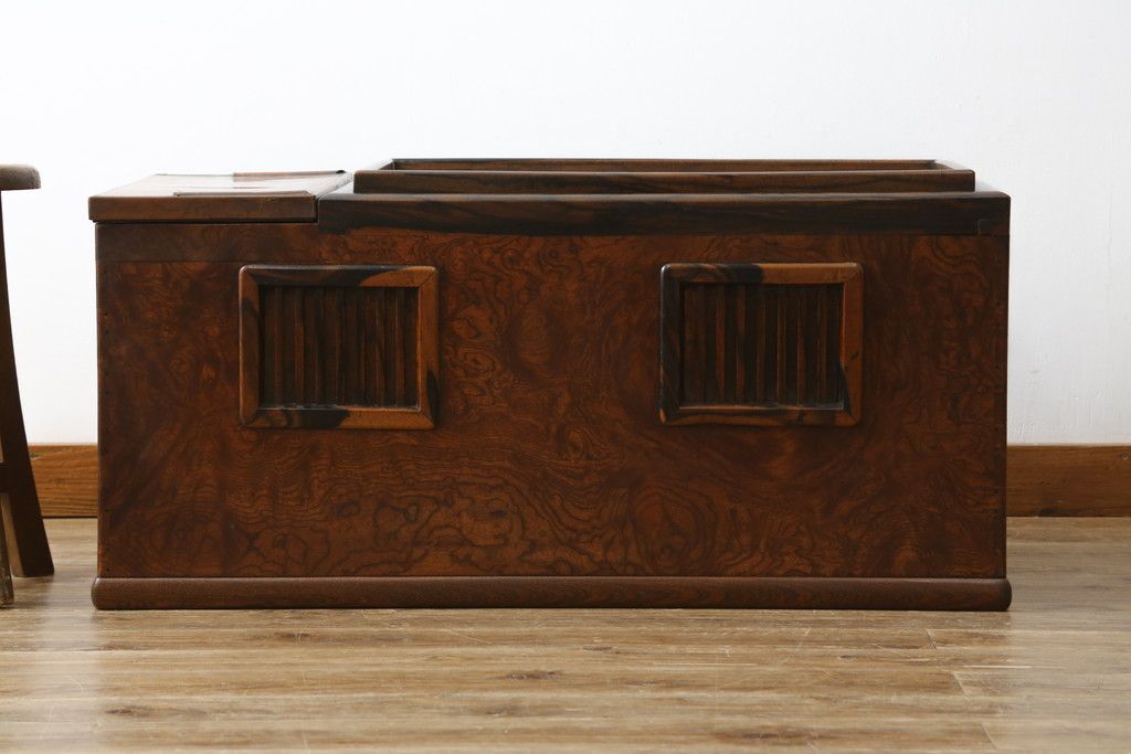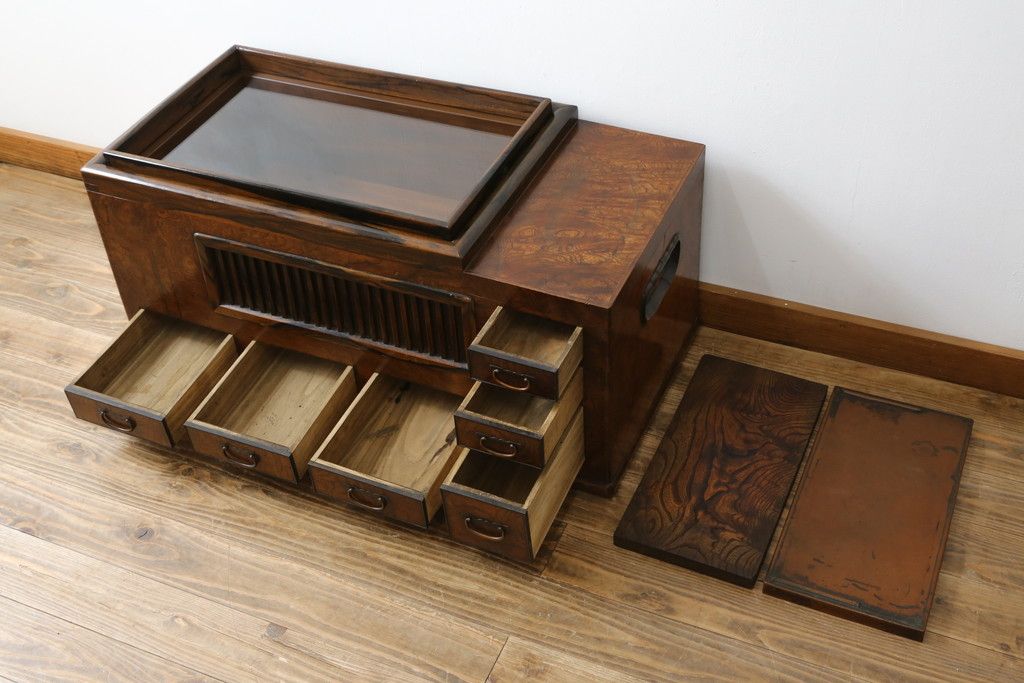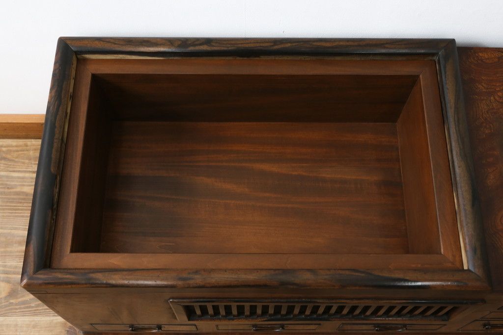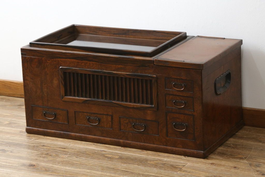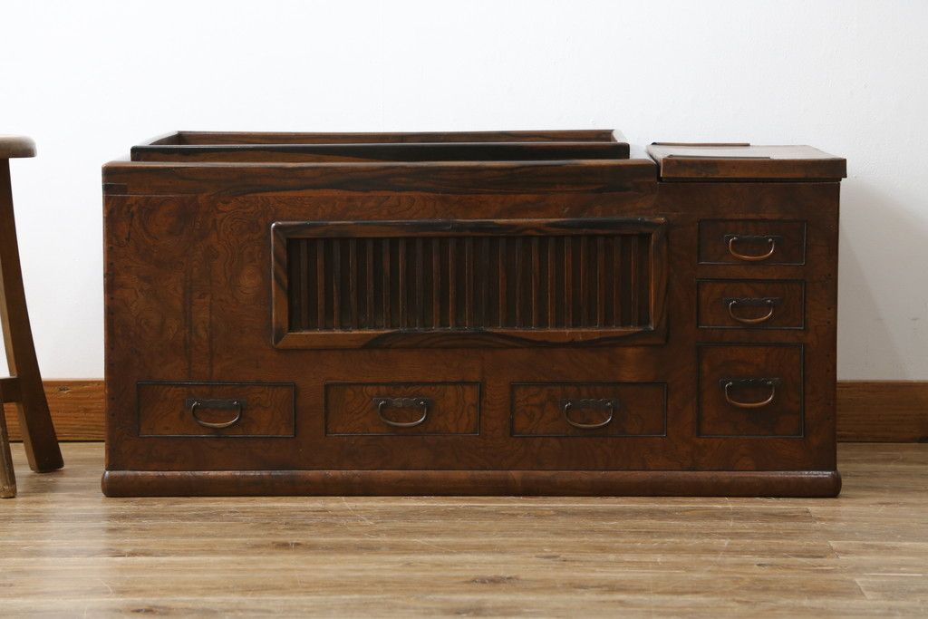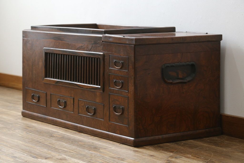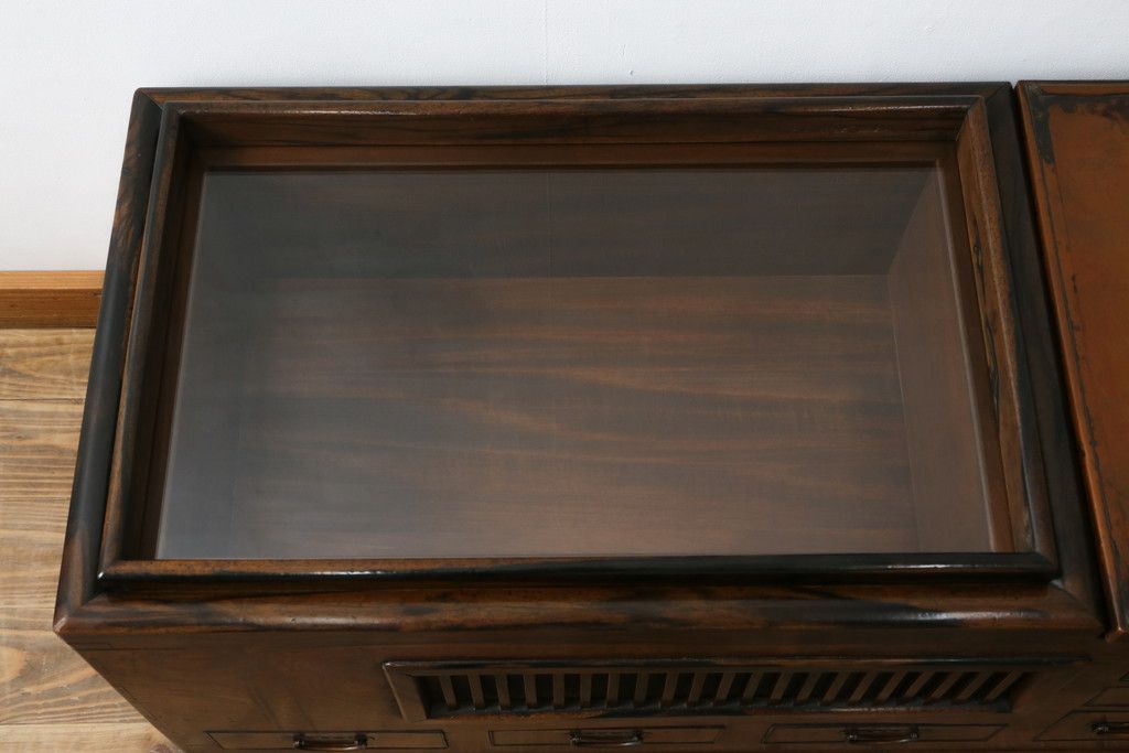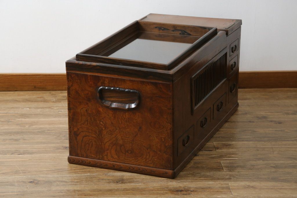 長火鉢をリメイク!内側を板張りし、ガラス天板を取り付け、欠損箇所に取っ手を取り付け。