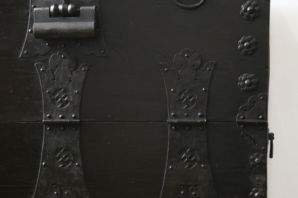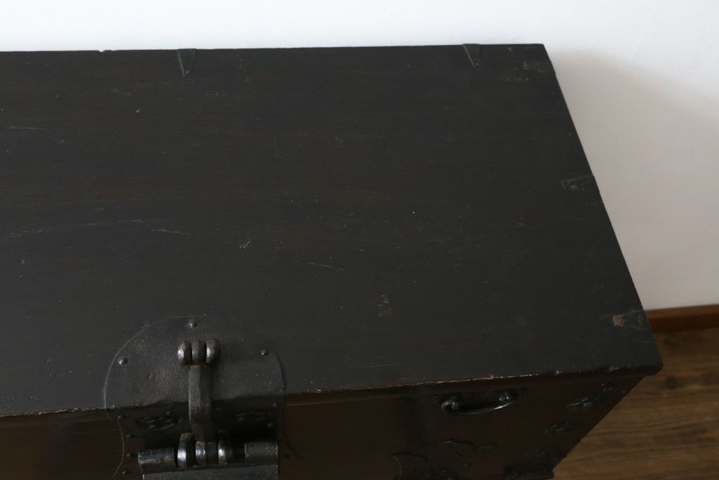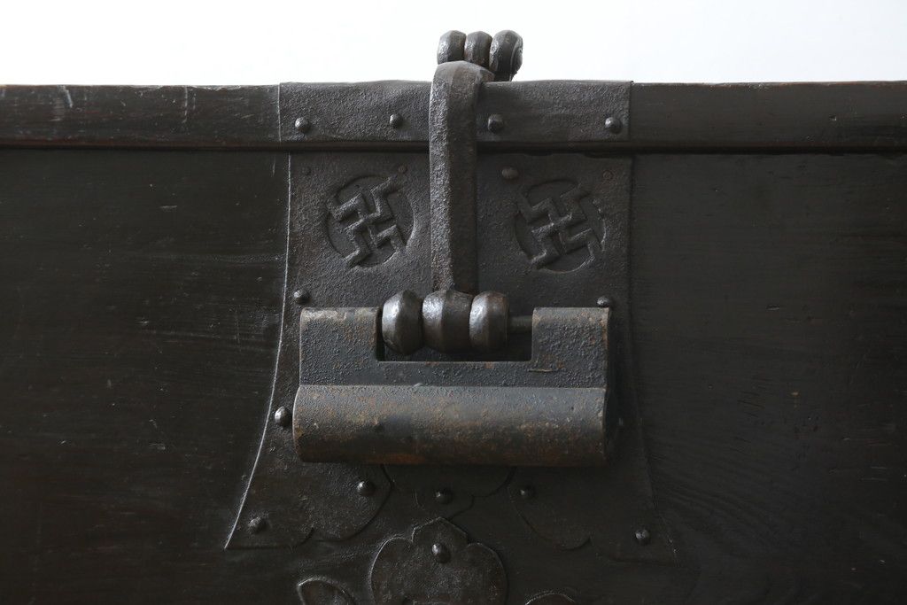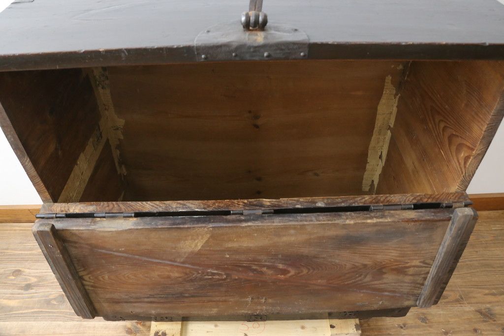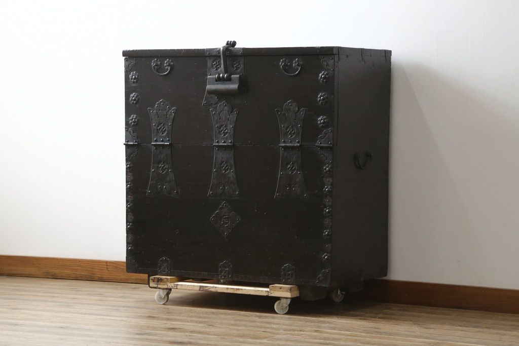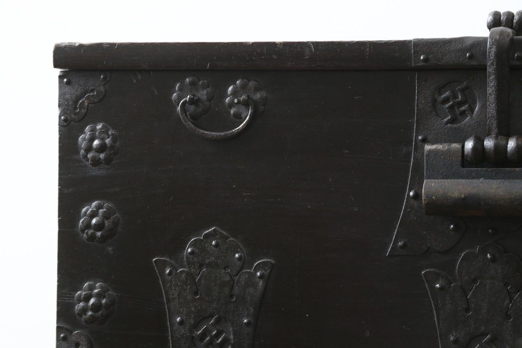 和箪笥 > 和製アンティーク 松材 重厚感のある金具が目を惹くバンダチ(バンダジ、半閉櫃、李朝箪笥、時代箪笥、収納箪笥、サイドボード)(R-082197)