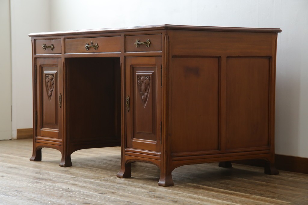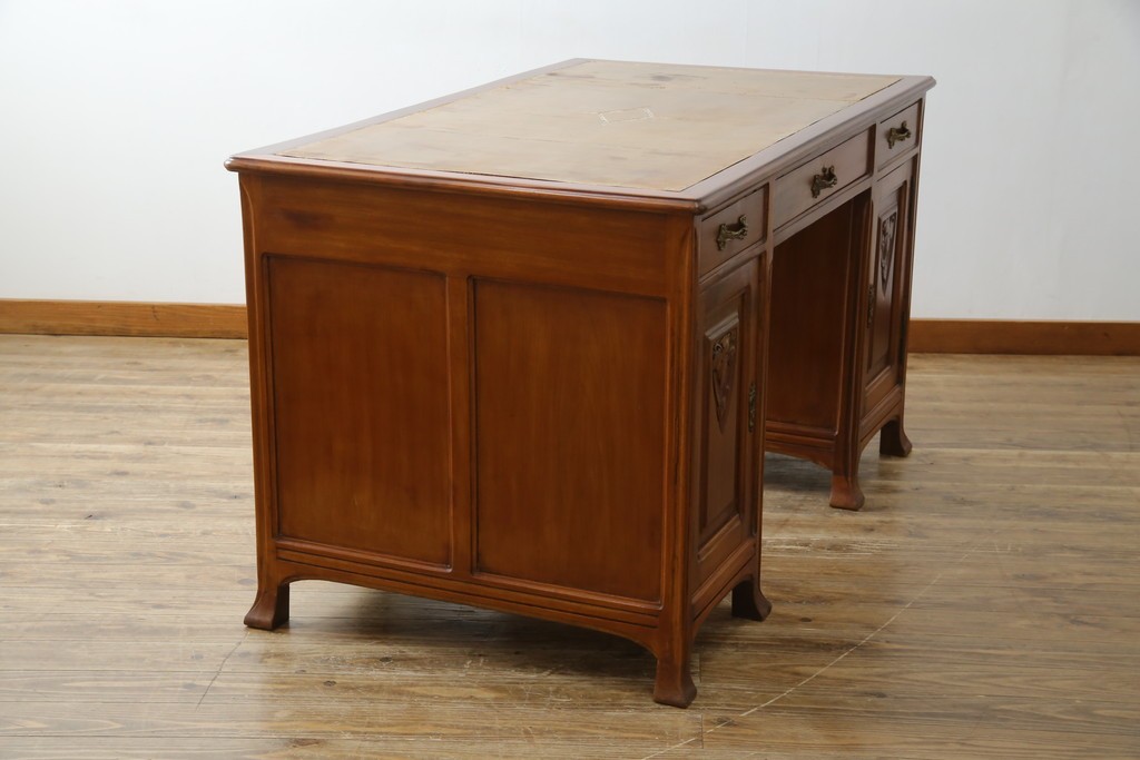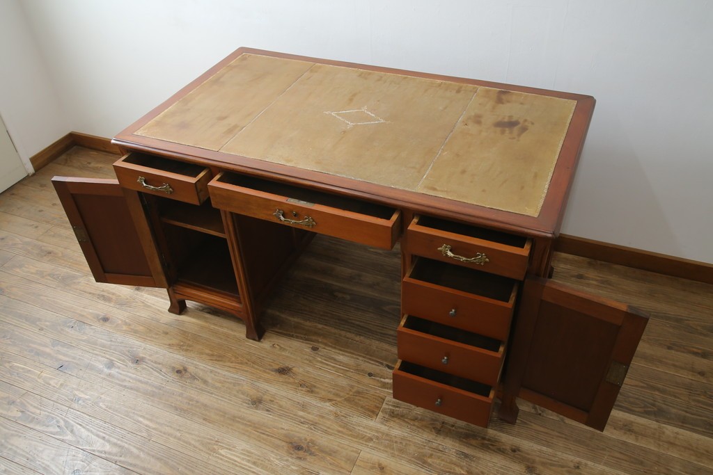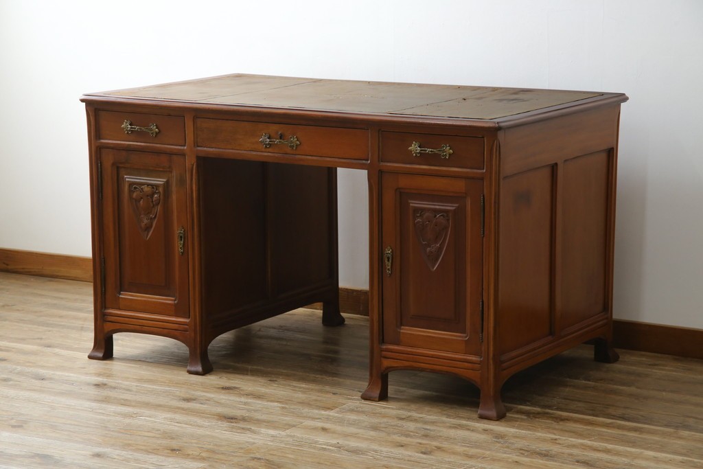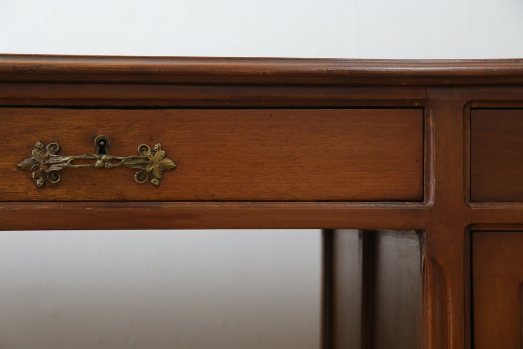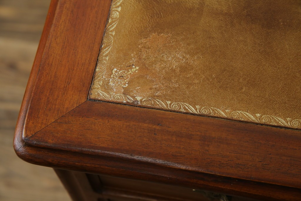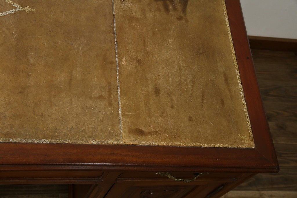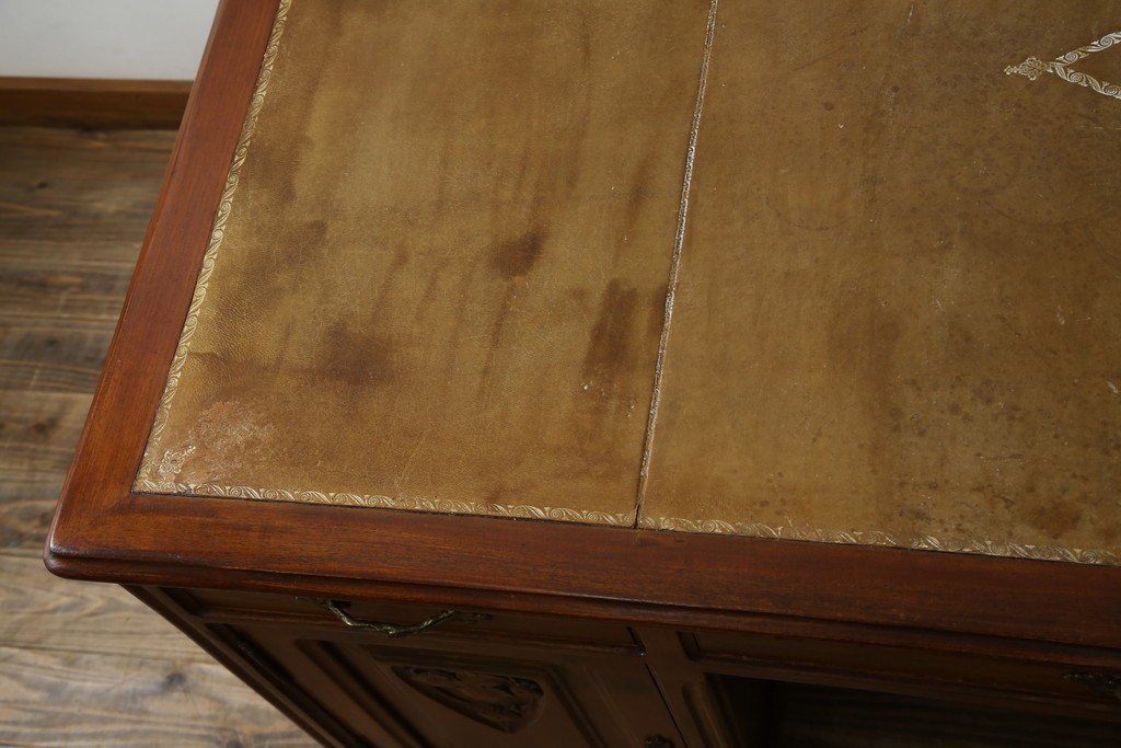 デスク> 片袖机・両袖机 > 海外アンティーク チーク材 レザートップ 両面使い 繊細な彫刻が美しいパートナーデスク(両袖机、作業台、ワークテーブル、ワークデスク、在宅ワーク、在宅用)(R-082324)