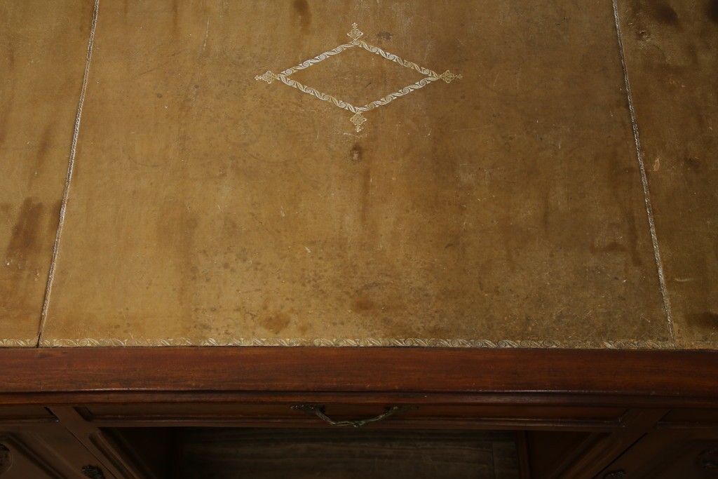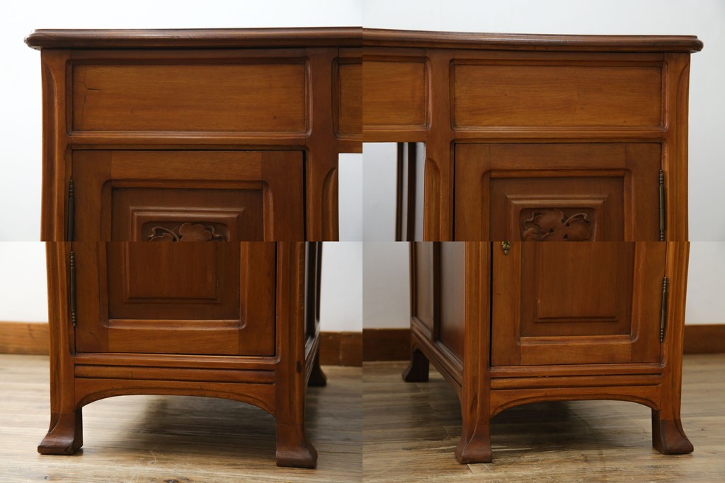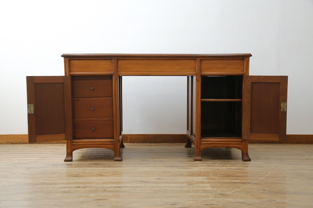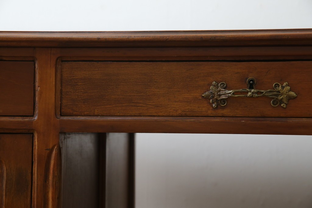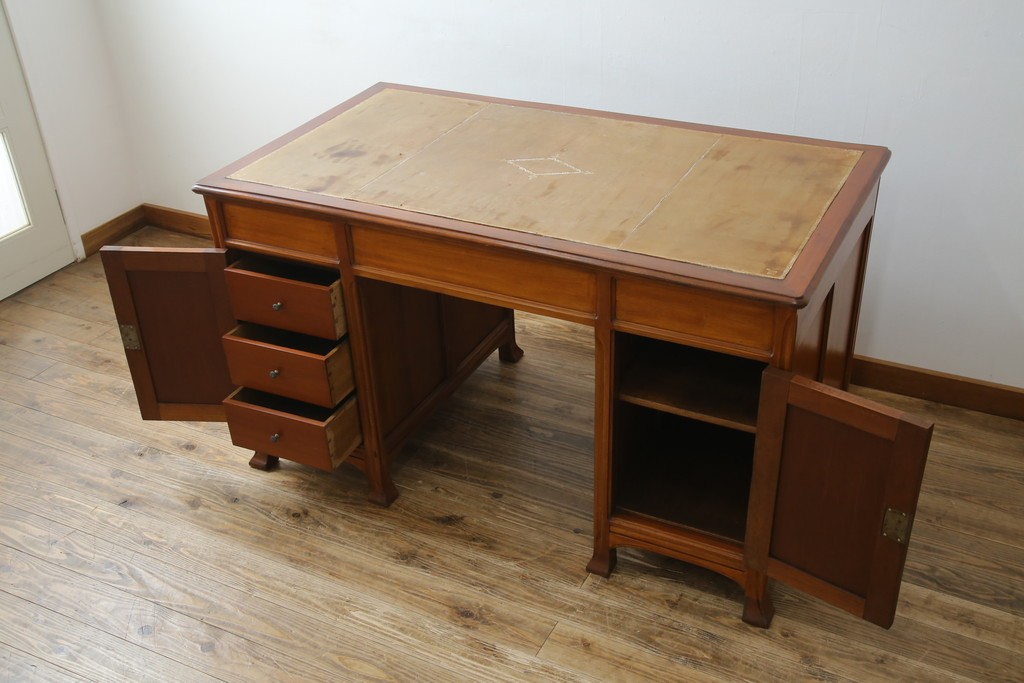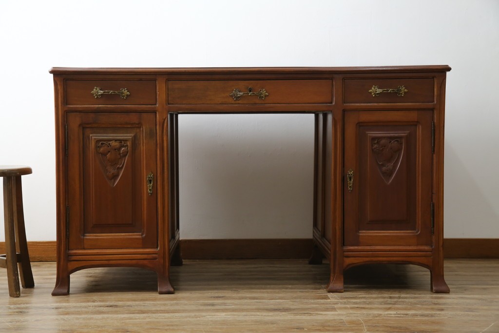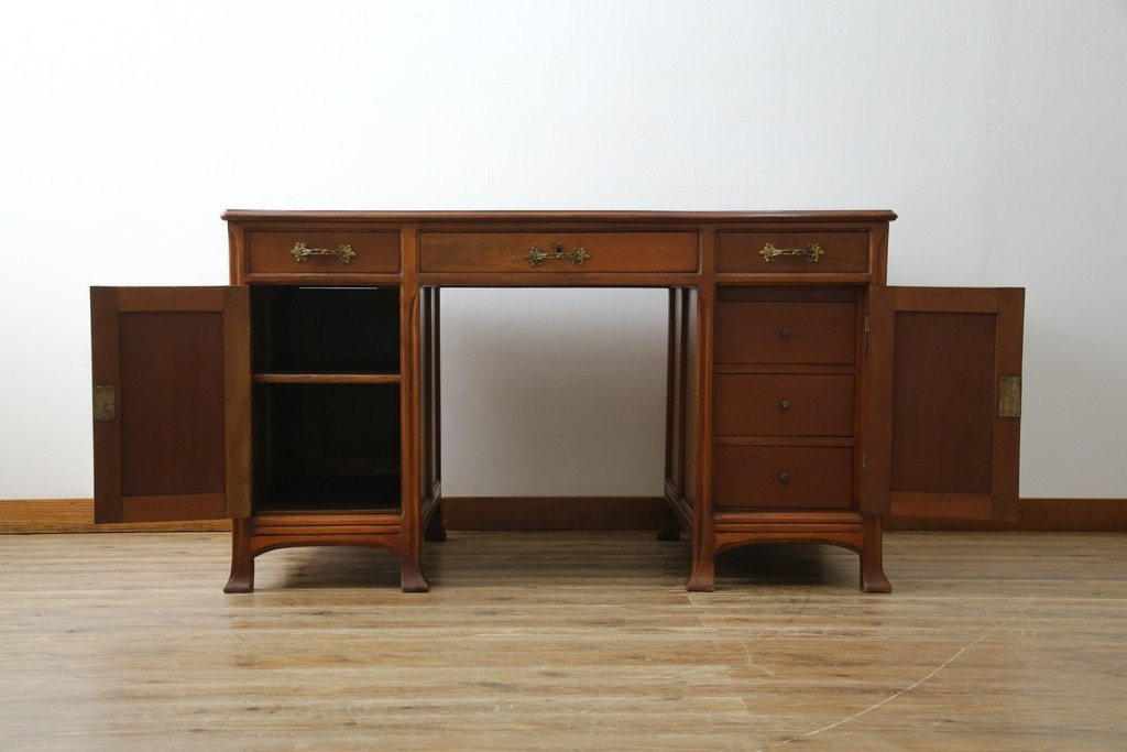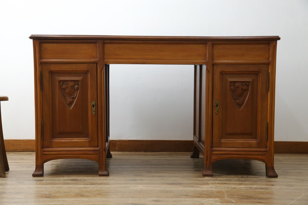デスク> 片袖机・両袖机 > 海外アンティーク チーク材 レザートップ 両面使い 繊細な彫刻が美しいパートナーデスク(両袖机、作業台、ワークテーブル、ワークデスク、在宅ワーク、在宅用)(R-082324)