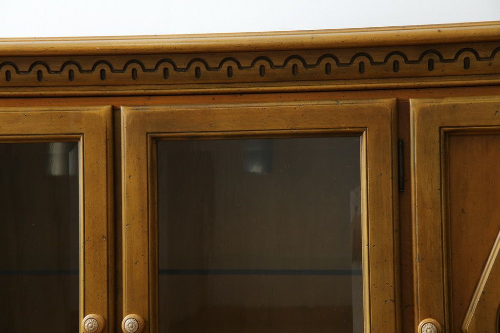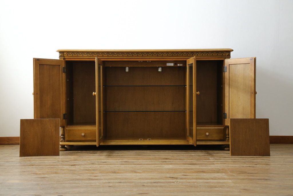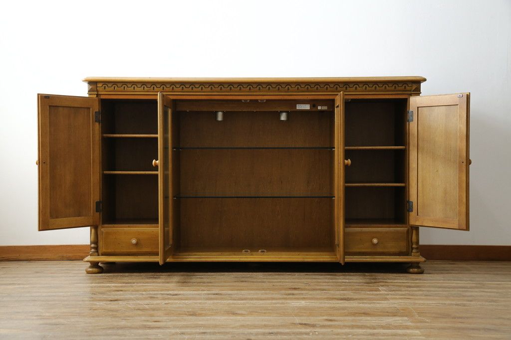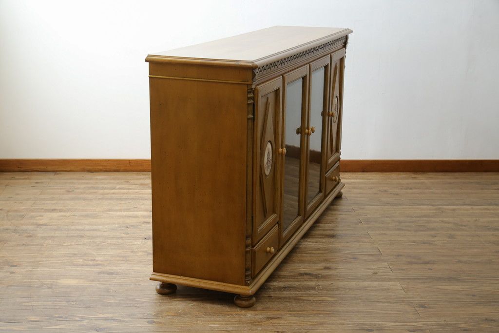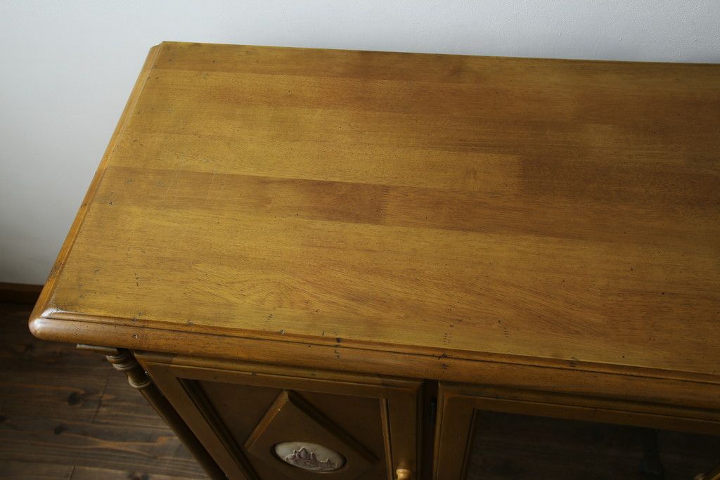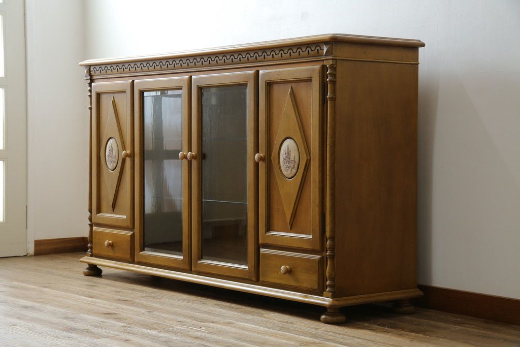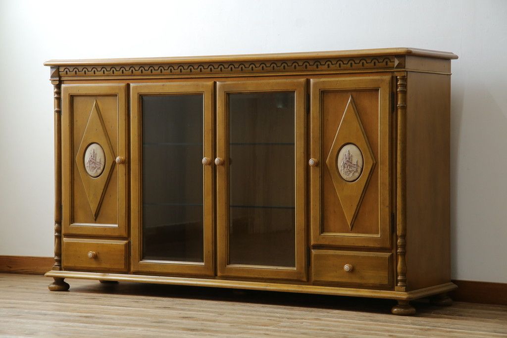 中古 美品 カリモク家具(karimoku) 可愛い脚と陶板がアクセントのアンティーク調カントリーキャビネット(サイドボード、サイドキャビネット、収納棚、戸棚)(R-082615)