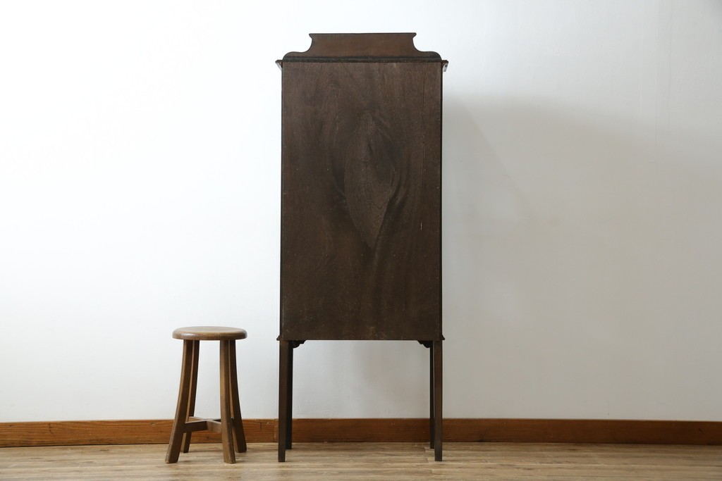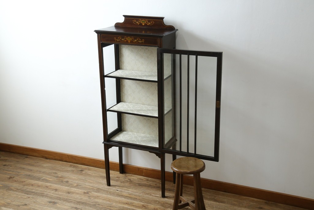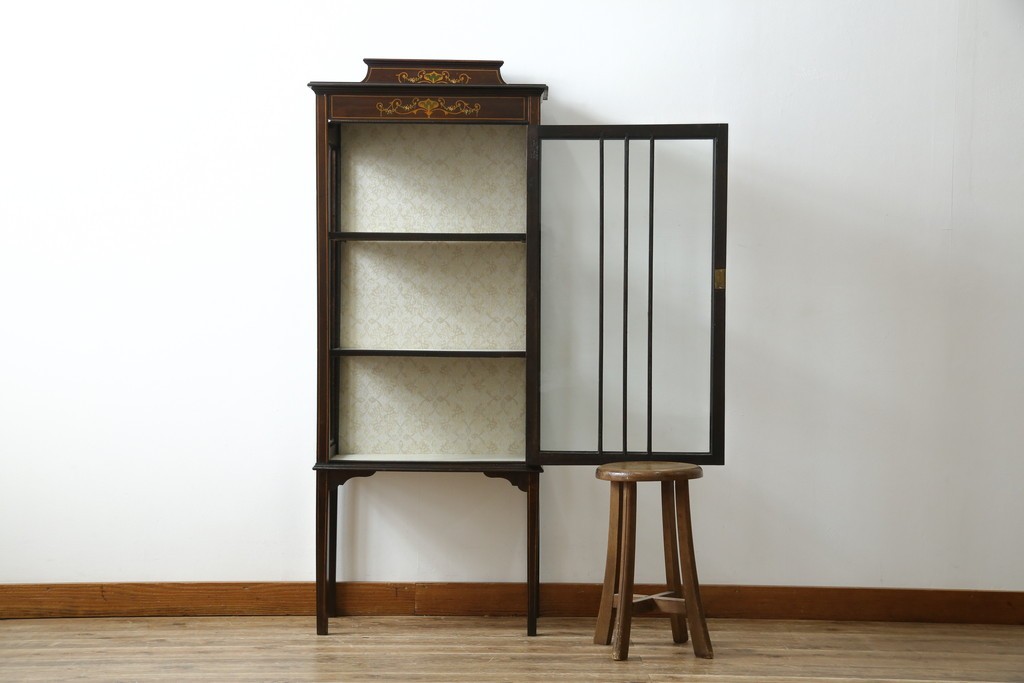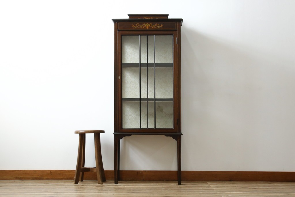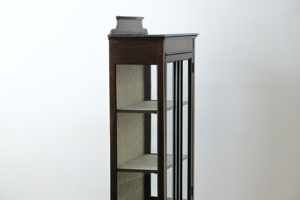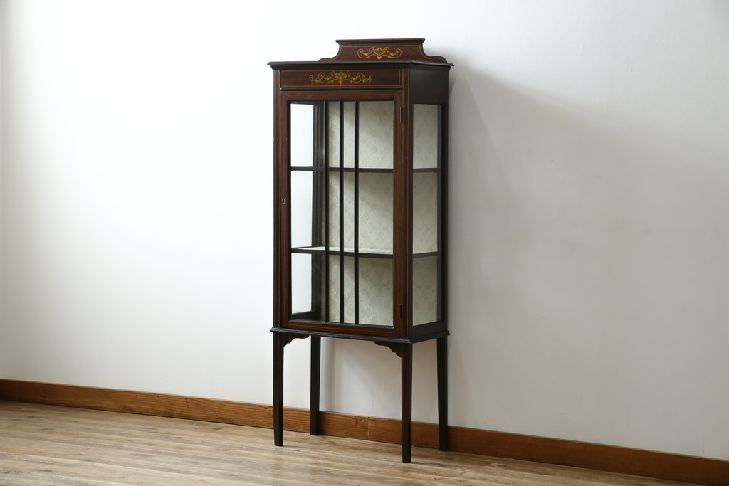 ガラスケース・ショーケース> コレクションケース > イギリスアンティーク 希少サイズ 小振りな象嵌入り!上品な雰囲気を醸し出す縦型キャビネット(キュリオケース、ガラスケース)(R-083010)