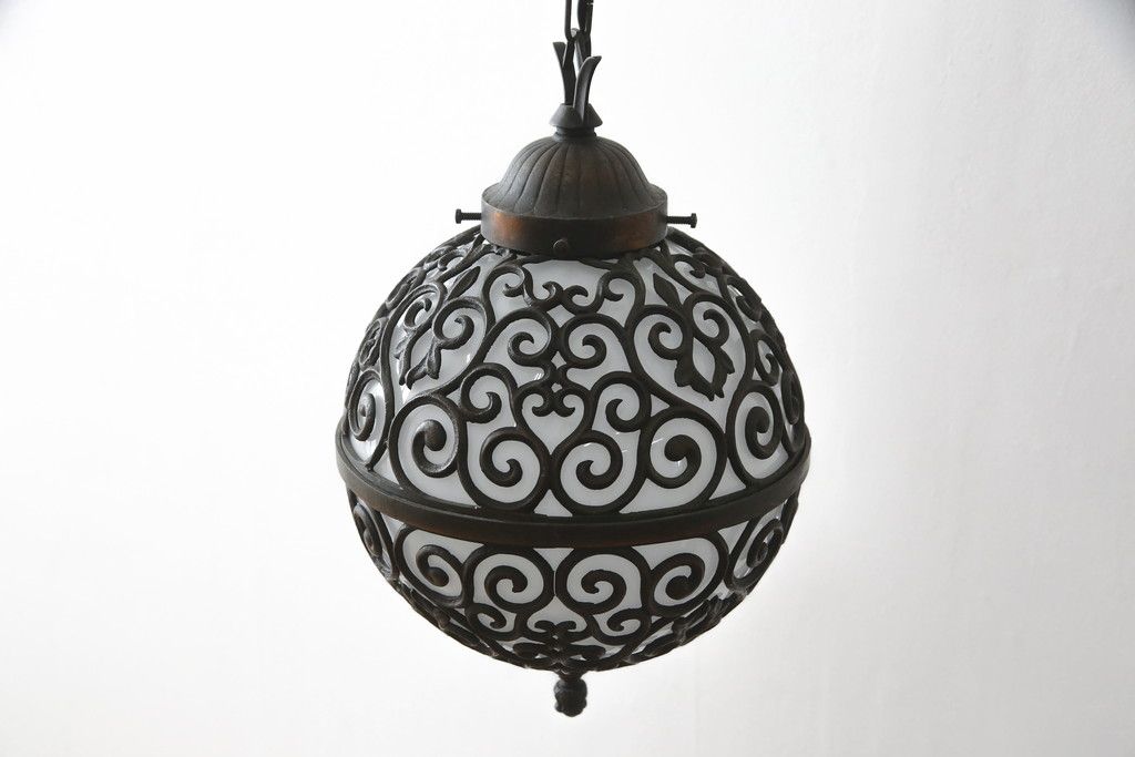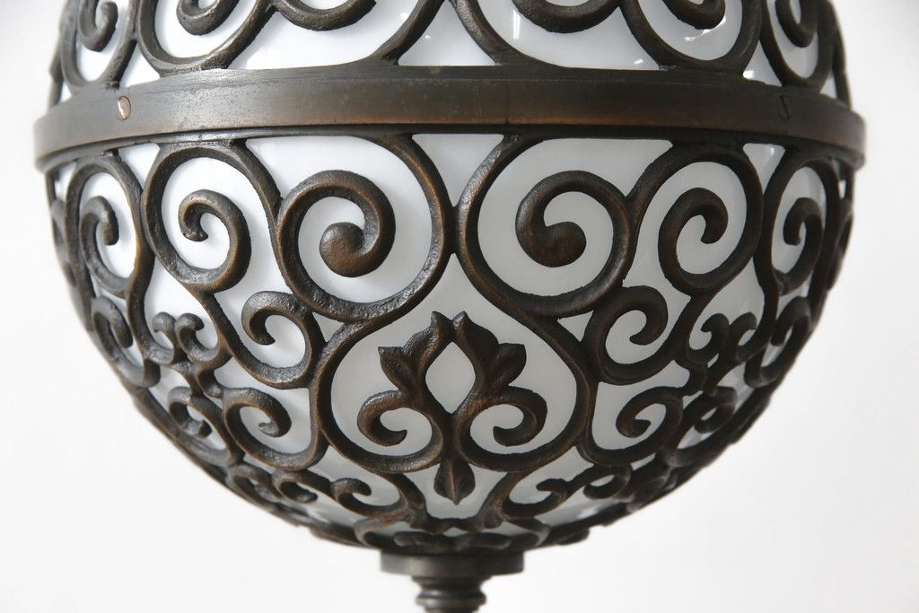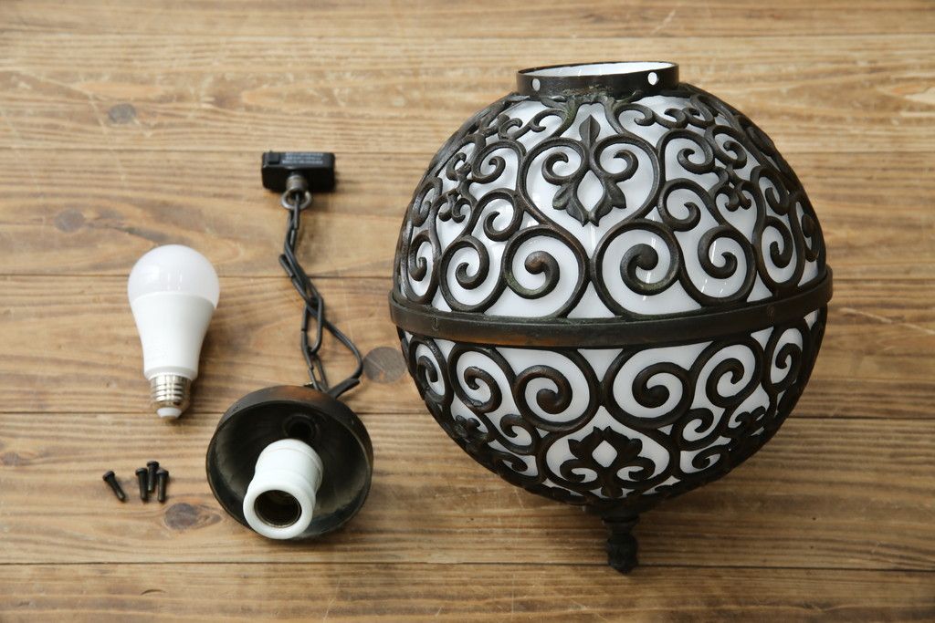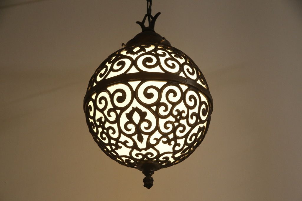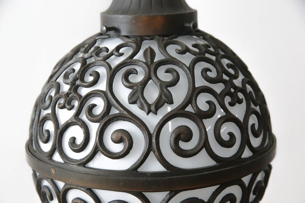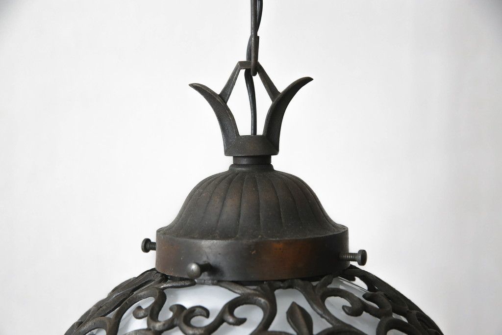 和製アンティーク 唐草透かしの装飾が魅力的な銅製のペンダントライト(天井照明、吊り下げ照明)(R-083059)